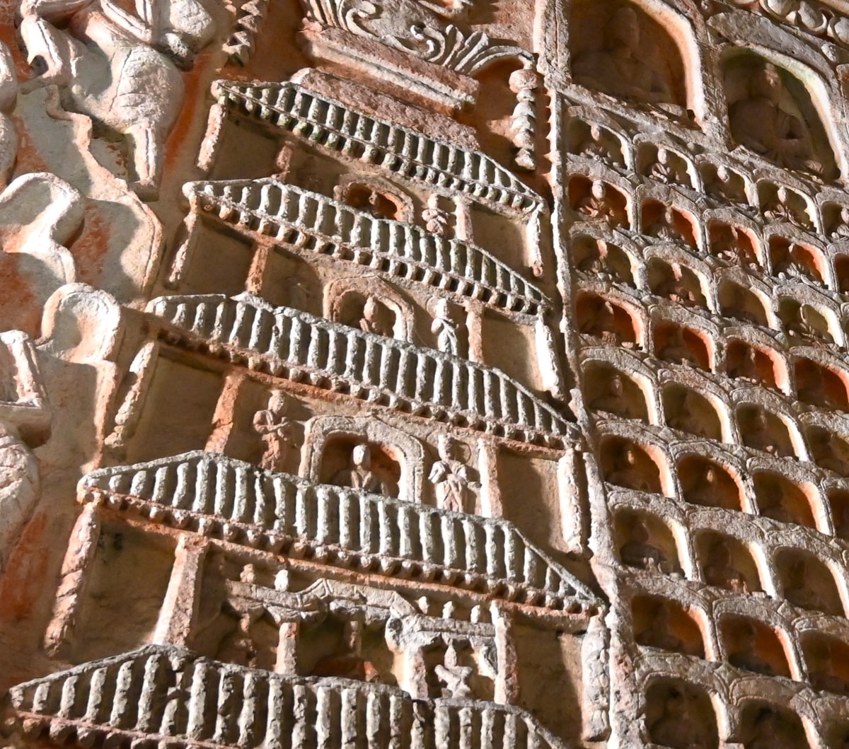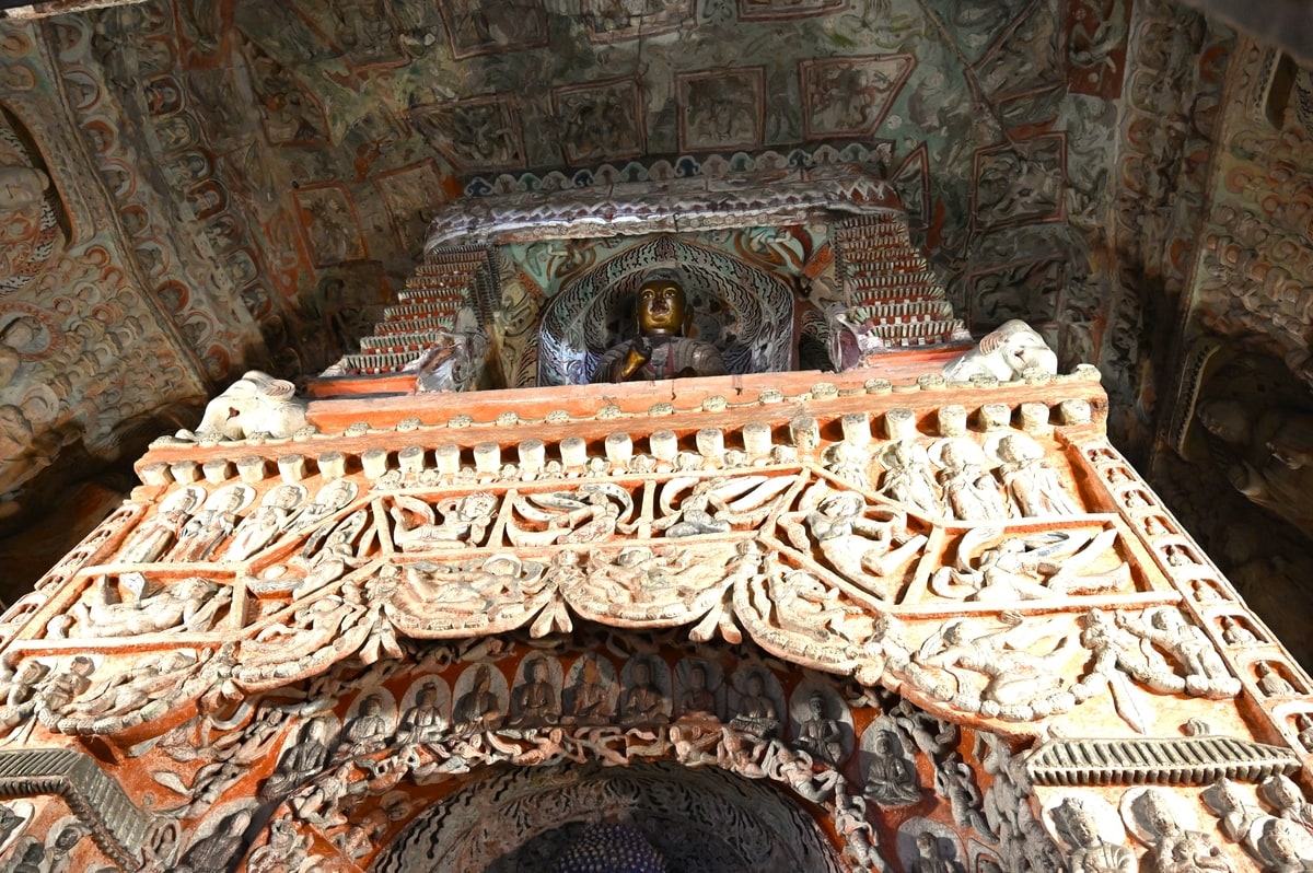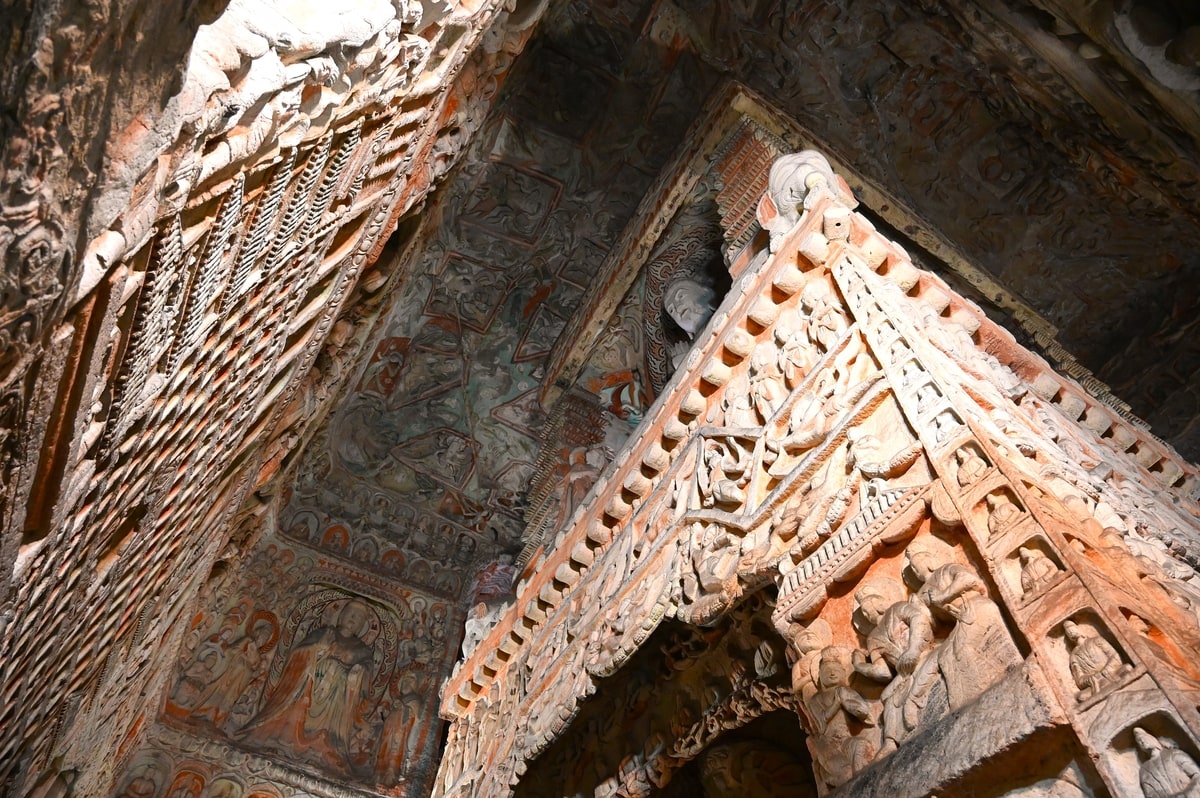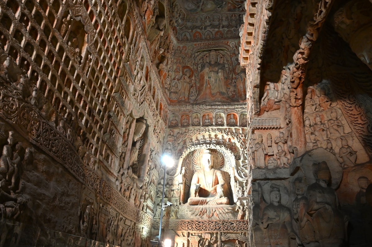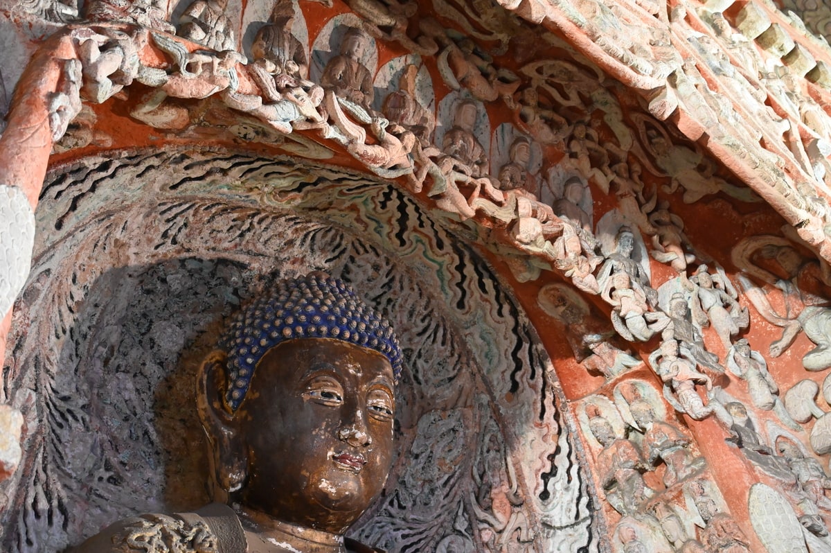 雲岡石窟が造営された北魏時代は日本では弥生時代が終わり古墳時代を迎える時代。耶馬大国の卑弥呼の時代から古墳時代へと向かった時代。その時代に洞窟一面にこのような華麗で繊細なたくさんの仏教彫刻が存在した。中国の悠久の偉大な歴史に思いを馳せながら洞窟を歩いていると、いっそう雲岡石窟のすばらしさに圧倒される。