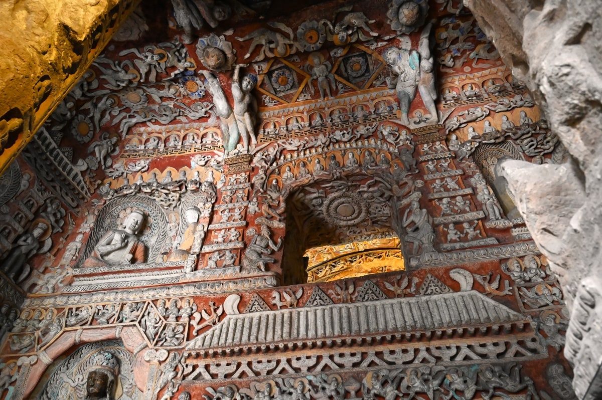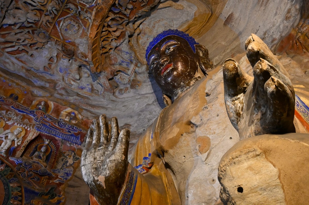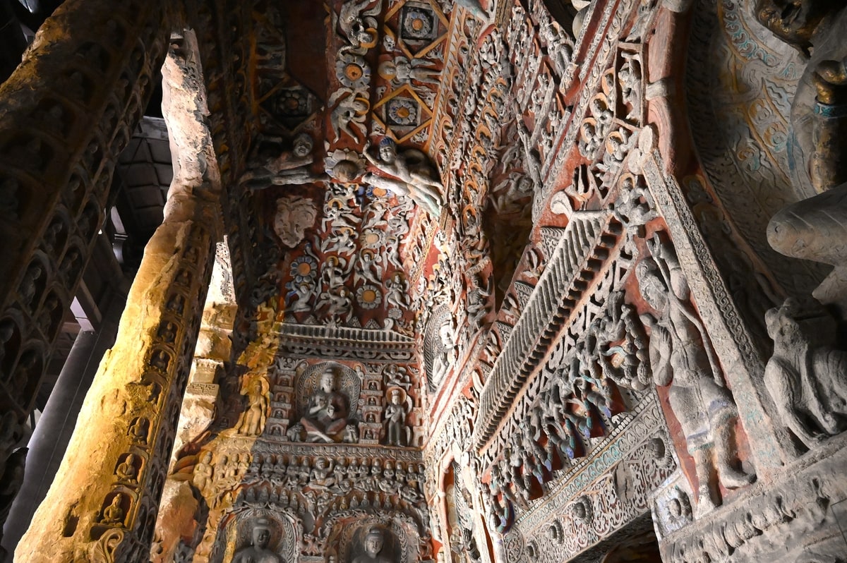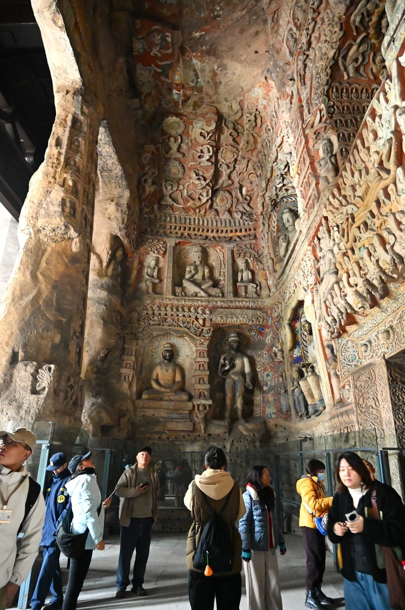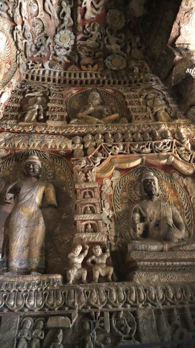 雲岡石窟の仏像彫刻は第20窟や19窟の露天の大きな仏像も、洞窟内の数センチの小さな仏像も手足の動き、表情も生き生きと精緻に刻まれている。座している小さな仏像の足の組み方まで一体、一体が違い、皆、個性豊かに刻まれて、まるで今にも動き出し、語りかけてくるような思いになる。仏像が身に纏う衣装も風に吹かれてゆらめいているような繊細さである。天女が優雅に舞っている彫刻もある。西暦400年頃にこのように豊かな芸術文化がシルクロードの起点近くの中原の地にあったことにさらに驚く。