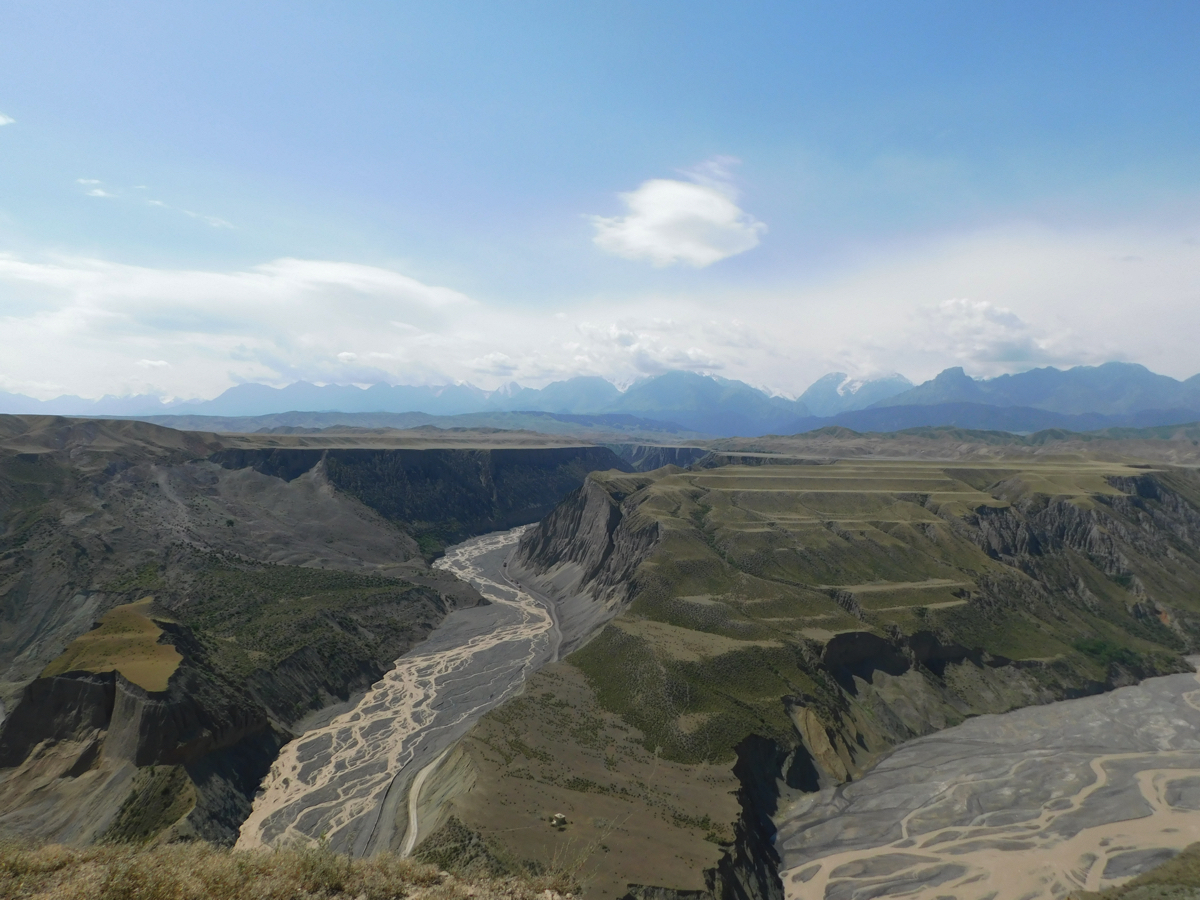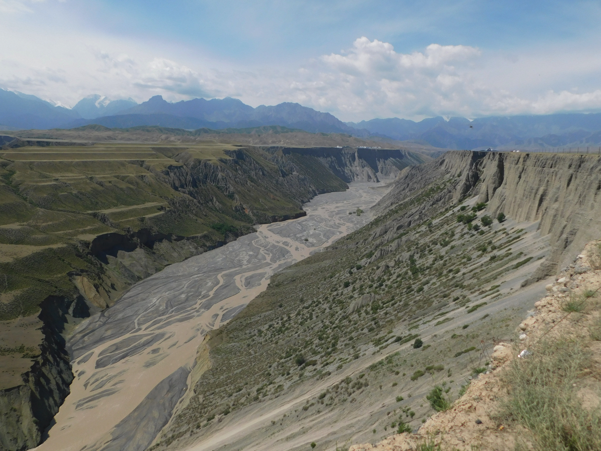 新疆には北に阿爾泰(アルタイ)、中央に天山、塔里木(タリム)盆地とタクラマカン砂漠を挟み南に崑崙(コンロン)山脈が走る。天山は世界の七大山系の一つで新疆の東から西、およそ2,500㎞に連なる世界最長の山脈である。天山は東天山、中央天山、キルギスとの国境付近に連なる西天山に分かれる。天山には雪解け水が流れる深い渓谷や溝がたくさんある。烏魯木斉の近くには白楊溝があり南山牧場は西白楊溝にある。カナスから国道217号を南に走ると、道は東西を結ぶ国道312号と交錯し、交わるところに奎屯(クイトン)の街がある。新疆には省政府の組織とは別に新疆生産開発兵団という僻地開発のために設けられた組織がある。政府と同じように病院や学校、テレビ局も持つ。奎屯はその兵団が建設した街である。クイトンの街から西南20㎞ほどに奎屯河大峡谷がある。太古に海底が隆起し、さらに天山から流れる河が深く大きな峡谷をつくっている。太平洋の海底の溝が地上に現れた。そんな感慨を持つ溝だった。クイトン大峡谷は南北20㎞、幅は800~1,000m、底幅は100~400mあり、高さは200mほどで、溝を見下ろす台地には柵もなく断崖の淵に立つにはかなりの度胸がいる。