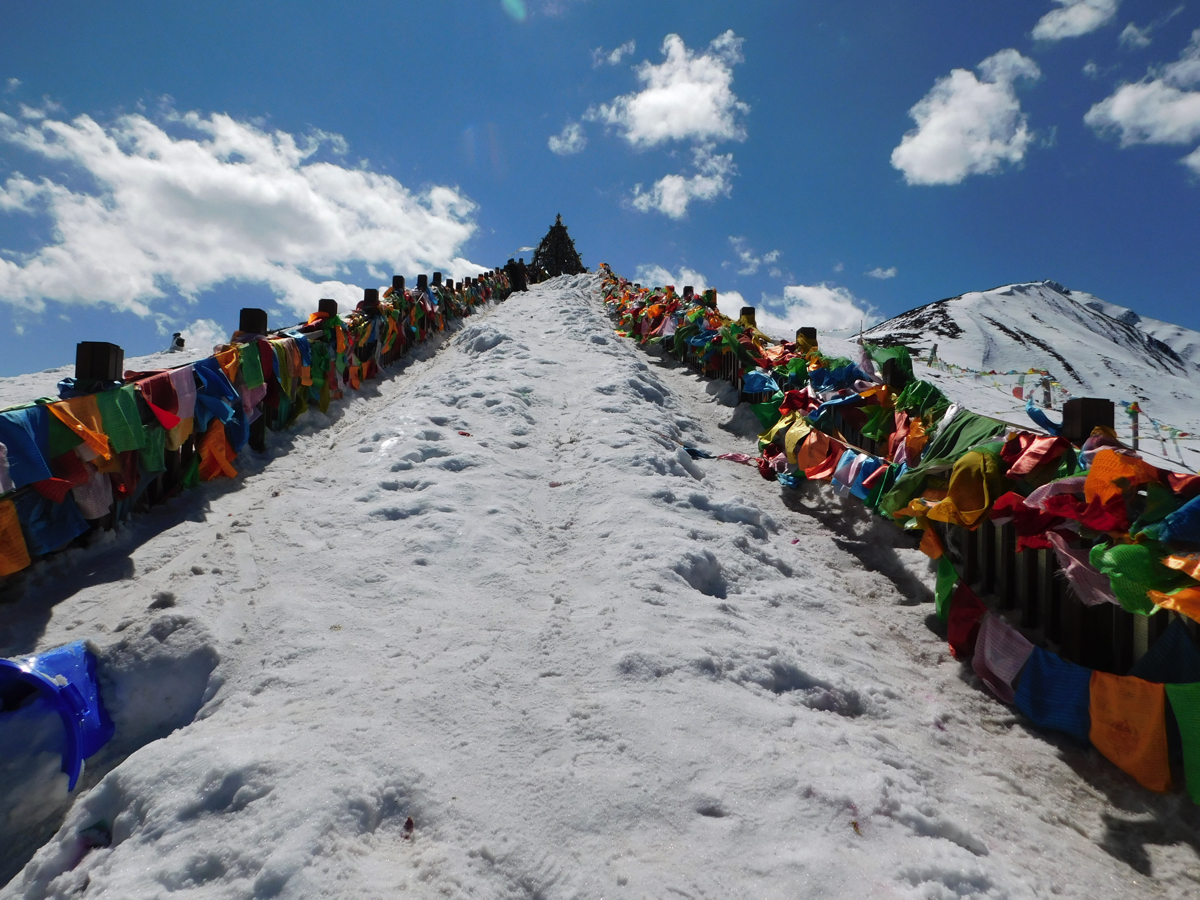 四川省の西部、茶馬古道を行くとチベット仏教の五色の祈祷旗、タルチョがいたるところで目に入る。タルチョは風馬旗とも呼ばれ経典、仏法を風に乗せて伝えるための旗である。“馬即風”で風が馬の代わりに経典を運ぶので風馬旗と呼ぶのだろう。風馬はチベット語で“隆達”で、隆は風、達は馬である。チベット仏教の経典の根源は“六字箴言”すなわち六文字の箴言(金言)「翁ウェン、麻マ、尼ニ、八パ、米ミ、牟ム」である。これらの箴言が風に乗り伝播される。それが風馬旗の意味である。康定から新都橋に向かう途中、国道318号は海抜4,298mの折多(チタ)山峠を通る。峠を越える道は壮観である。峠で車を止めてアイゼンをつけて雪の折多山に登った。折多山は青藏高原に入る分水嶺で、折多山を越えると茶馬古道はチベットに入る。近くには長江(揚子江)支流の岷江源流の“大渡河”が流れる。折多はチベット語で“湾曲”を意味し、“嘉絨”(美しい織物)とも呼ばれる。山への登り道の両側に風馬旗が風になびき、その道は天に上る階段のようである。折多山からの眺めはそのなのとおり雪のまだら模様が美しい自然の絨毯のようだった。遠くにコンガの峰が見渡せ、峠を挟み国道318号線がチベットに向かいどこまでも続いている。