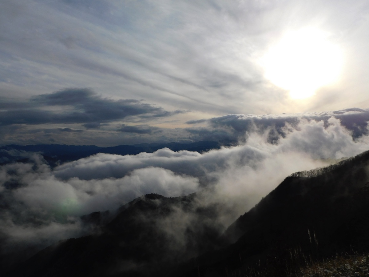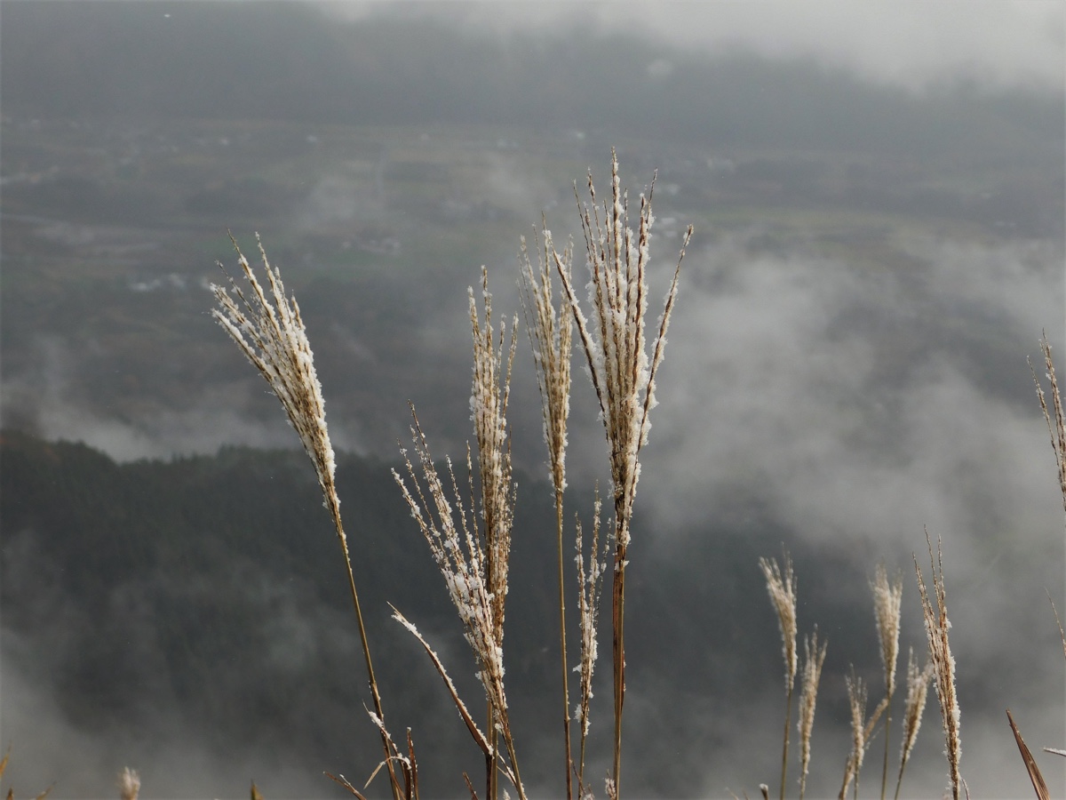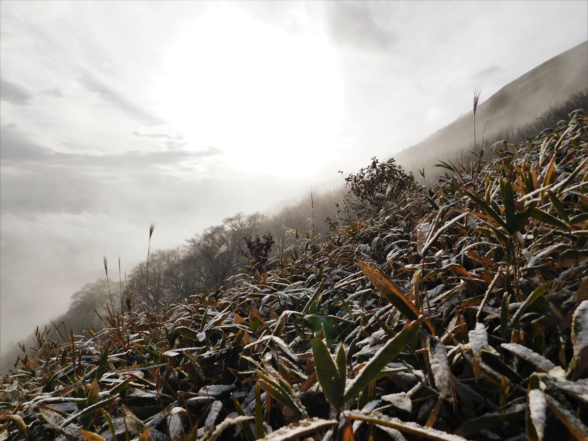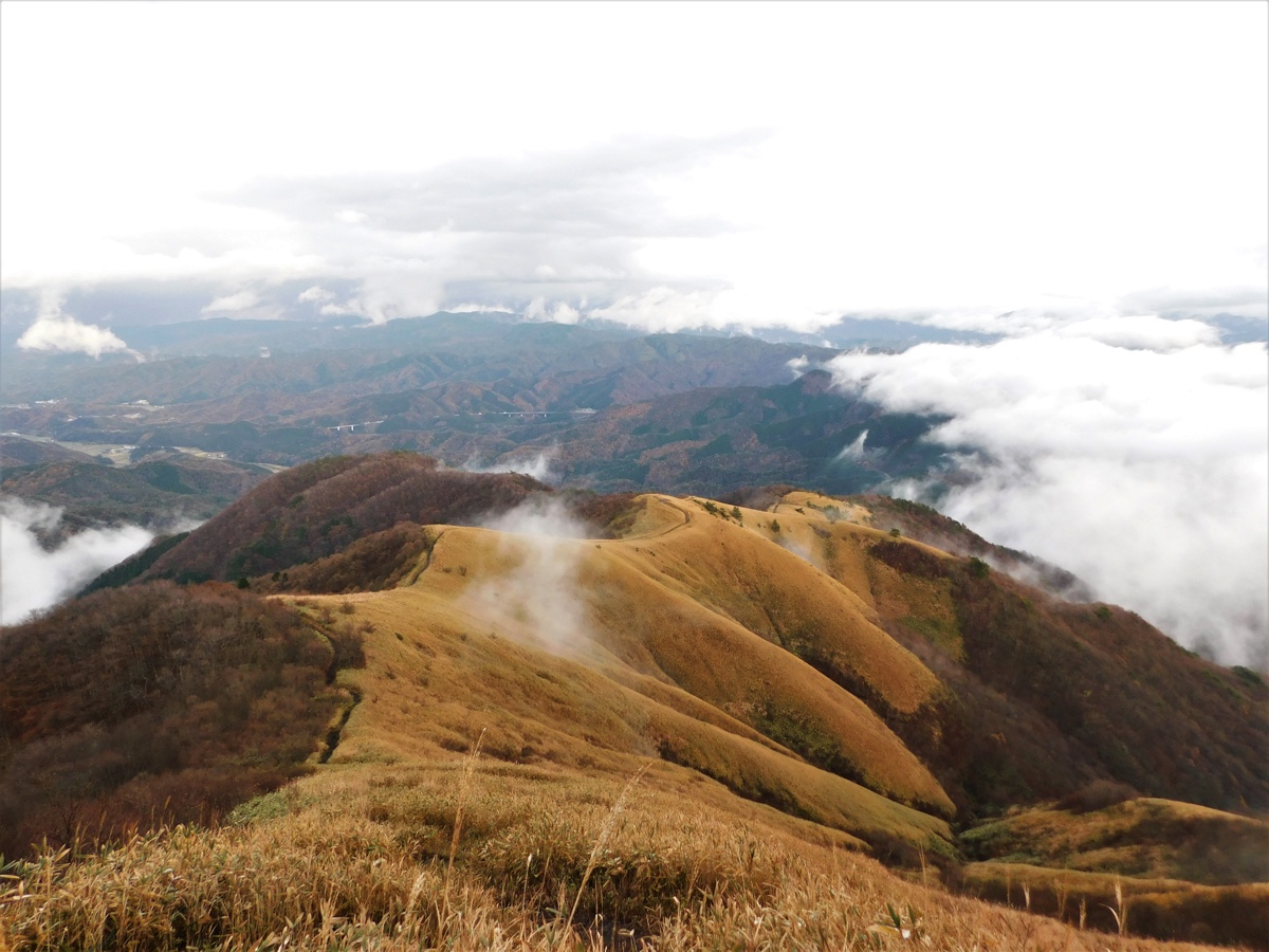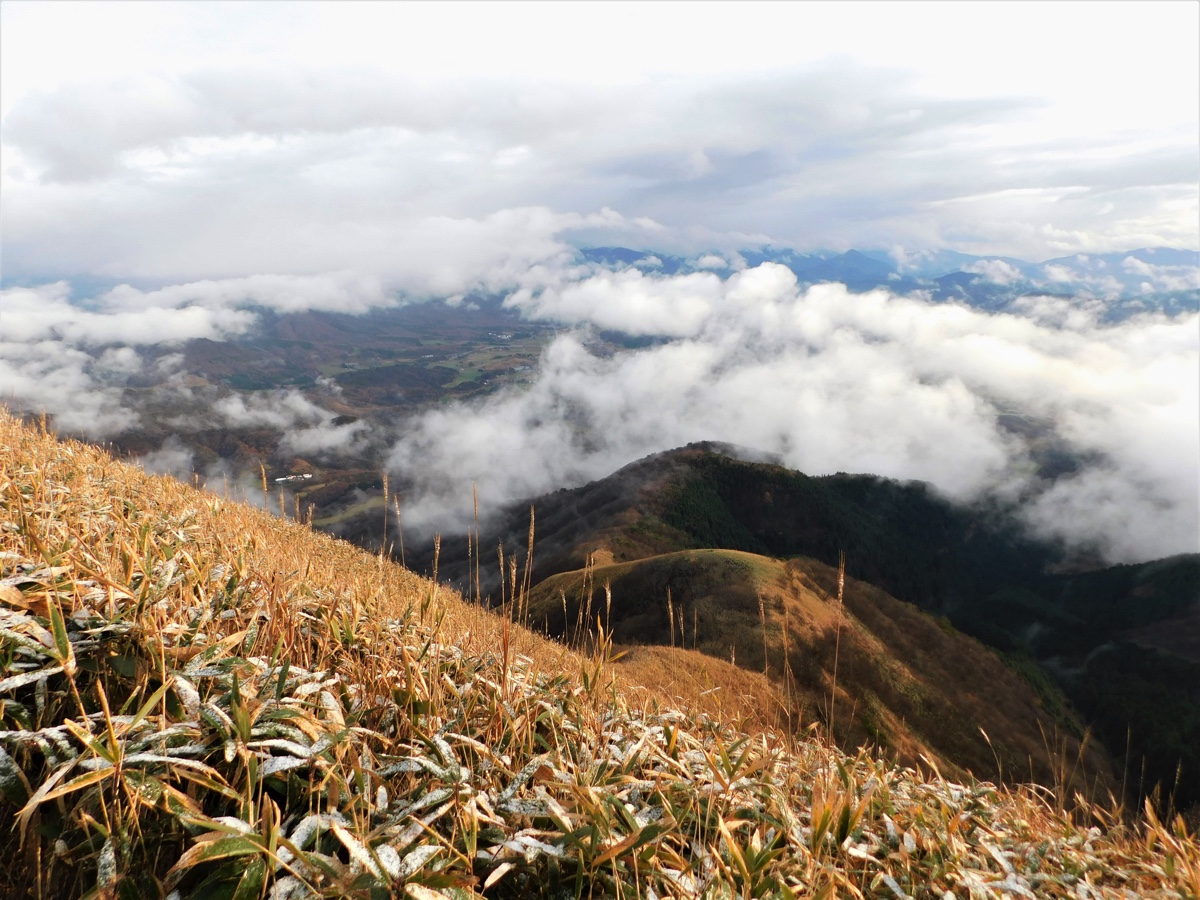 日本の西、中国地方の岡山県と鳥取県の境に蒜山高原があります。蒜山高原には蒜山三山と呼ばれる上蒜山、中蒜山、下蒜山の三つの山があり尾根で繋がっています。2018年の晩秋,下蒜山に登りました。その日はあいにく曇り空、登り始めると次第に空に雲が拡がり、山頂は小雪が降っていました。急いでおりかけた時、頂上近くで誰かが演出したように山の風景が変わり始めました。感動の一コマでした。そして下山を始めると、雲の切れ間から金色の蒜山を見ることができました。下蒜山に登った翌日、近くの那岐山に登りました。前日とは異なり麓は紅葉が美しく、おだやかな山容の那岐山の頂上からは360度、遠くは四国や京都の山々まで望むことができました。
