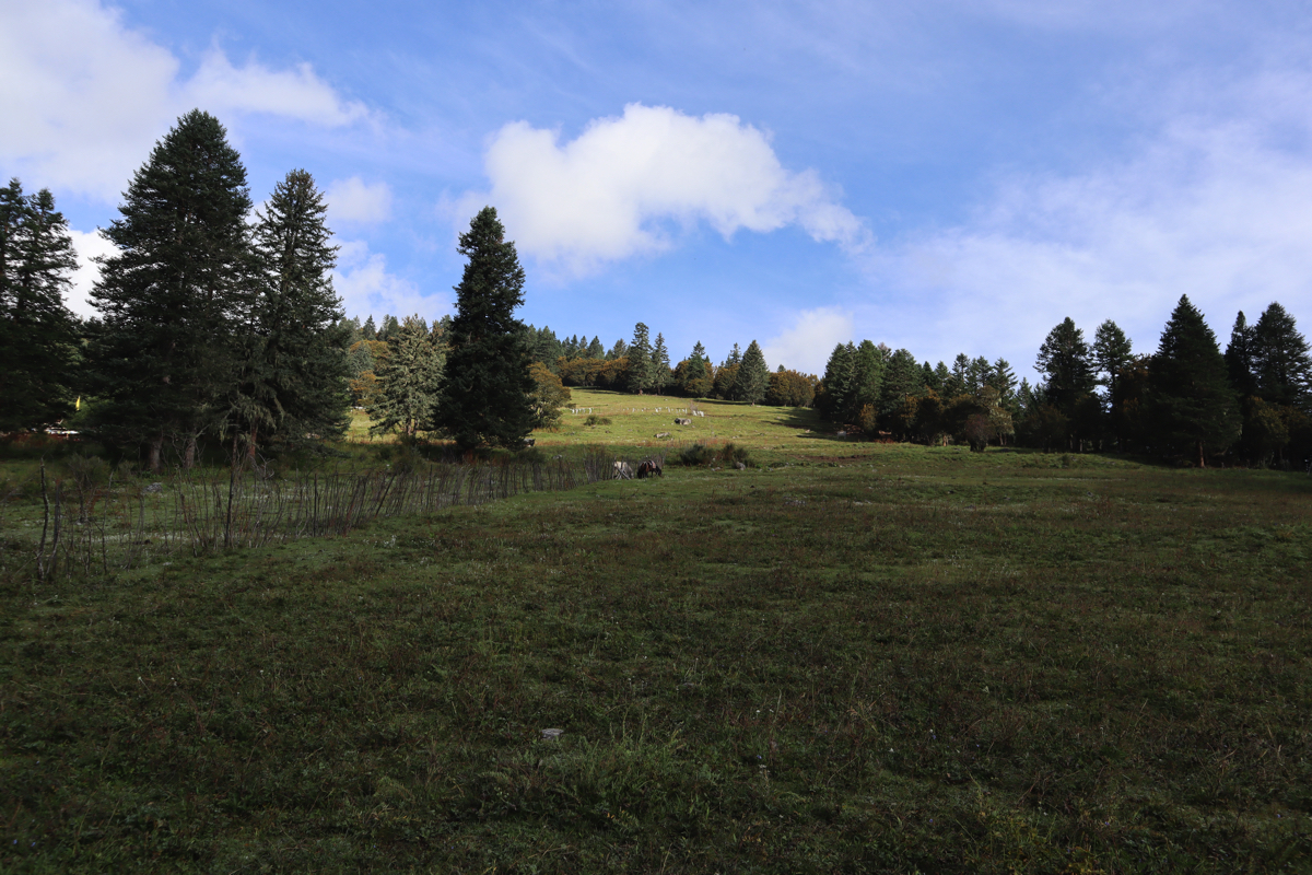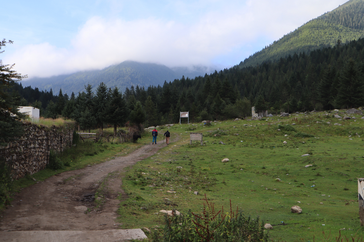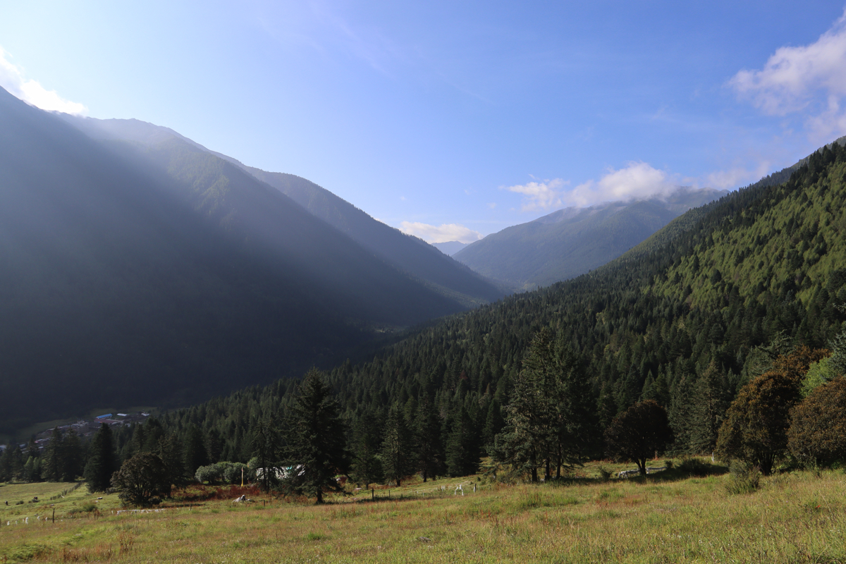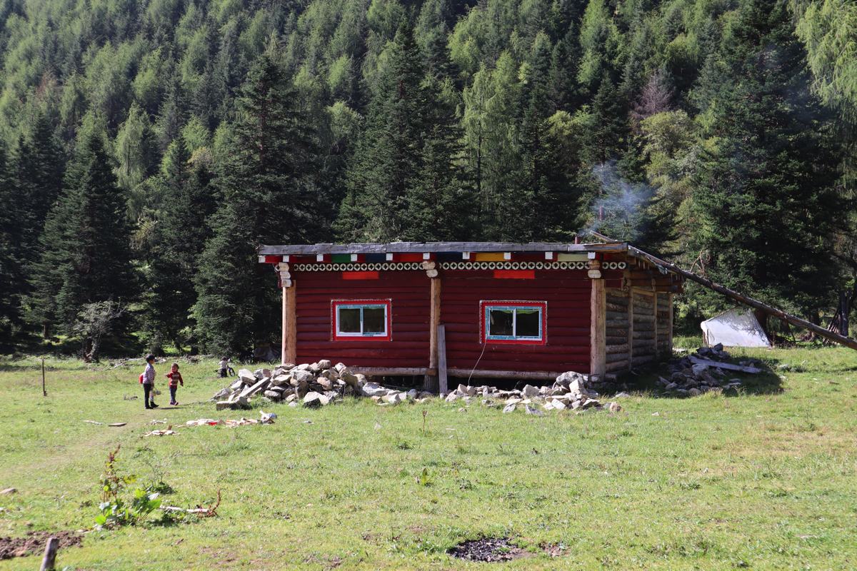 党嶺村は海抜3,347mなのでおよそ853m、日本では神戸の六甲山の高度差と同じくらいを登る。戦時下の共産党の「長征」もこの山を越え、「長征」の難所でもあった。葫芦海には「長征」と同じ道を行くのだろうか。登り始めると間もなく村を見下ろす高台に出て遠くのお寺が金色に輝いている。しばらく穏やかな道が続き、木々の緑と空の碧さが競い合っている。出会う人もいない道をひたすら登ると途中、牧場の小屋の前で小さな子供達が遊んでいた。とても富士山の高さを登っていると思えないのどかな道である。かつて党嶺は中国の十大トレッキングコースに選ばれたことがある。時代の変化でトレッキング人気も高くなり、多くの秘境が解禁されたため今はその名はない。現在の十大コースは、桂林の漓江(リコウ)、新疆の喀納斯(カナス)、四川の四姑娘山(スクニャンサン)、西蔵の崗仁波斉(カンレンパル)、梅里雪山、四川のコンガ山、新疆の夏塔古道、烏孫古道、西蔵の珠峰(チョモランマ)、西蔵の南迦巴瓦(ナムチャパルワ)、四川省の稲城亜丁、雲南省の怒江大峡谷、新疆のタカラマカン砂漠など高山の麓の渓谷や砂漠トレッキングに人気がある。