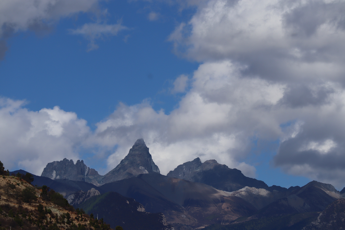 金沙江は金沙江大一湾や長江大湾で蛇行を繰り返して雲南省と四川省の境界を流れ、長江(揚子江)に名を変えて重慶、湖南省、湖北省を流れ上海で黄海に注ぐ、6,300㎞の壮大な流れである。廸慶には梅里雪山を初め玉龍雪山などの有名な雪山も多い。雨崩への玄関、飛来寺には白馬雪山の直下を通る国道214号を走る。白馬雪山は二つの峰に分れ、一方は緑も多い峰、一方は茶色い岩山で実に対照的な姿である。今年は暖冬のためか、地球温暖化の影響か山に雪が無かった。