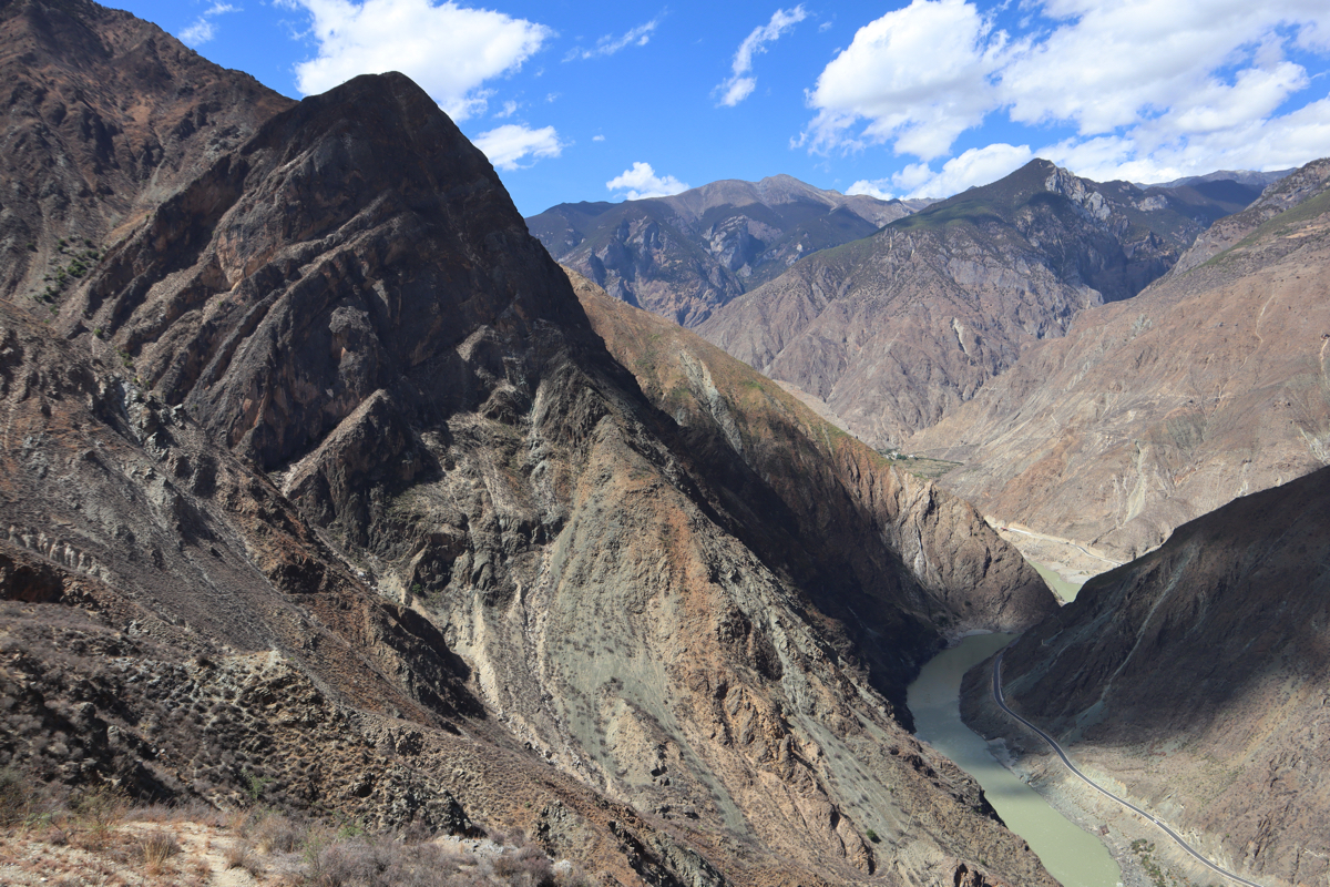 三江併流の一つ、金沙江は青海省青藏高原の可可西里に聳える海抜6,621mの各拉丹東峰付近に源を発し、四川省の西端を南下し雲南省の廸慶地方を流れる。廸慶に入った金沙江がほぼ逆に北に向きを変えるところが長江第一湾で、その近くには有名な虎跳峡がある。中国では河が蛇行し急角度で向きを変える場所を湾と表現する。長江第一湾から香格里拉(シャングリラ)を過ぎ北に向かうと大きく向きを変える金沙江大湾がある。