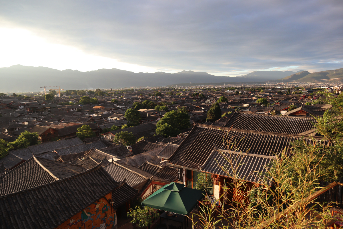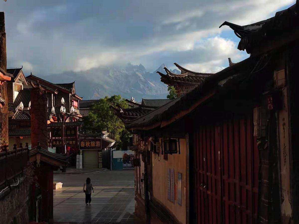 朝早く古鎮を散歩した。空気が澄み、古鎮の向こうに玉龍雪山が聳えていている。