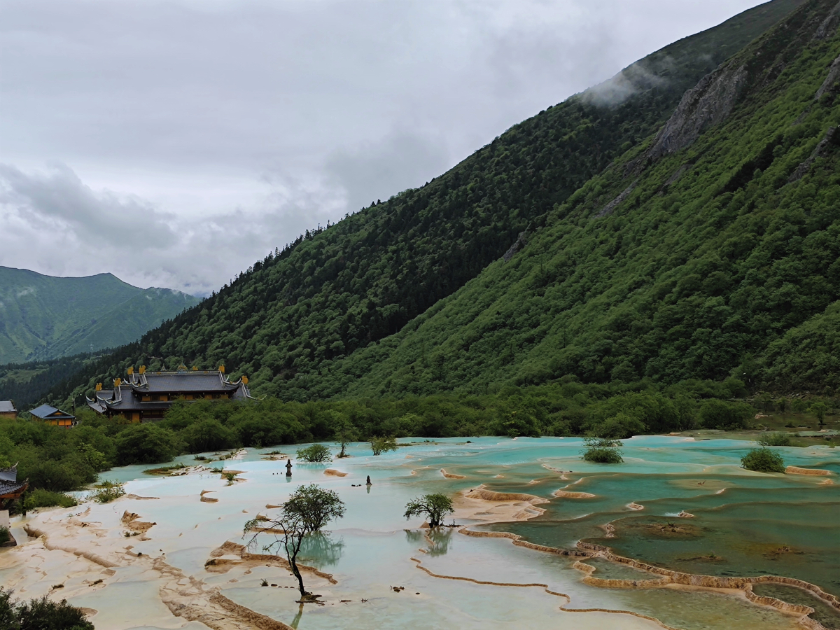 その中でも黄龍溝は4.3㎞ほど続く石灰岩の白、黄土色と澄んだブルー、翡翠色の水の“棚田”や滝が続き“人間瑶池“人間仙境”、“世界の翡翠”とも言われる。