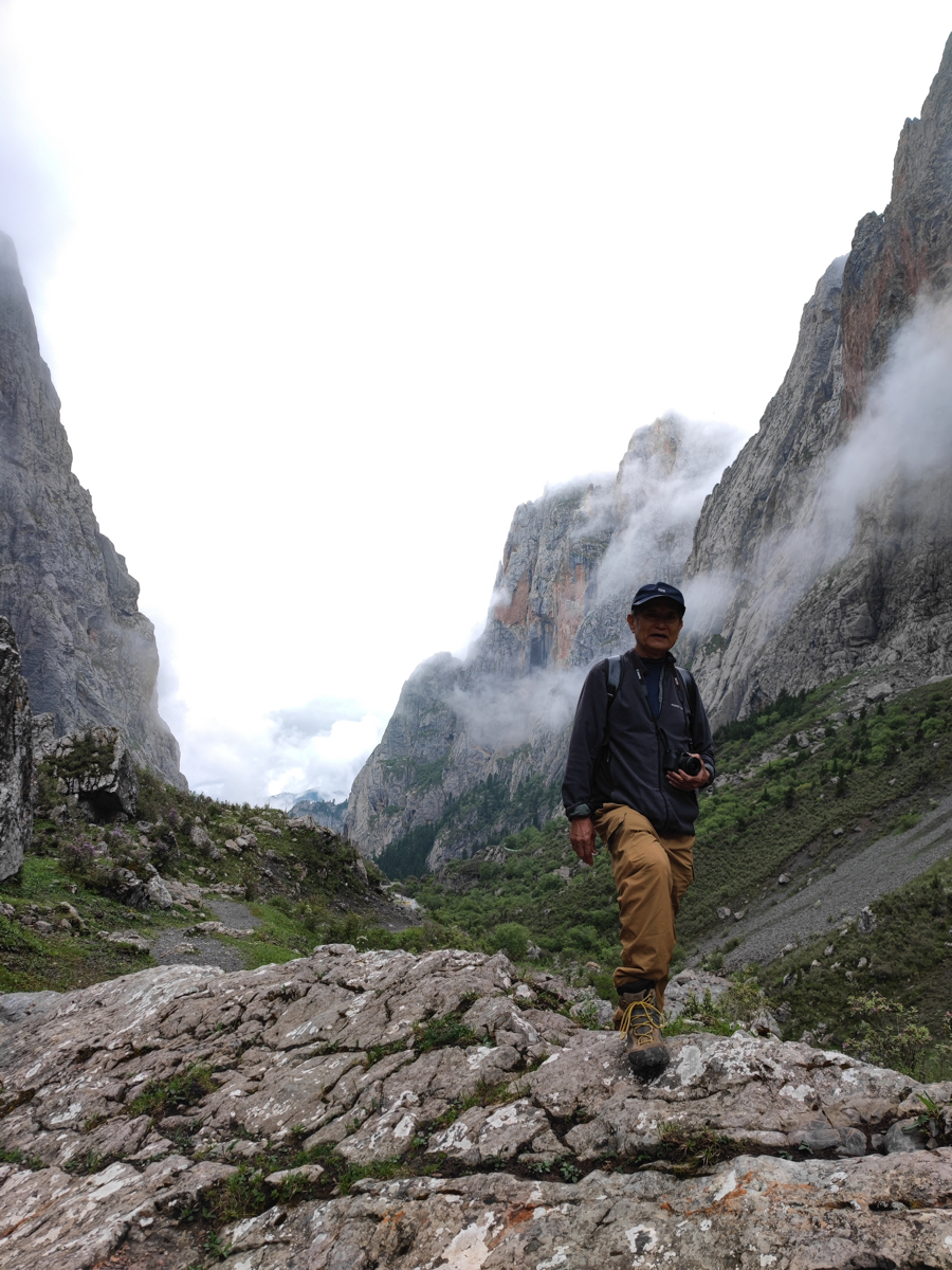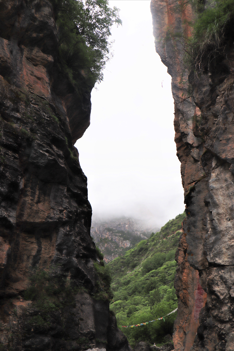 多くの観光客はツァガナ(zhagana)の代表的な風景である岩山とその下の村を一望できる高台からの景色を見て感動し、その風景を写真にとって帰る人も多い。だが、その岩山の向こうにはどんなすばらしい風景が拡がっているのか、それを見たいと思い、地元のチベット族ガイドの案内で背後の山を歩いた。村から歩いてゆくと登山道の両側に高い岩山が迫って来る、その圧倒される風景に感動する。当日はあいにくの曇り空、山々はガスに覆われその一部が見えるだけだったが、それでもすごい迫力で迫ってくる。同行の李明君は馬に乗り行ったが、馬の道と登山道は分れている。