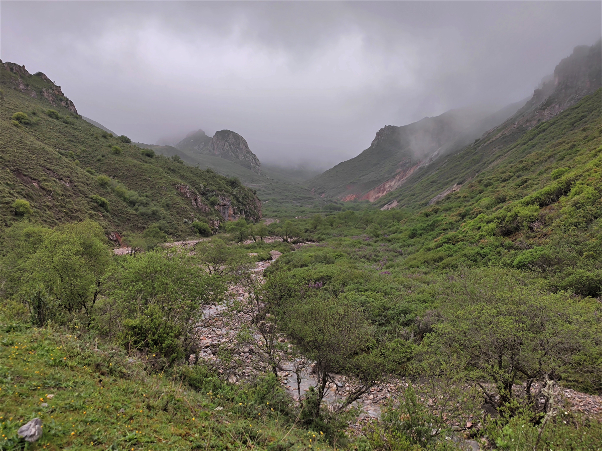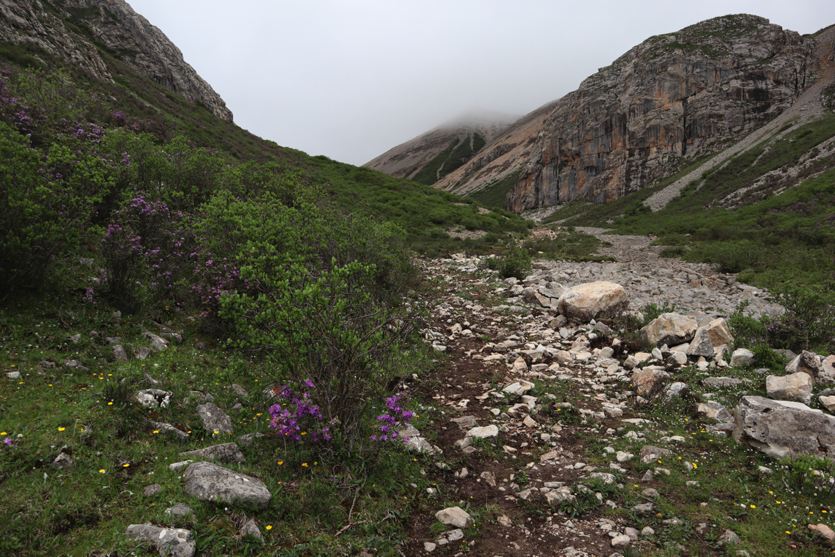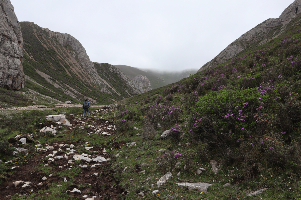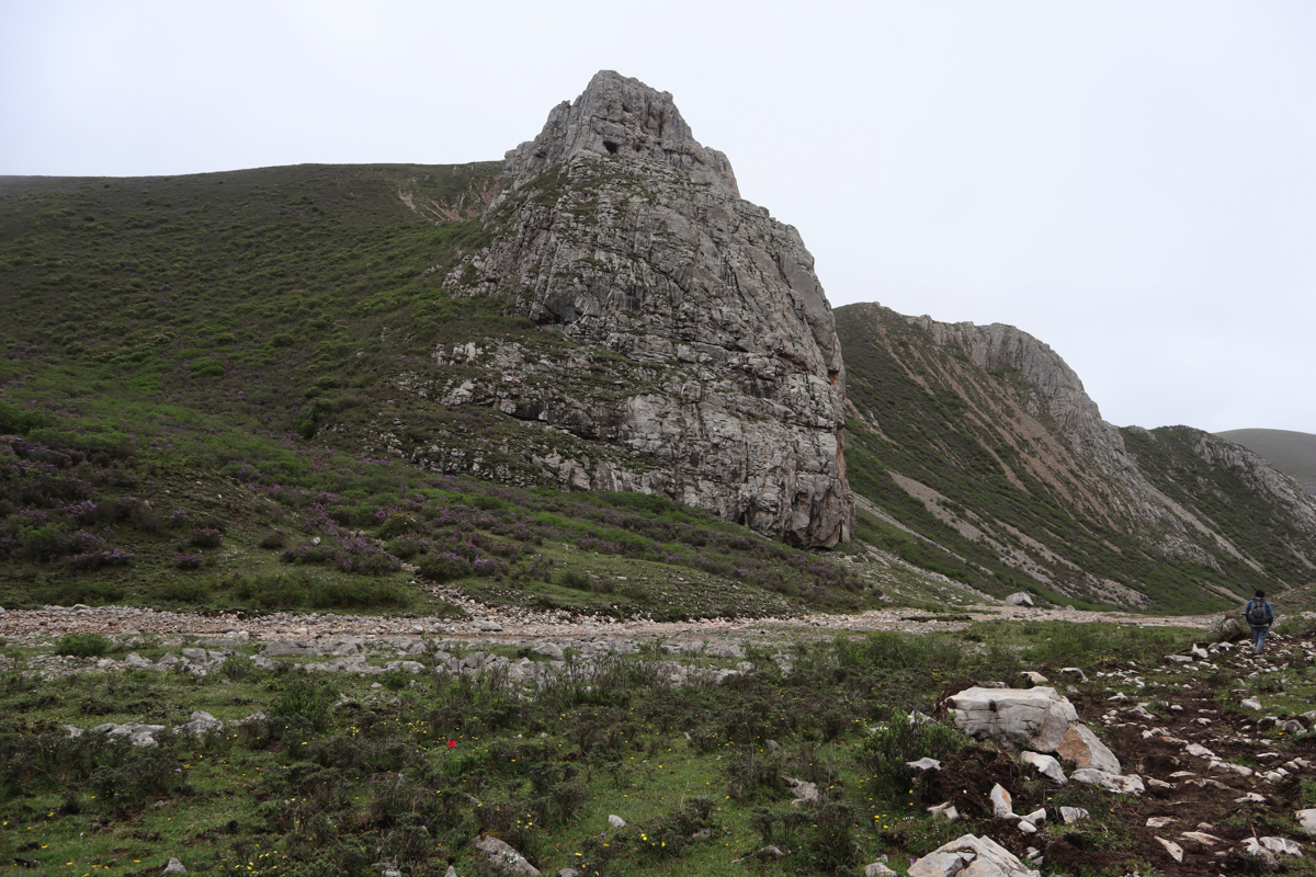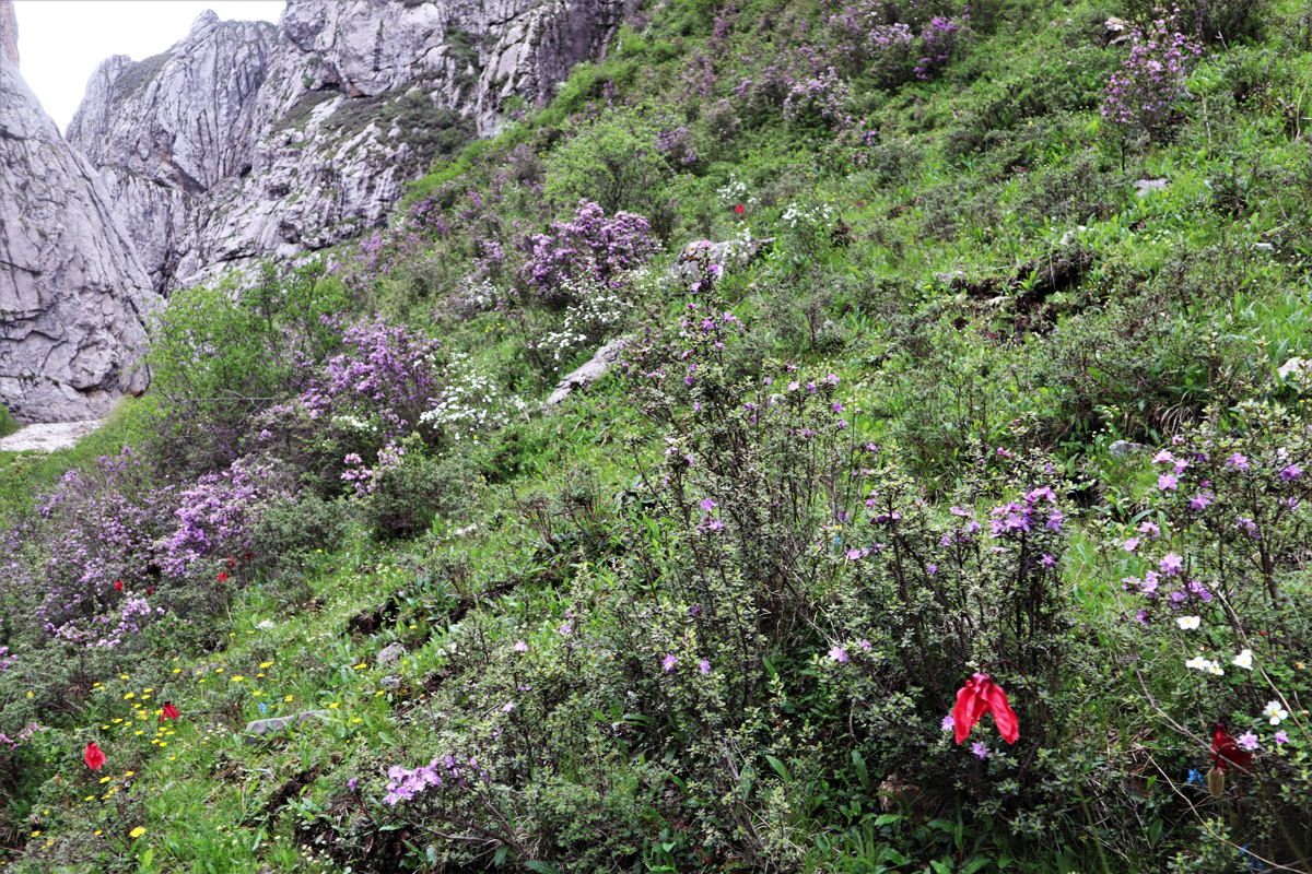 村からツァガナ石林を通り包那西牧場を通り、那諾路大峡谷から通天洞に回る環状のコースを歩いた。馬に乗る同行の李君とは包那西牧場の手前で別れ、ガイドと二人の山歩きになった。包那西牧場から那諾路大峡谷を下っていく道は岩山の間を行く谷間の道で壮大ですばらしい景観だった。日本の九重や霧島に咲くミヤマキリシマのようなピンク色の小さな花をつけた低い小さな木が山の上まで咲いていた。牧場から峡谷への道を歩きながら静かに耳を澄ますと草原の地下を流れる伏流水の音が聞こえてきた。