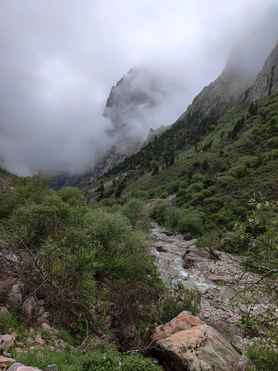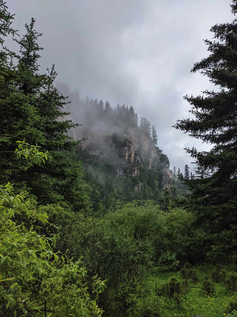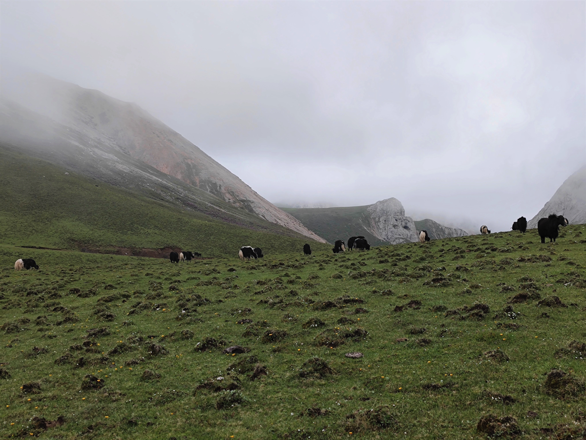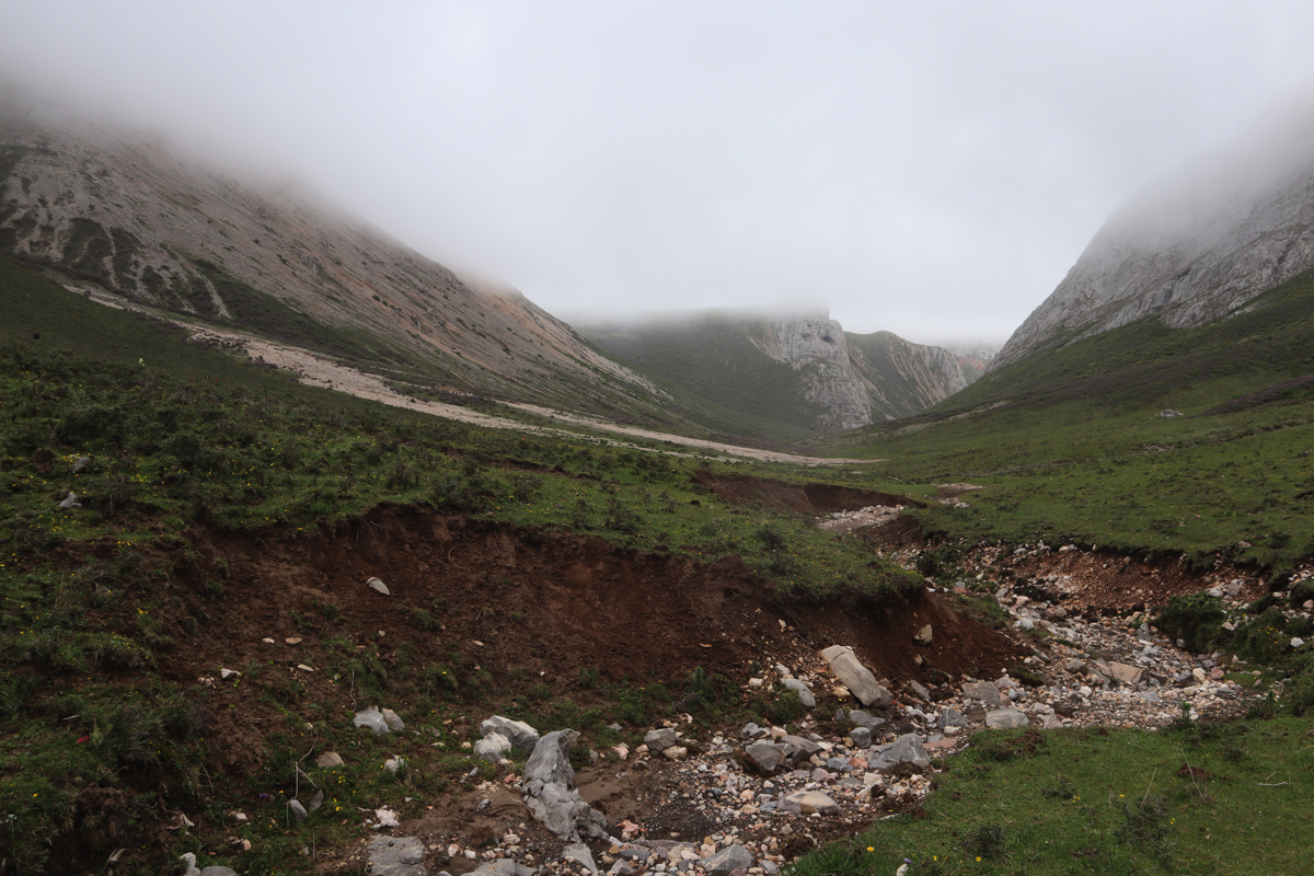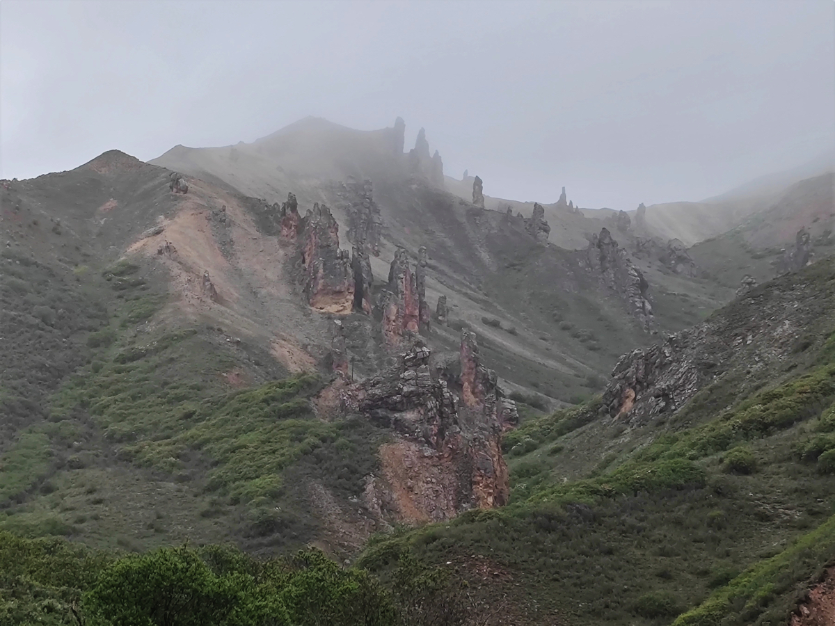 村からツァガナ石林を通り包那西牧場を通り、那諾路大峡谷から通天洞に回る環状のコースを歩いた。馬に乗る同行の李君とは包那西牧場の手前で別れ、ガイドと二人の山歩きになった。包那西牧場から那諾路大峡谷を下っていく道は岩山の間を行く谷間の道で壮大ですばらしい景観だった。日本の九重や霧島に咲くミヤマキリシマのようなピンク色の小さな花をつけた低い小さな木が山の上まで咲いていた。牧場から峡谷への道を歩きながら静かに耳を澄ますと草原の地下を流れる伏流水の音が聞こえてきた。