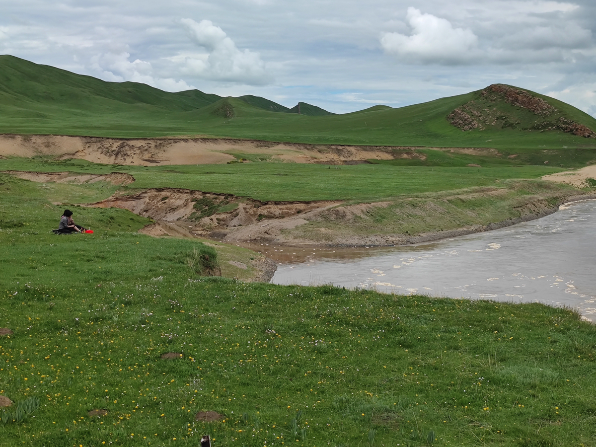瑪曲から久治への途中、天下黄河第一湾の大橋を渡る。黄河の河畔の草原で恋人同士が黄河を見ながら休んでいる。母なる河、雄大な黄河を前に恋人が語り合う。なんと絵になる素晴らしい光景だろうと思いながらシャッターを切る。こちらの様子に気づいたのか手を振って答えてくれた。