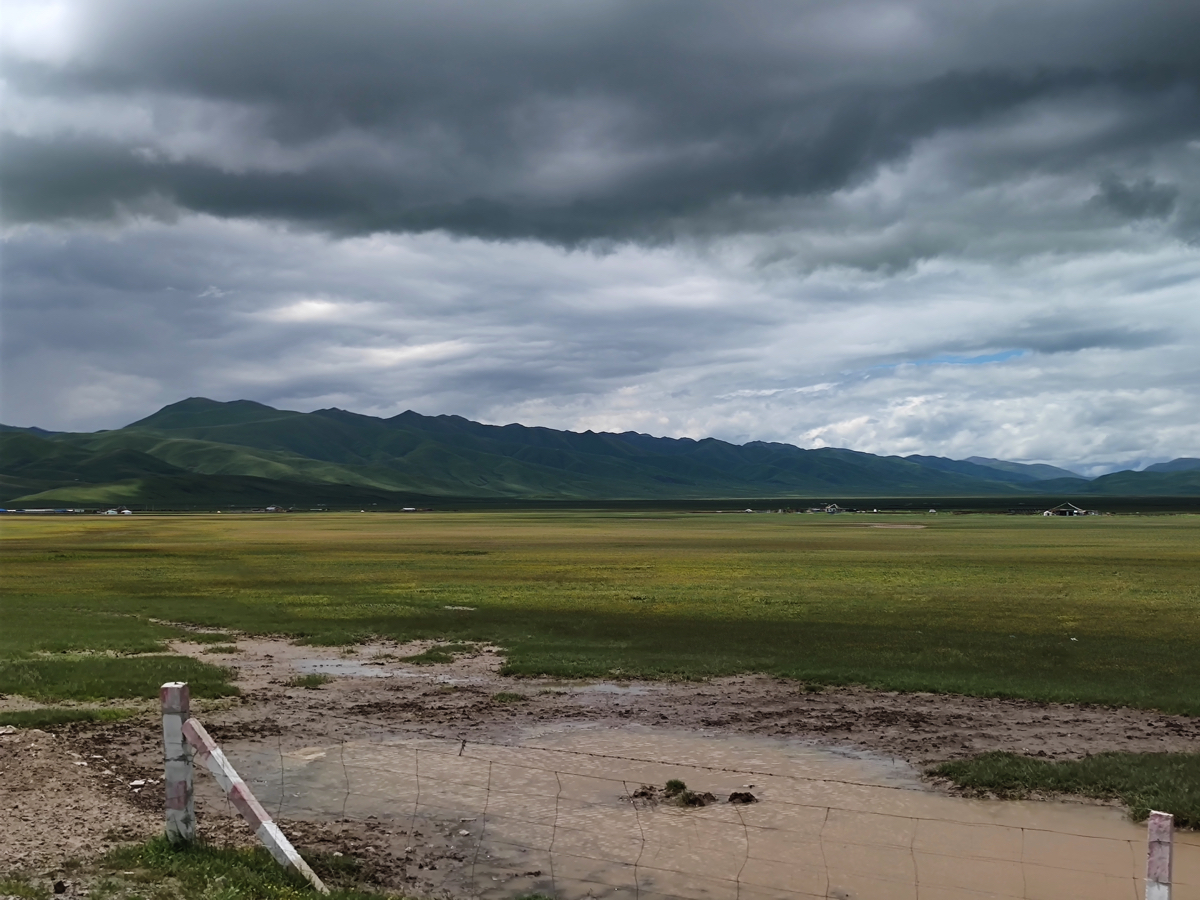 久治から東南方向の四川省の阿壩藏族羌(チャン)族自治州の阿壩の街に向かう。阿壩を西南に行けば壌塘西蔵仏教の著名な高僧 zhongran laxiri 仲然拉西日が創建の800年以上の歴史がある覚嚢派の中壌塘(zhon rang tang)寺がある。近くにはチベット族の聖山、香拉東吉聖山5178mが聳える。さらにその西には、1880年に寧瑪派の僧が創建した“日追”(修行センター)があり、1985年にそこに仏典学校がつくられた。現在は喇栄寺五明佛学院 として2000人以上が学んでいる。学院を囲み、山一面に学徒が宿泊する家々が軒を連ね、独特な景観の丘が見られ、その景観はよく中国で紹介される。阿壩に近づくにつれ草原に黄色や薄いピンクの花がたくさん咲いていた。道端には青、黄色、赤で彩色した三角の石積みがあちらこちらに見られる。それは空、地、火を表わし祈りの石積みなのだろうか。