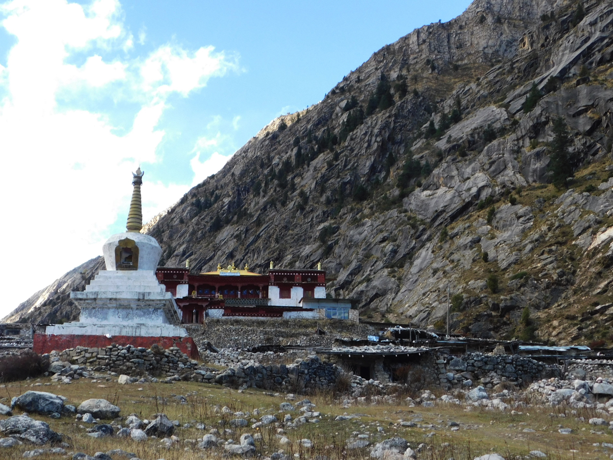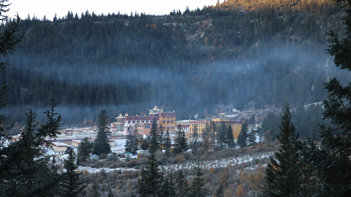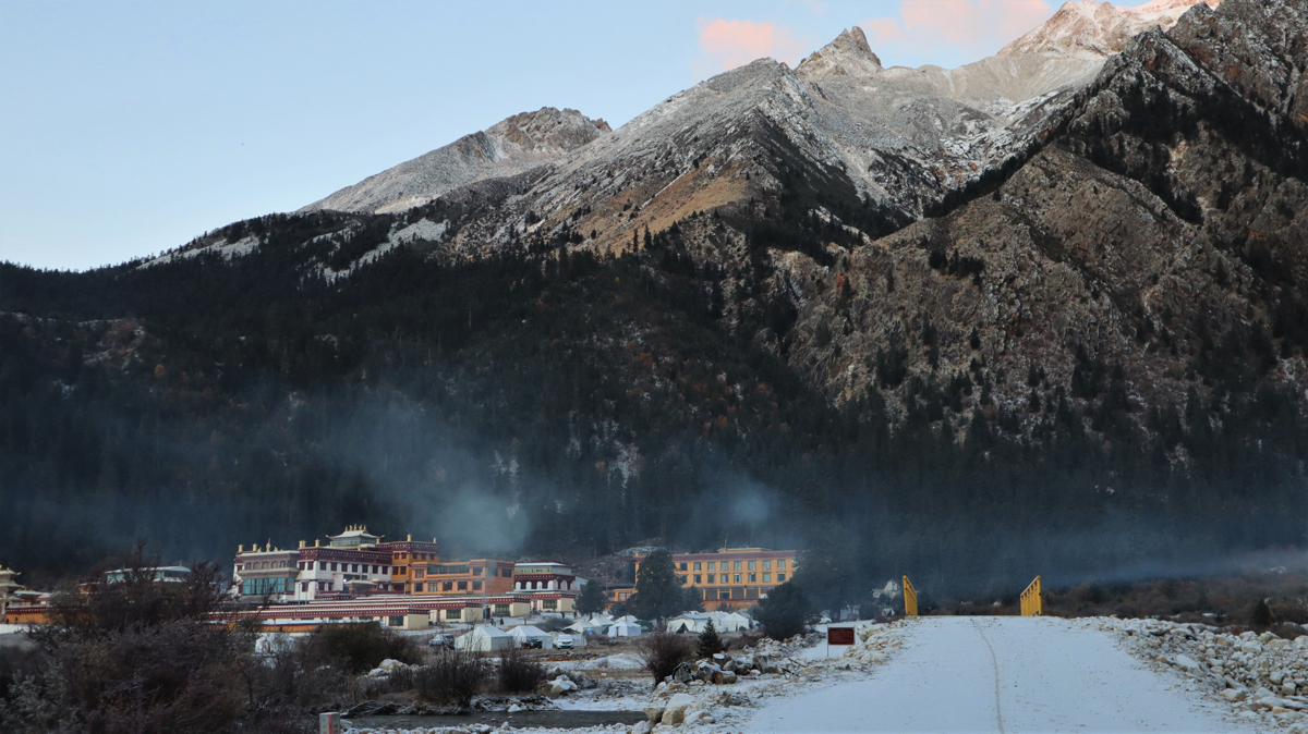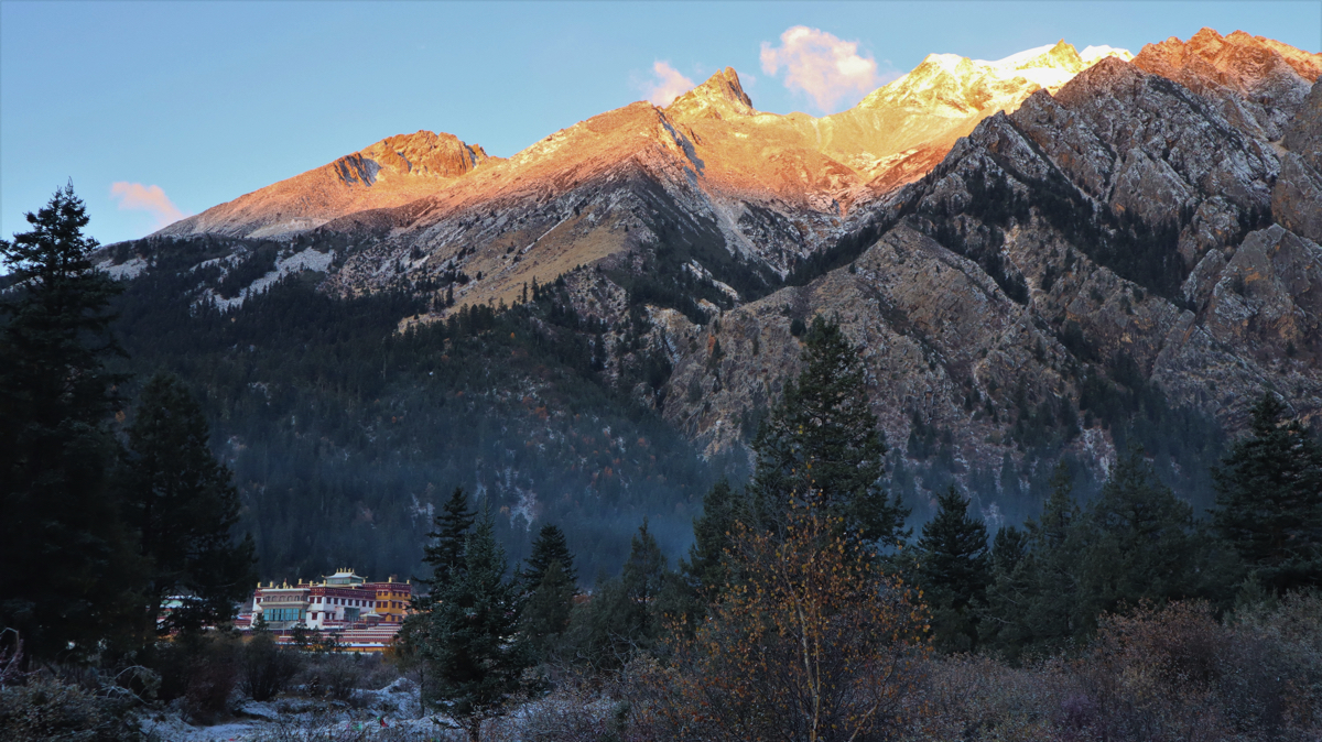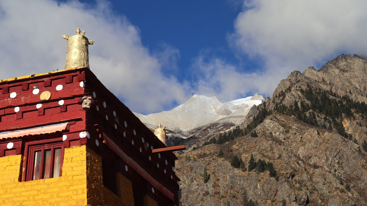 お寺の建物の真上には格聶(グニエ)の山頂が見えた。お寺の庭ではチベット民族衣装を着たかわいい男の子が遊んでいた。