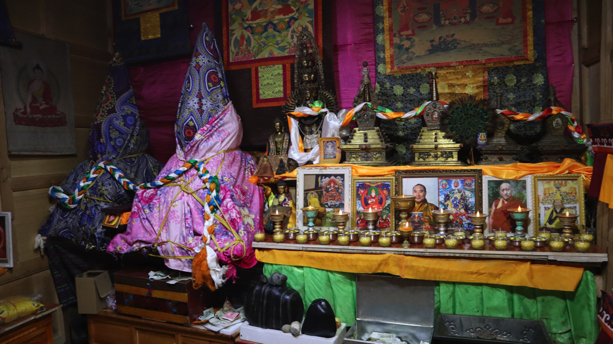小さな部屋に僧侶の写真が飾られ、秘宝だろうか、黒い石が置かれ、その横に僧侶が座っているような姿で、頭と体に布を巻き付けた等身大の人形のようなものが二体置かれていた。亡くなった僧の化身なのだろうか。