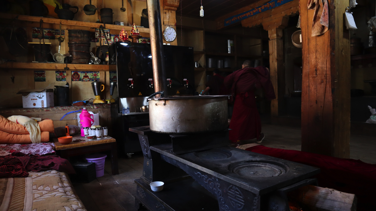 お寺に戻り、お坊さんに寺を案内してもらった。厨房では大鍋に入ったミルク茶を沸かして朝食の支度をしていたので、美味しいチベットミルク茶を御馳走になった。