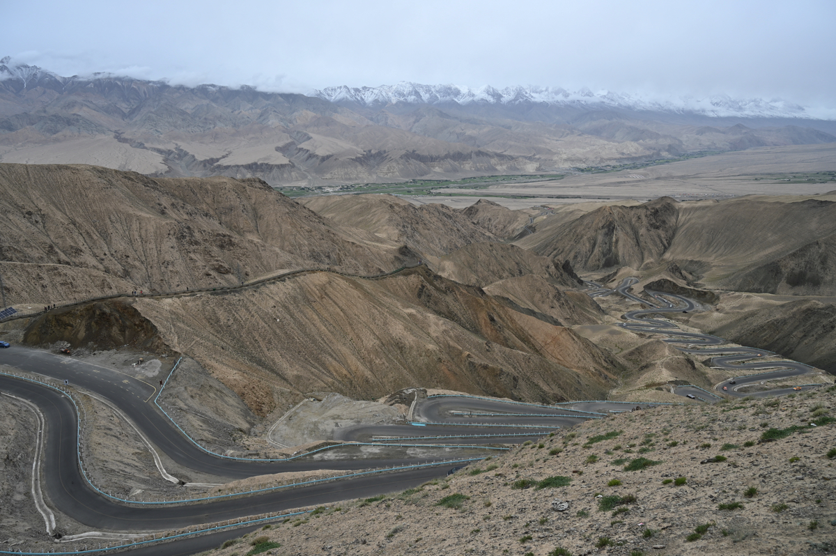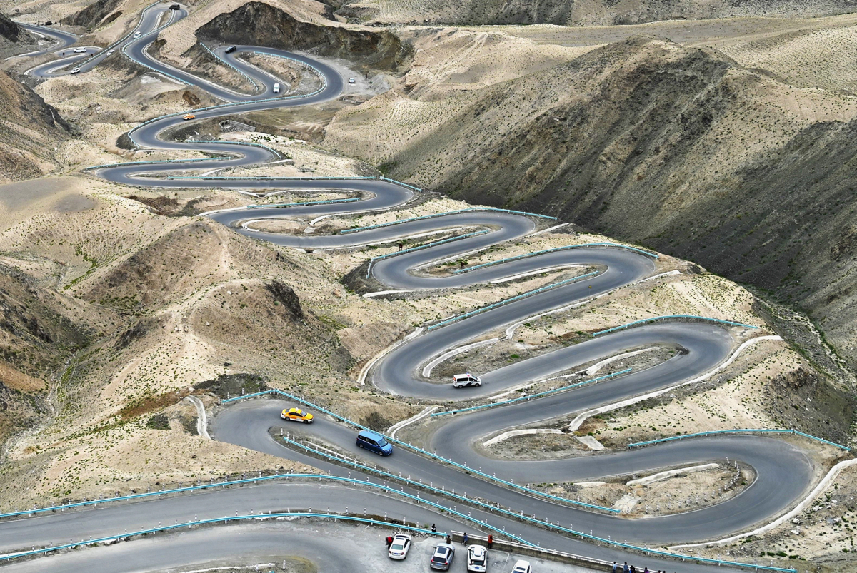 盤龍(パンロン)古道は新疆カシュガルとタジキスタンのイスハラ湖を結ぶ2000㎞の古代シルクロードにある古道で、カシュガルの南、莎車と塔什庫尓干(タクスコルガン)を結ぶ塔莎古道にあり、炎熱のタクラマカン砂漠と険しい山岳地帯のパミール高原を繋ぐシルクロードの古道である。古道のある地域は、厳しい気候風土で外界から隔絶された地であったため、ウィグル族、タジク族など少数民族の素朴な民族習慣や歴史文化が色濃く残っている。現在の道路は2019年に完成した車道でその全長は75㎞、S字道路が36㎞続く。最高標高は4200m、高低差1000m、山頂から麓まで大小のS字カーブが600か所もあり、連続するS字カーブを撮影するため多くの旅行者が訪れる。旧古道は緩い砂と岩の上にあるためトンネルを掘ることも、橋を架けることも難しく、S字の連続になった。