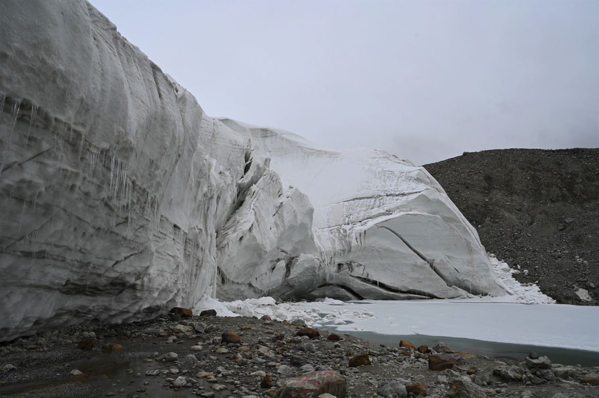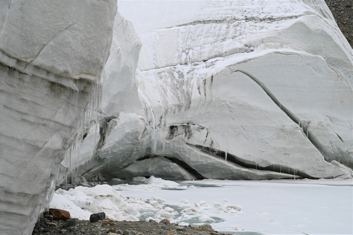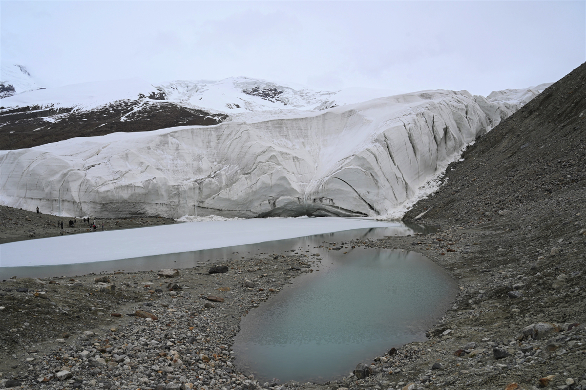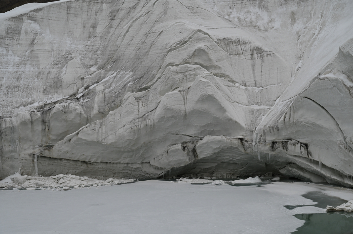 氷河の先端には高さ50mから100mほどの氷壁が迫り圧倒される。氷壁を境に真っ白い氷河と茶色い山肌が分かれている。氷河の先端に小さな湖があった。