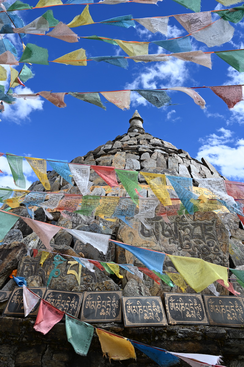 積み上げた石には六文字の真言や文様が刻まれている。風に靡く旗は祈りの文言と共に悪霊を大空の彼方に追いやっているように見える。