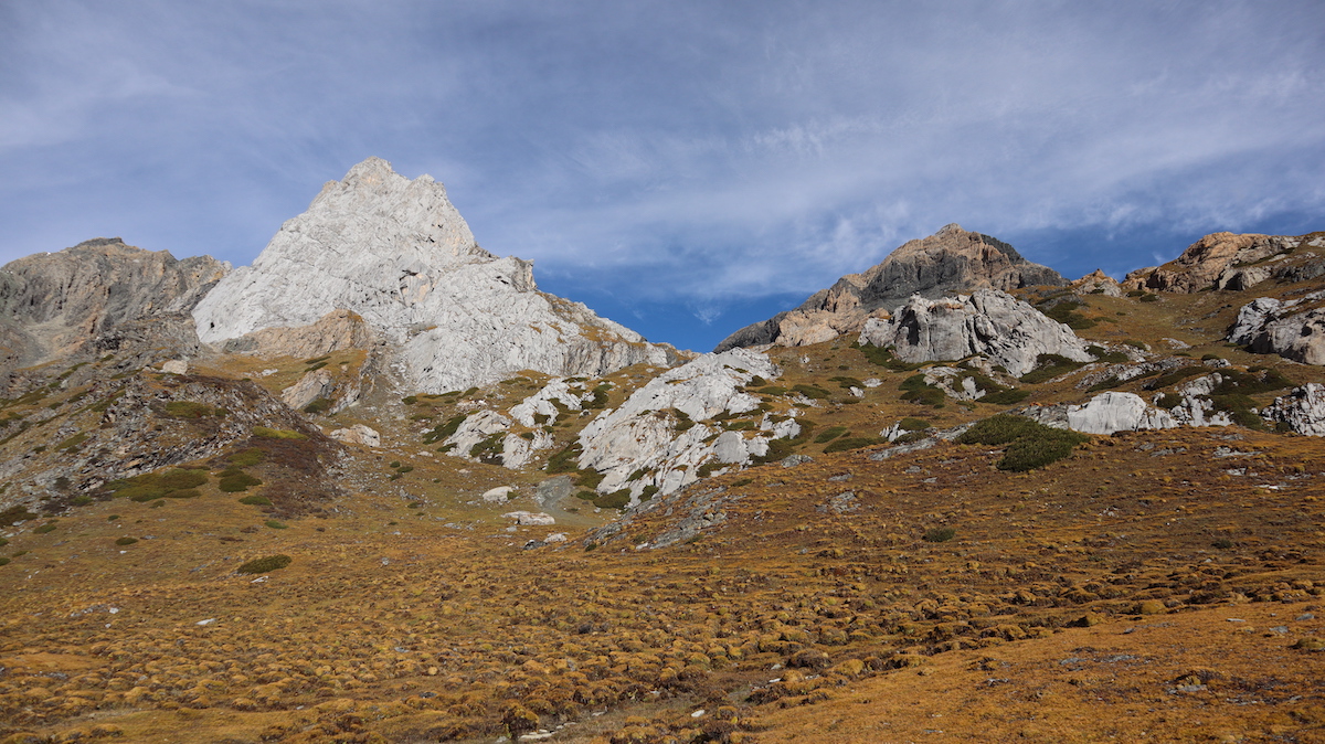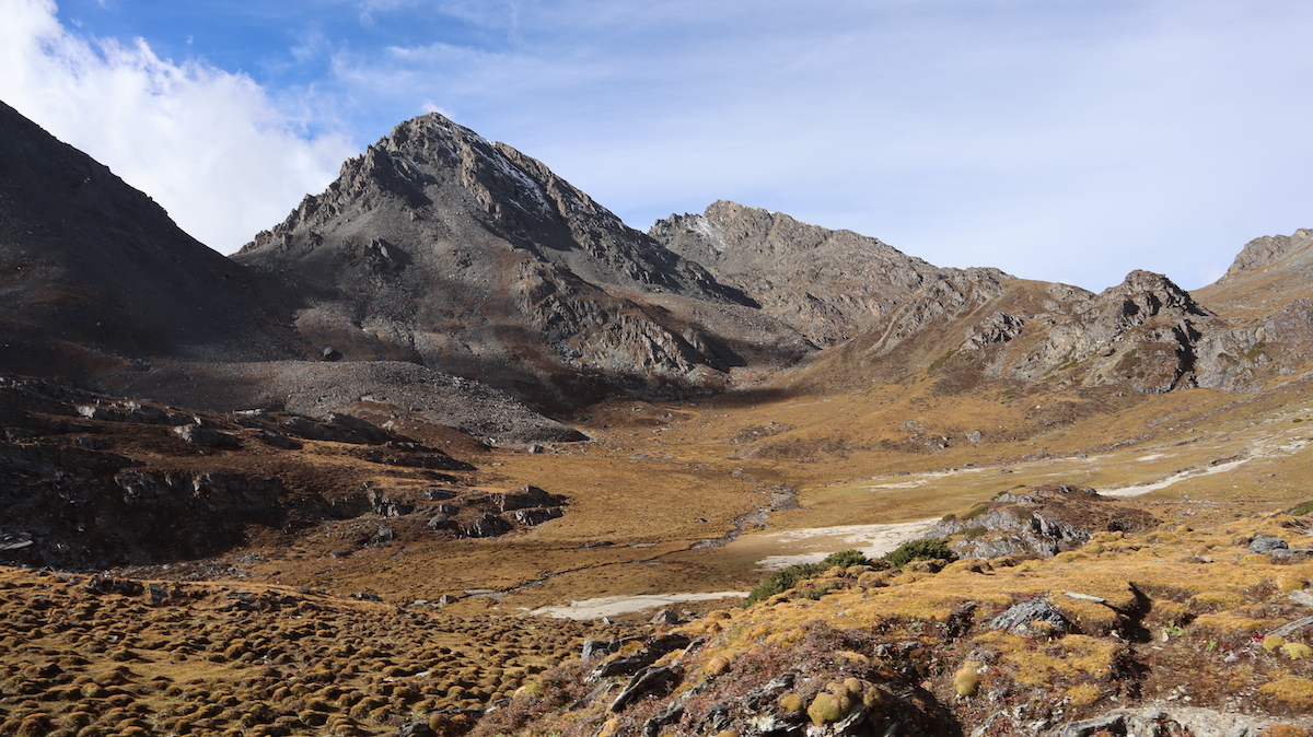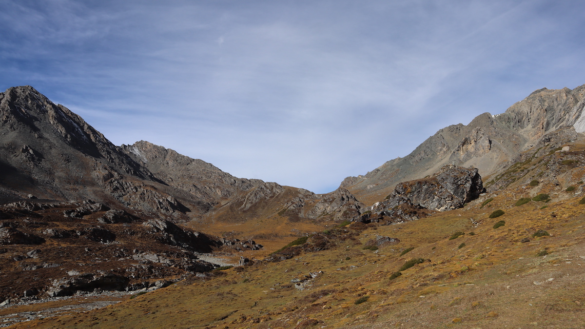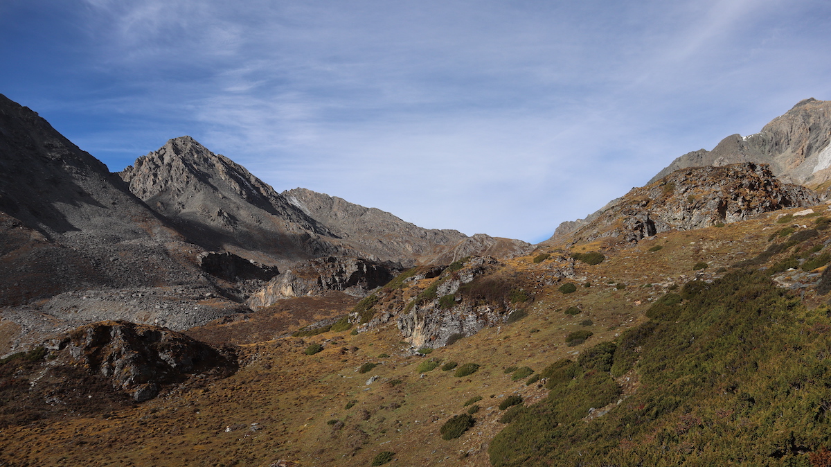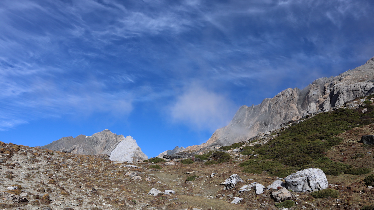 登山道をさらに進むと氷河で削られたカールのようなところに出た。一面褐色の世界が広がっている。カールを横切り、少し進むと海抜5036mの錯該達埡口(峠)に着いた。念願の峠越えである。登山口の呷洛村から1850mほど登ったことになる。