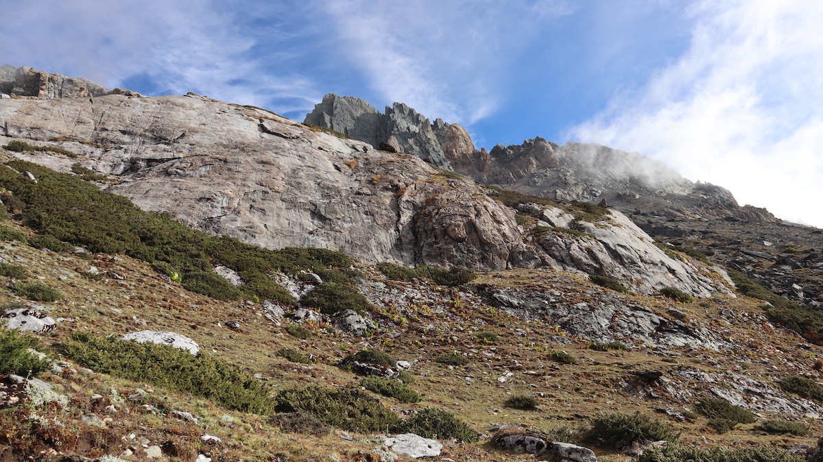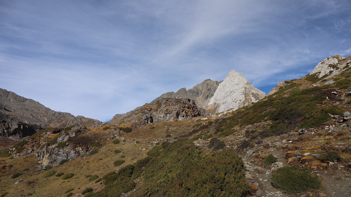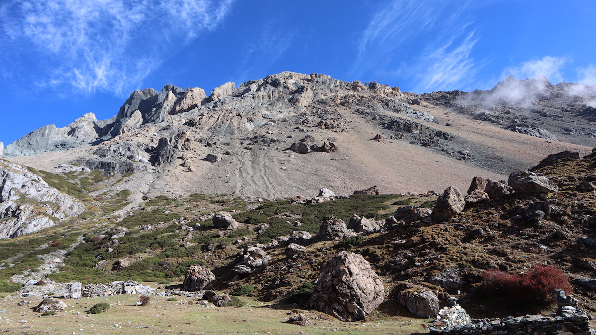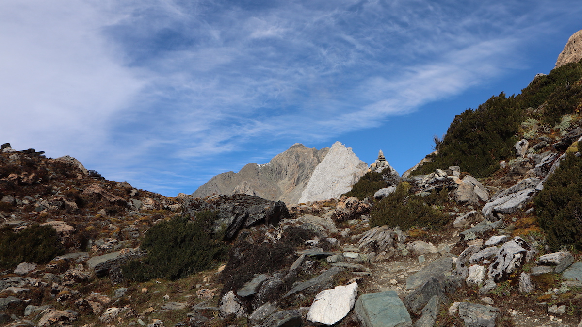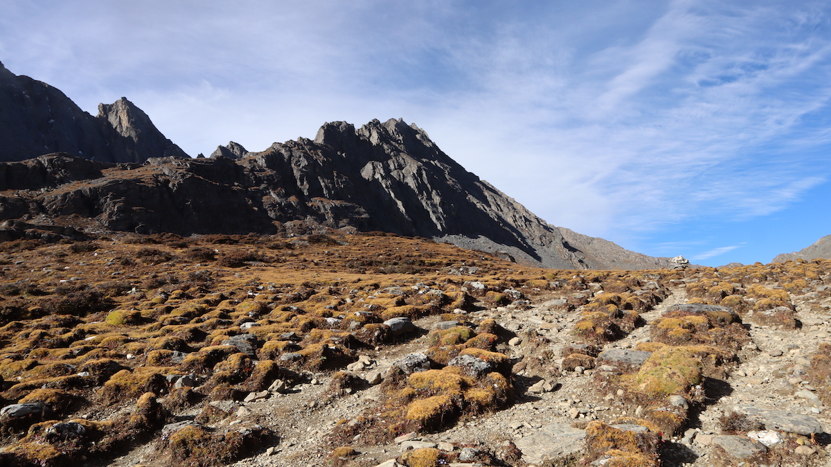 登山道をさらに進むと氷河で削られたカールのようなところに出た。一面褐色の世界が広がっている。カールを横切り、少し進むと海抜5036mの錯該達埡口(峠)に着いた。念願の峠越えである。登山口の呷洛村から1850mほど登ったことになる。