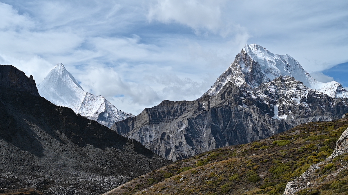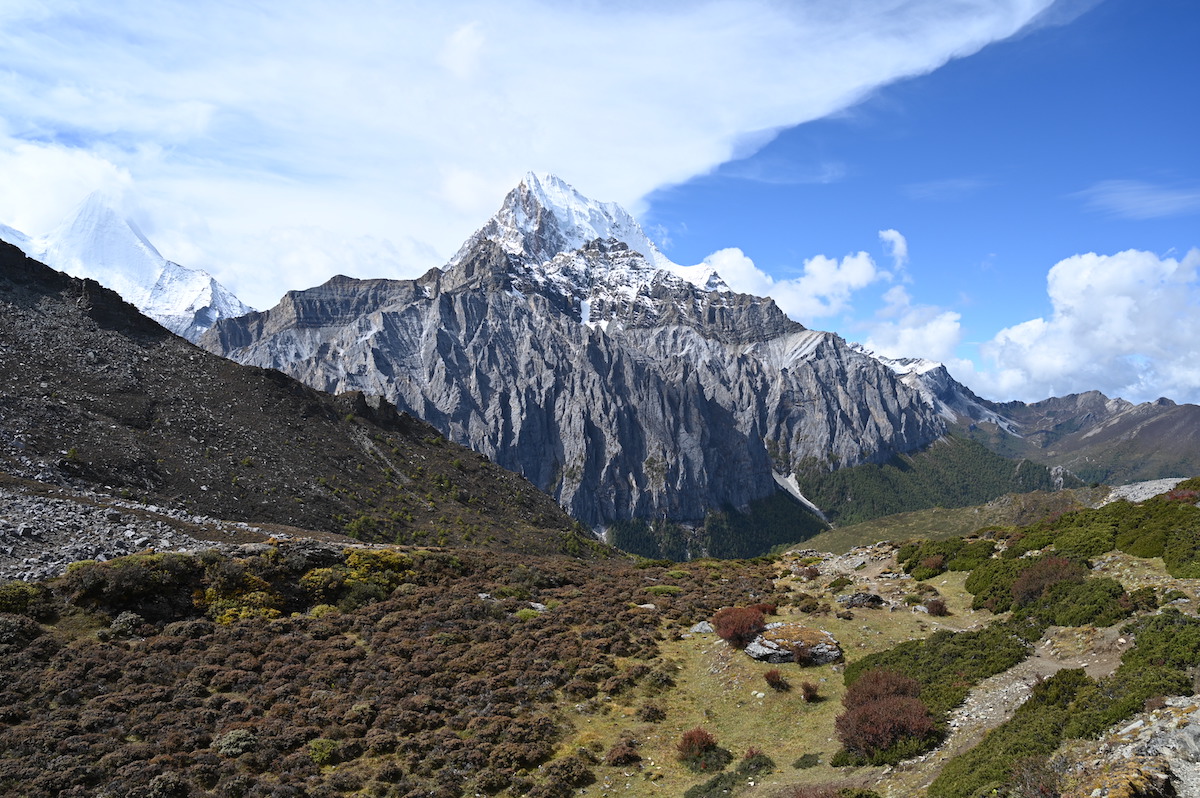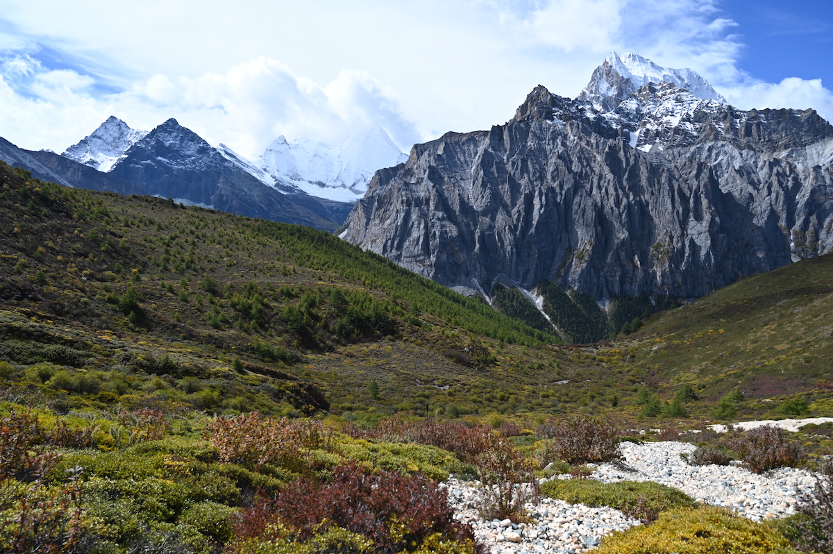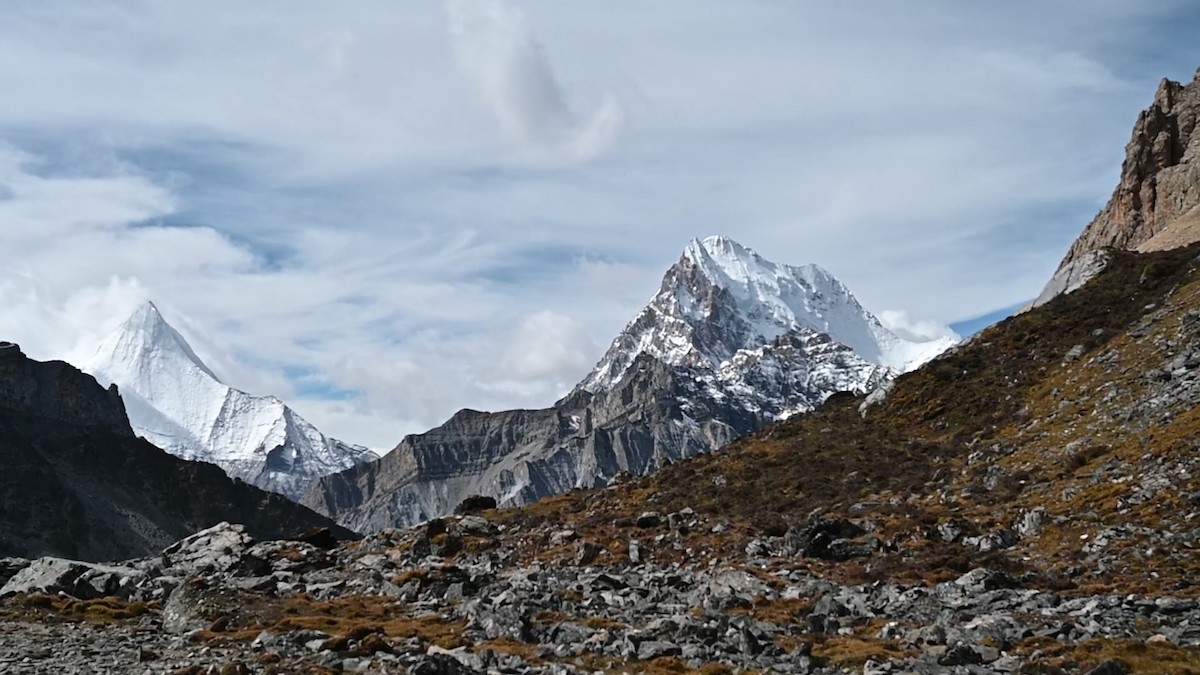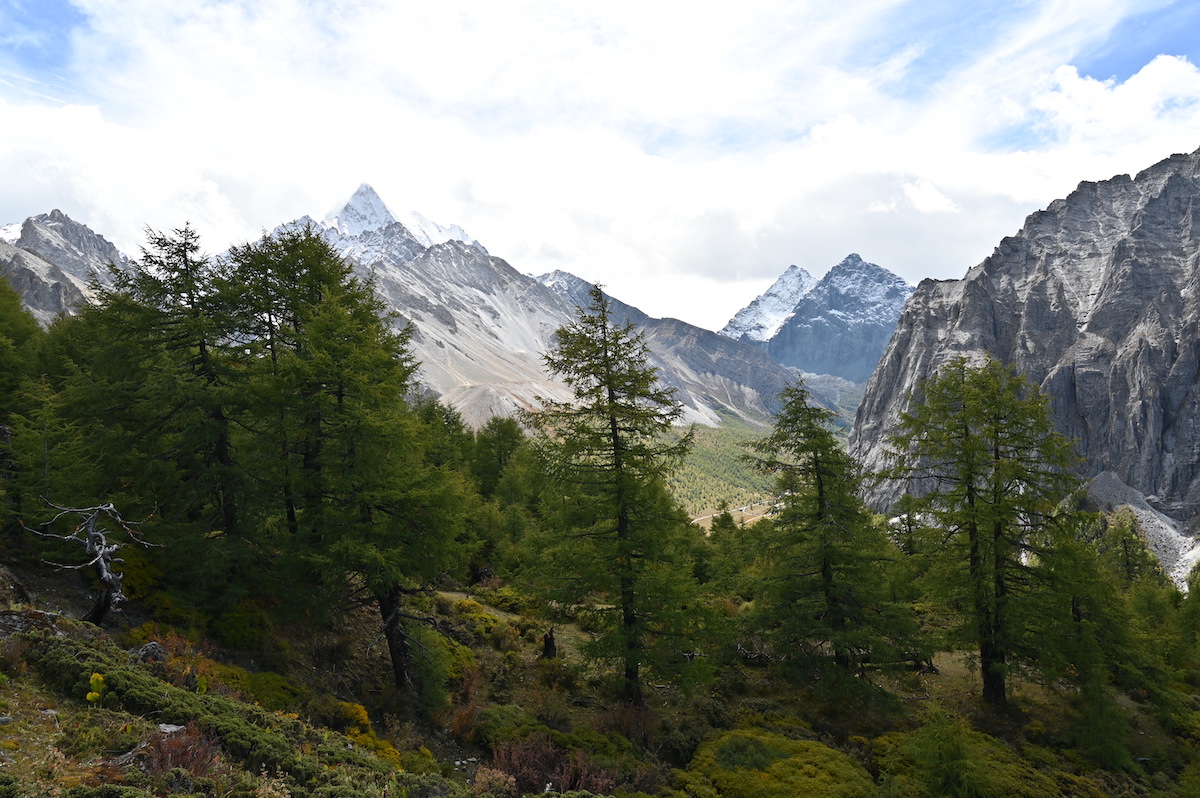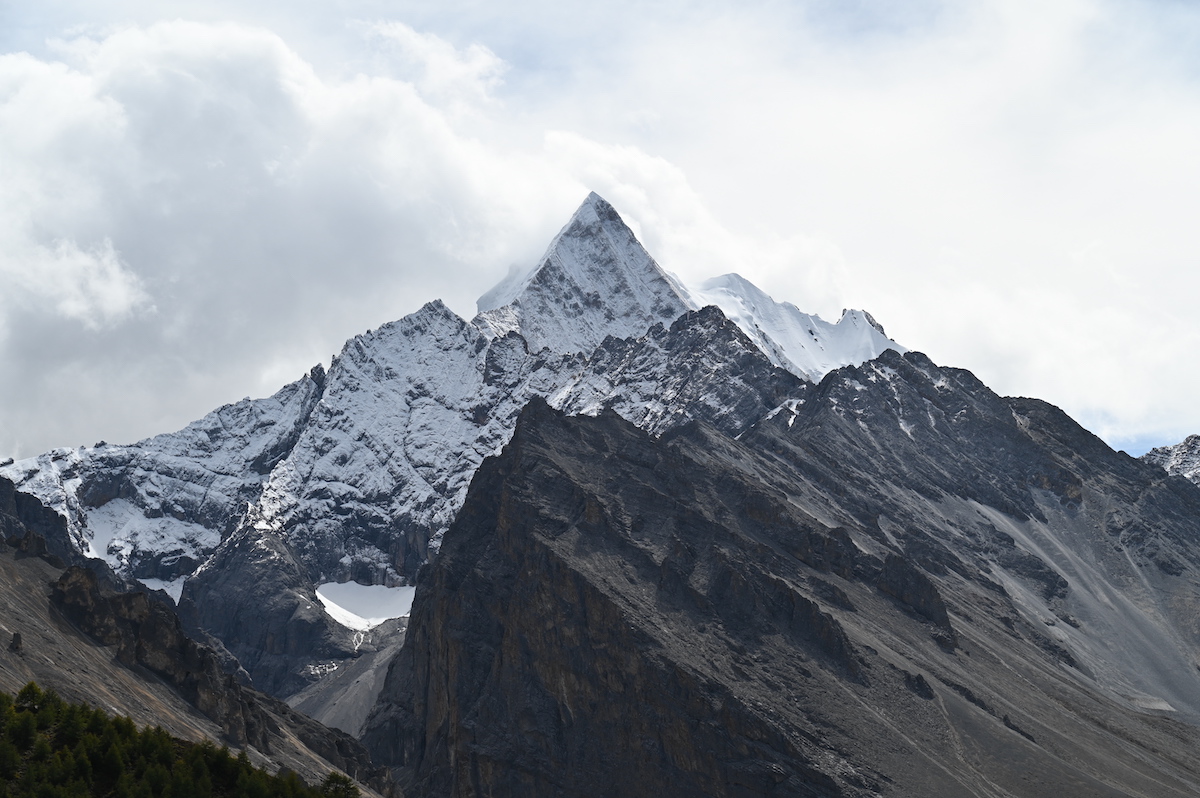 波用措(湖)の向こうに見えた峠に登ると、もう一つの神山、海抜6032mの仙乃日が見えた。峠からは央邁勇と仙乃日が並んで見える。二つの神山が仲良く並ぶ感動の風景である。