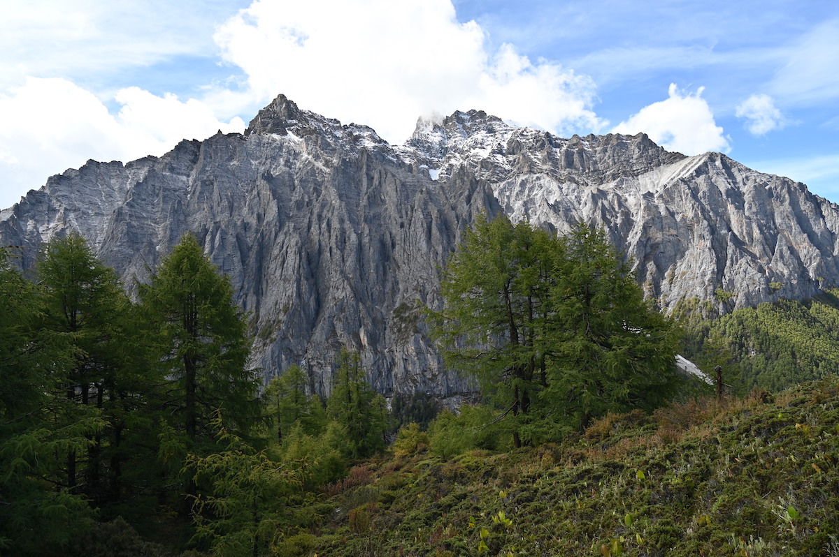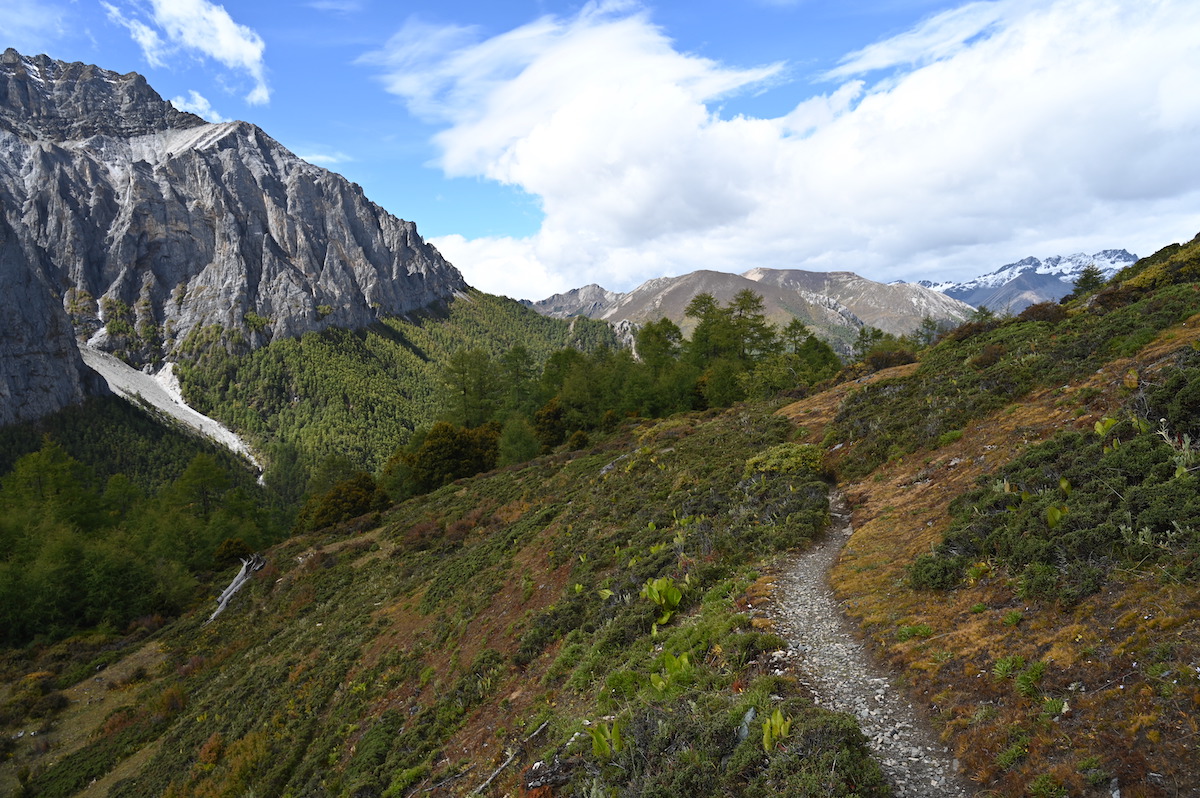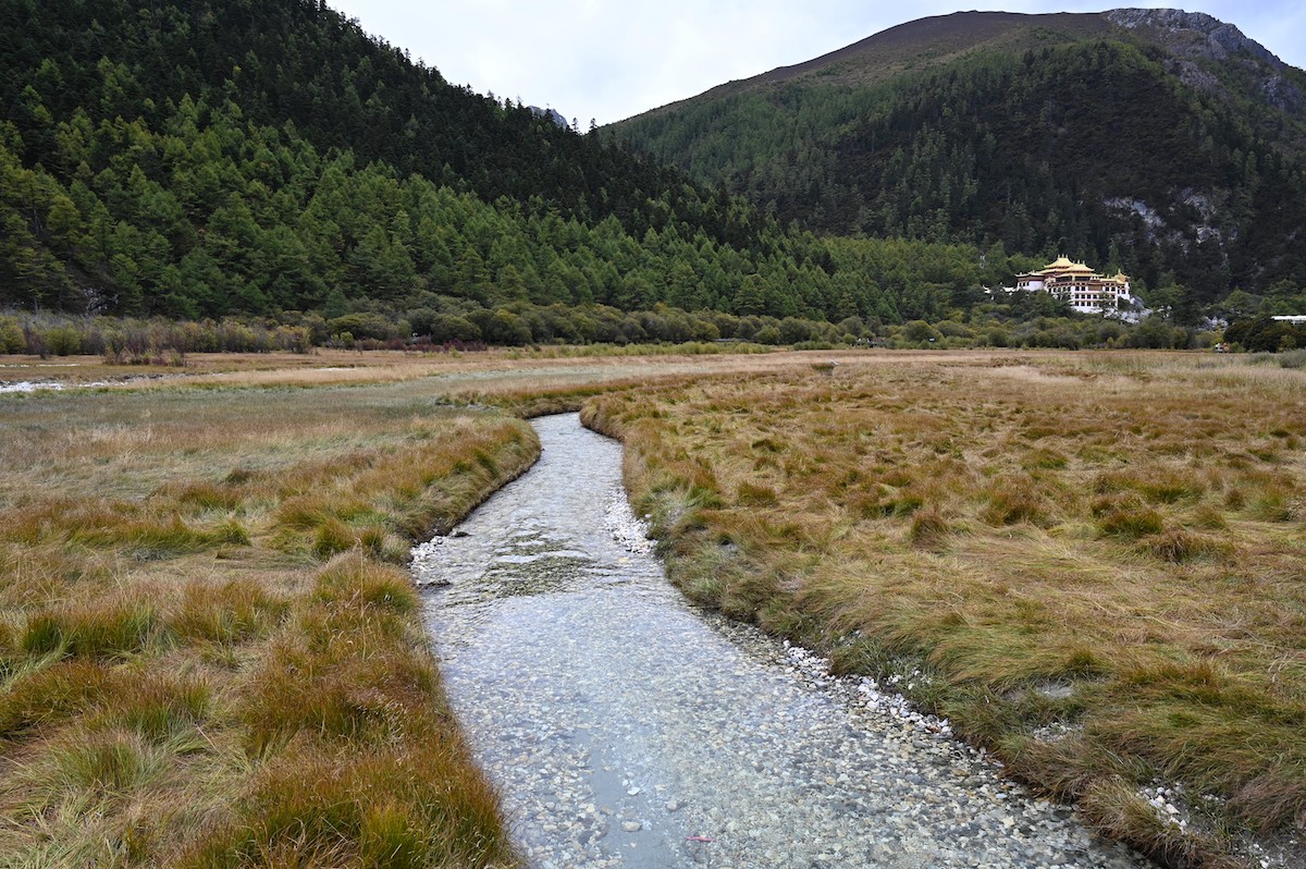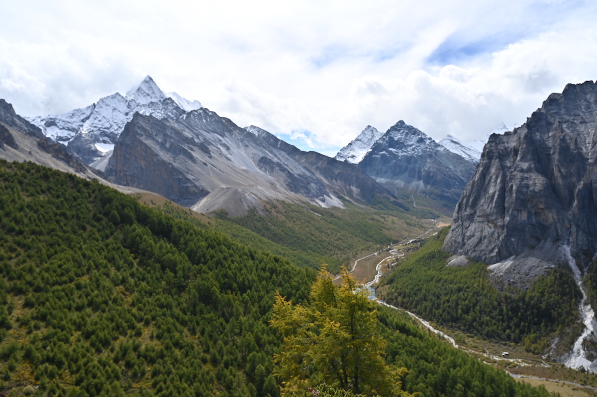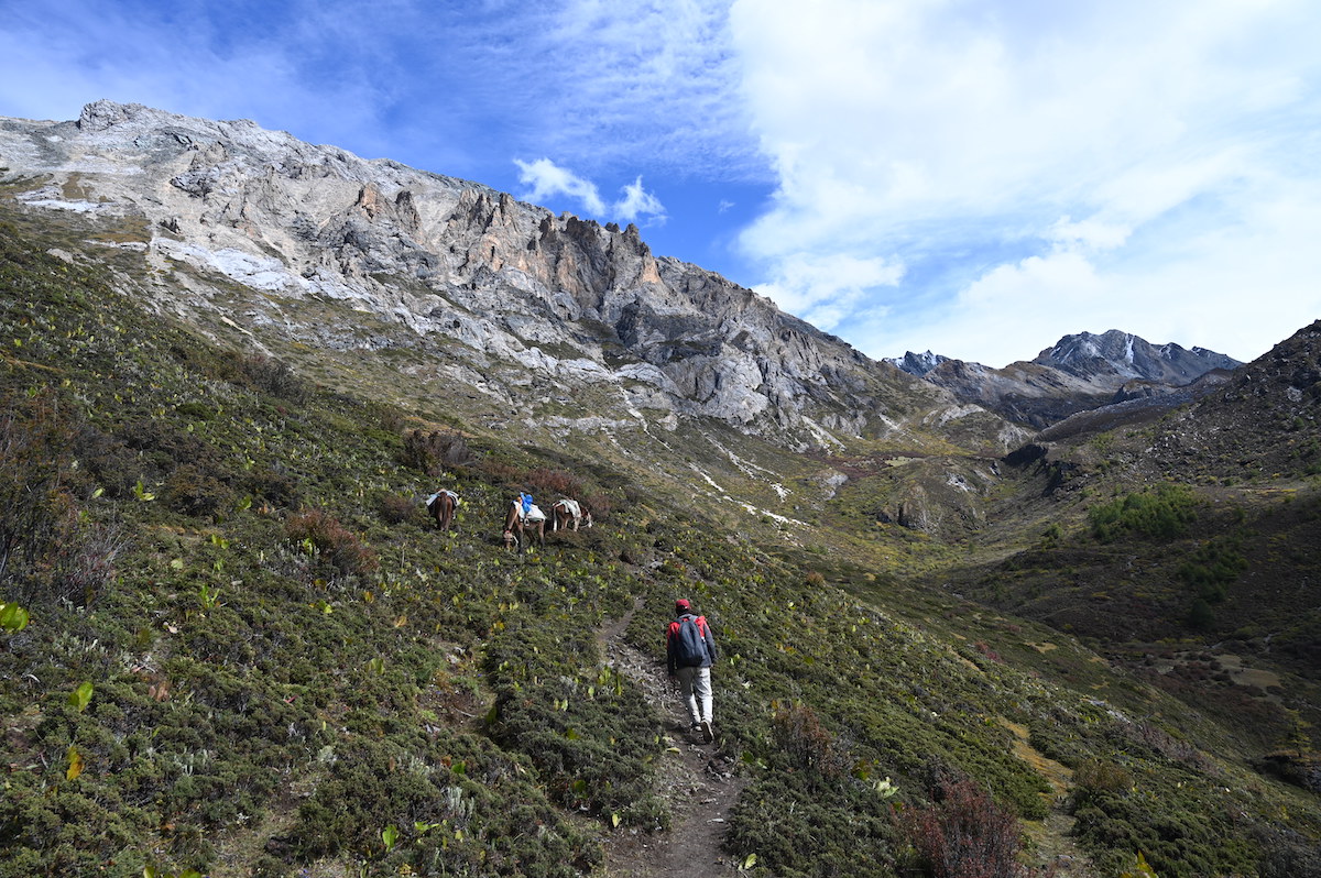 亞丁(yading)村に向かい降りて行くと仙乃日がさらに大きく見えてくる。冲古寺がある景区玄関口に近づき、ガイドのニィモさんと別れることになった。馬を連れたガイドは景区内への立ち入りが禁止されている。馬からリュックを下ろし、お世話になったニィモさんと三頭の馬に別れをつげた。馬を連れて来た道を戻るニィモさんの後ろ姿が印象的だった。時刻は12時を過ぎていた。ニィモさんは来た道を引き返し、牧場に置いていた荷物を馬に積んで、さらに村へと向かう。昨日から1日半かけてきた道を戻り、今日中に村に帰るという。その体力と気力にただ驚くばかり。あとで聞けば夜、9時頃に家に戻ったそうである。ニィモさんと別れ2時間ほどで山を下りてバス乗り場に着いた。