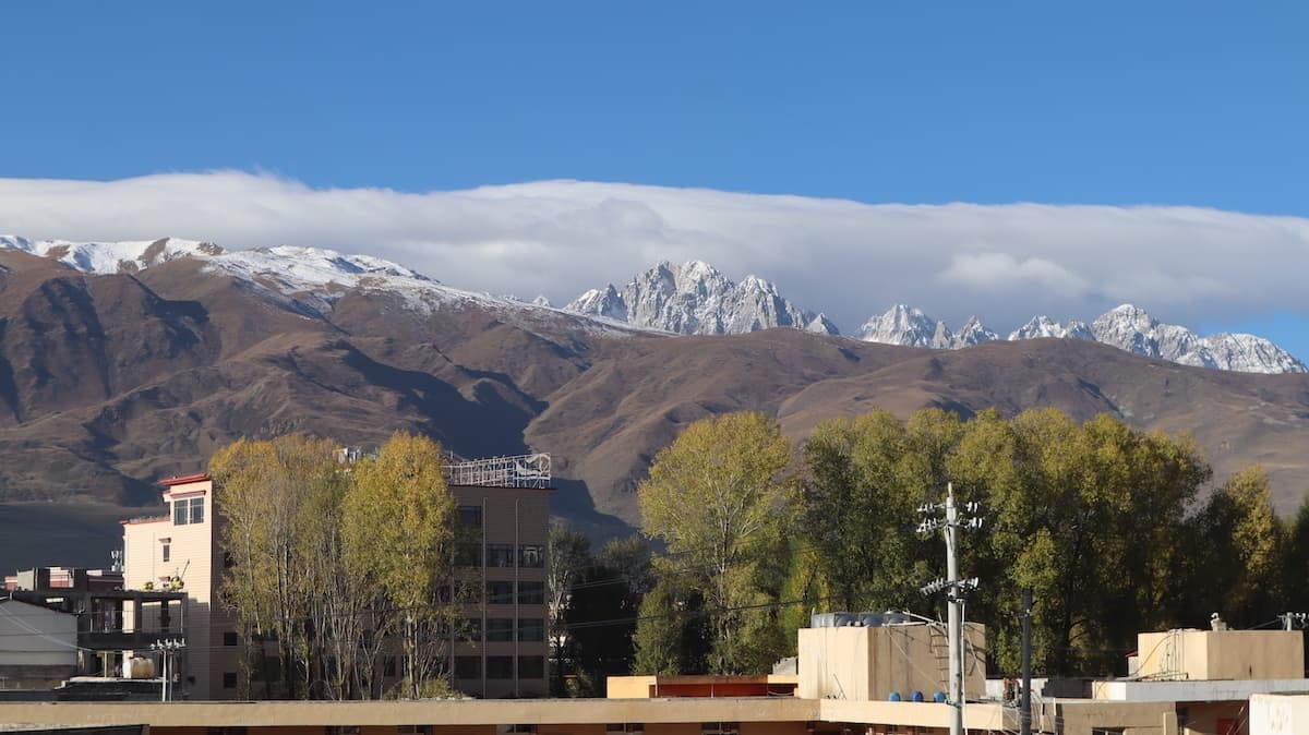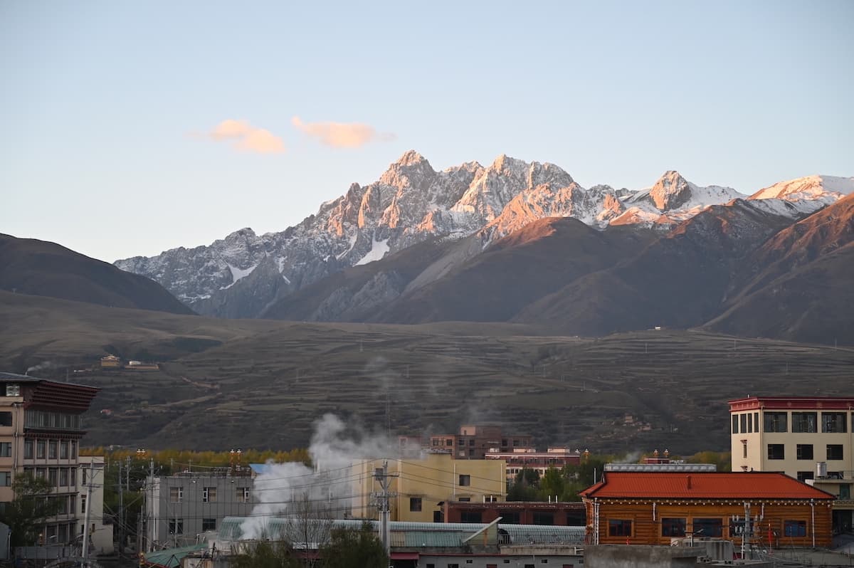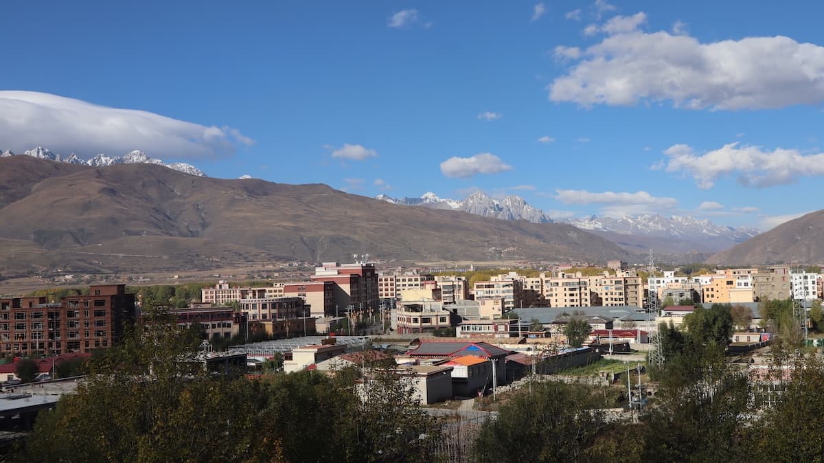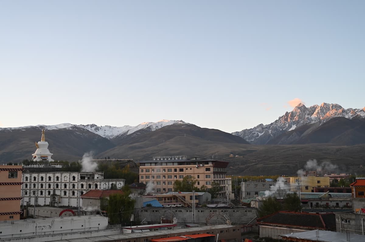 甘孜県城(県庁所在地)は国道317号線上にある美しい街だった。街の南には卓達拉山が優美な姿で聳え、街の中心の丘の上には大きな白塔があり、街のあちこちで温泉の湯けむりが昇っている。甘孜はチベット語で白く神聖の意味。温泉の煙が白いからなのか。