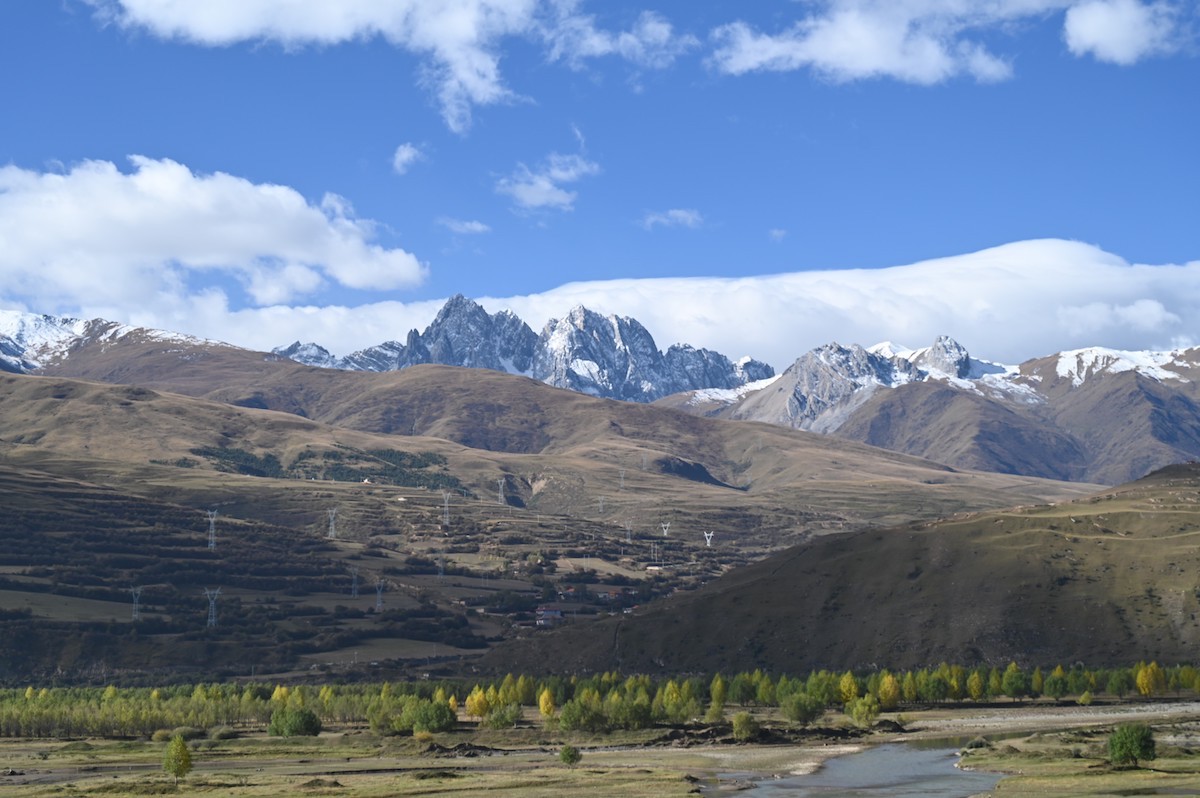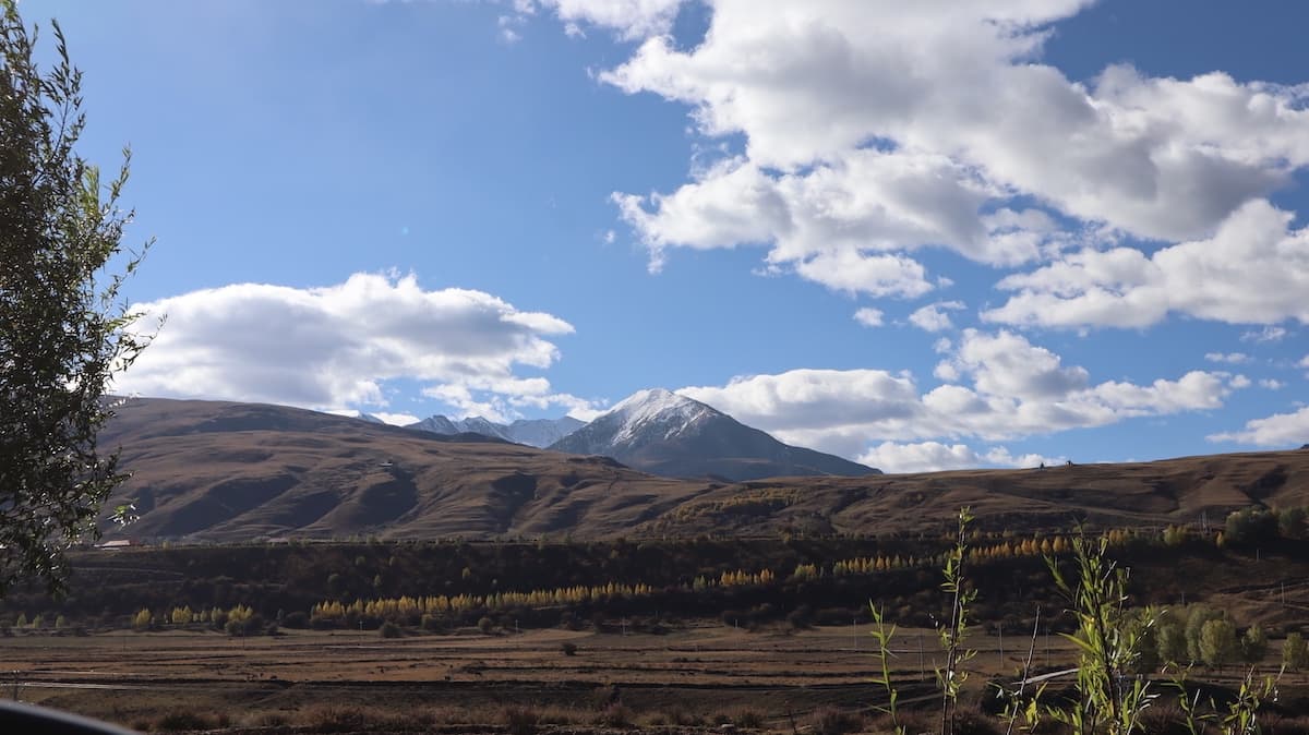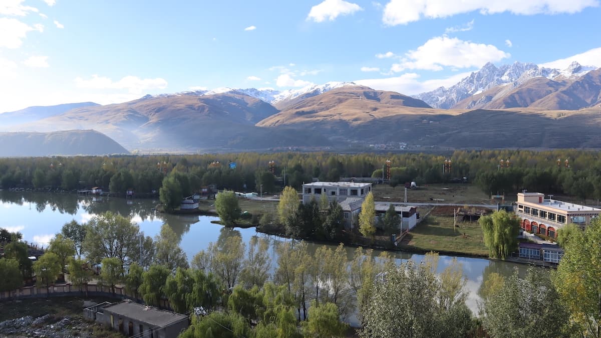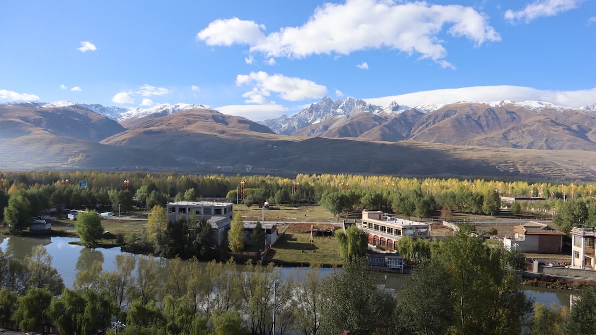 甘孜県城(県庁所在地)は国道317号線上にある美しい街だった。街の南には卓達拉山が優美な姿で聳え、街の中心の丘の上には大きな白塔があり、街のあちこちで温泉の湯けむりが昇っている。甘孜はチベット語で白く神聖の意味。温泉の煙が白いからなのか。
