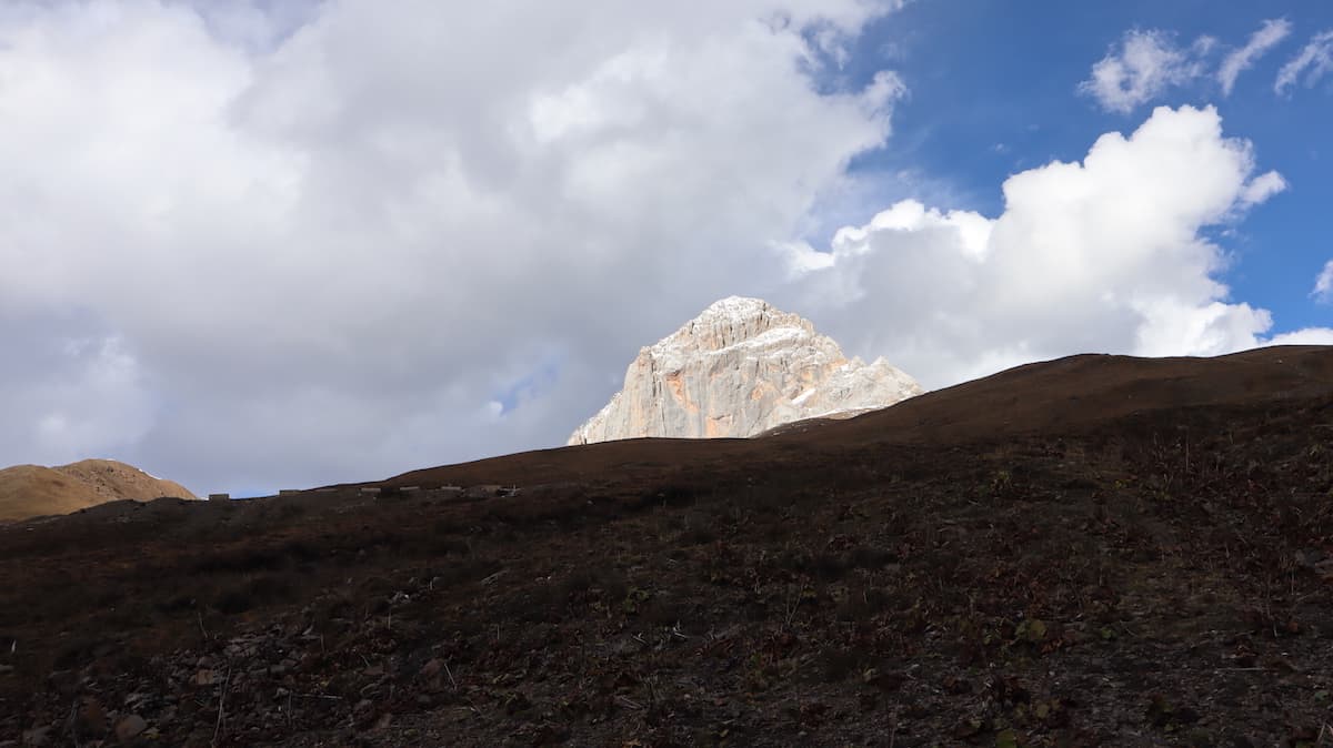 白玉方面に向かう県道を走りどこかに卓達拉山に向かう道があるだろうと思い走ったがなかなか見当たらない。途中に検問所があり聞いてみたが、わからない。しかたなく道を引き返し、途中、峠に向かう細い道があった。たぶんこれだろうと思い山の上に登っていくと緑の無い岩山の卓達拉山が見えた。丁度、雲が切れて卓達拉山は陽に照らされて輝き、そこには神山の気が漂っていた。
