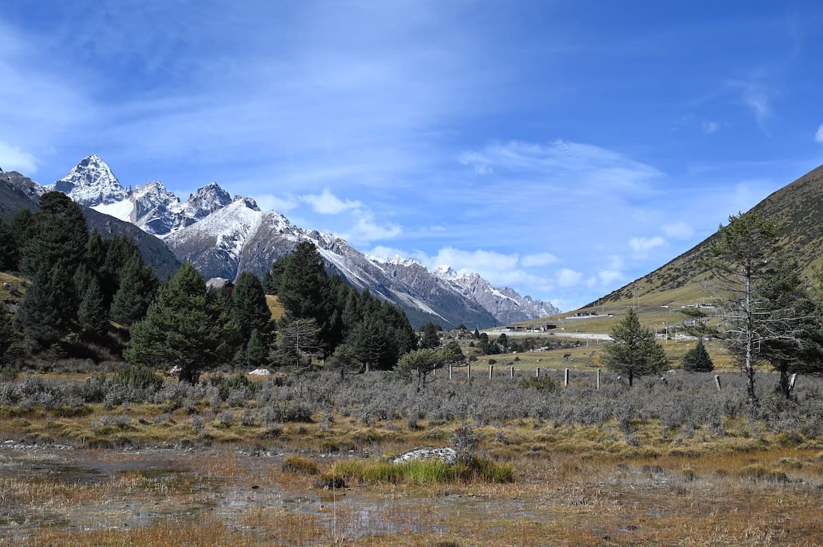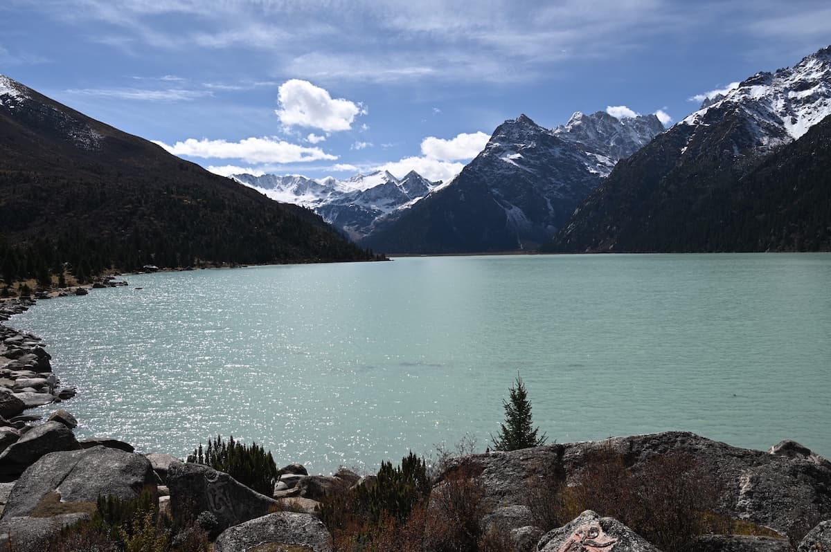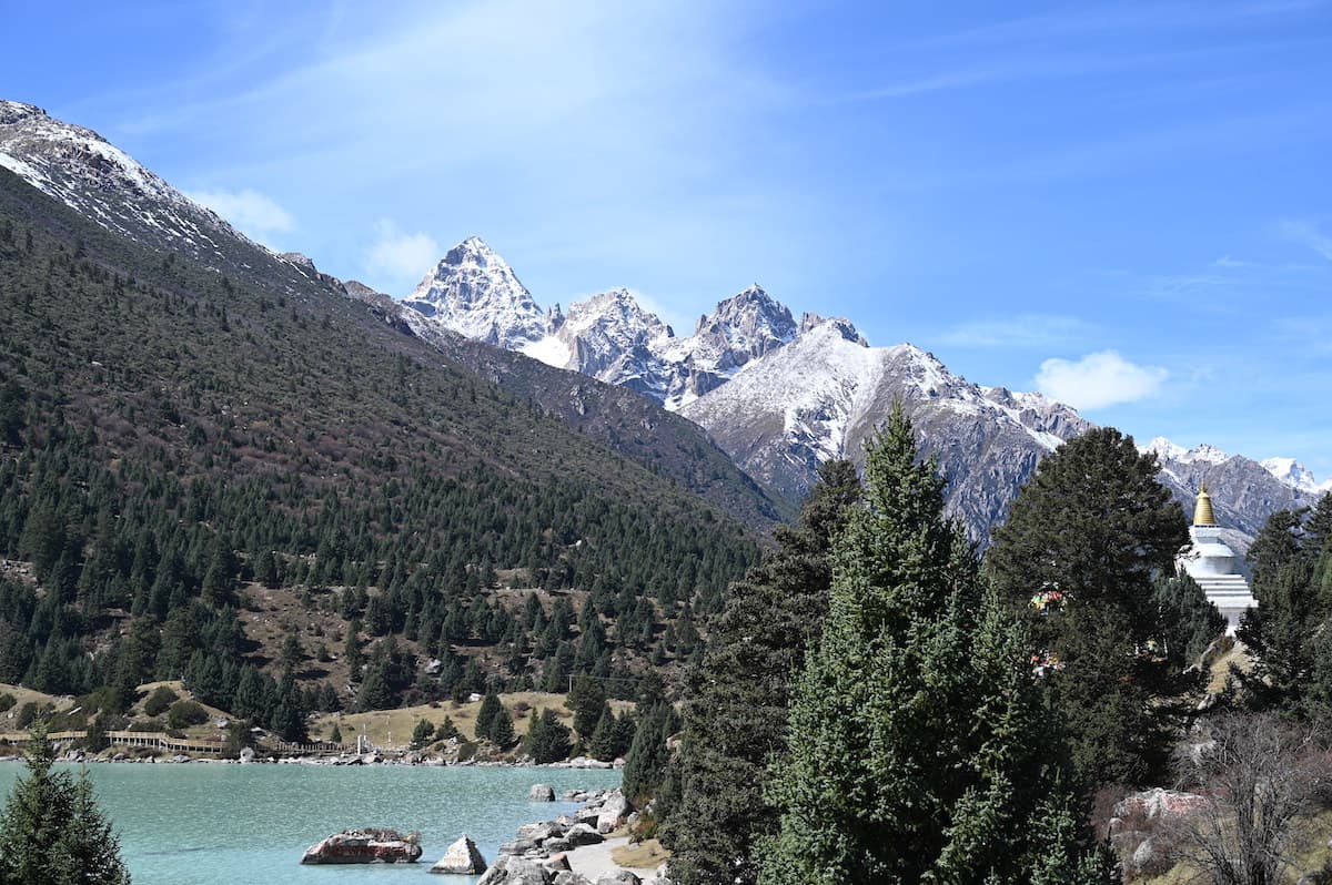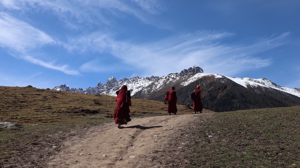 雀兒山口(峠)をさらに東に向かうとほどなく新路海という湖に着く。海抜4040mにある面積6.2㎢の氷河湖である。チベット語で玉龍拉措と呼ばれる。玉龍は心が清真、拉措は神湖を表す。湖水は四川省西部の雅礱江に流れ、やがて金沙江となり、さらに揚子江となる。湖の周囲には高原と雪山が拡がり、湖と川、雪山の美しく雄大な風景が見られた。紅色の僧衣を着た修行僧が三人、湖に向かって歩いていた。その向こうに雪山が見える絵のような風景に出あった。四川省西部では、よくそんな若い修行僧に出会う。僧衣が風になびきその向こうに美しい雪山が見える風景が旅愁を誘う。