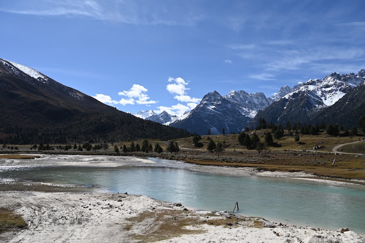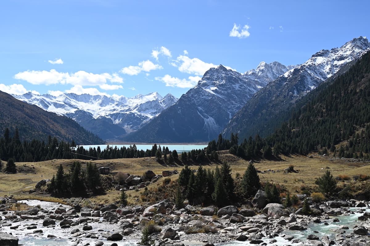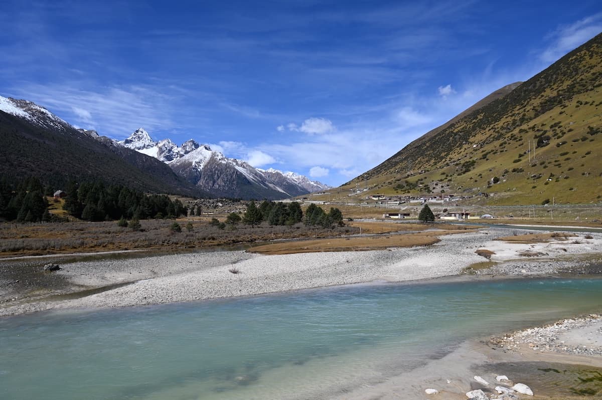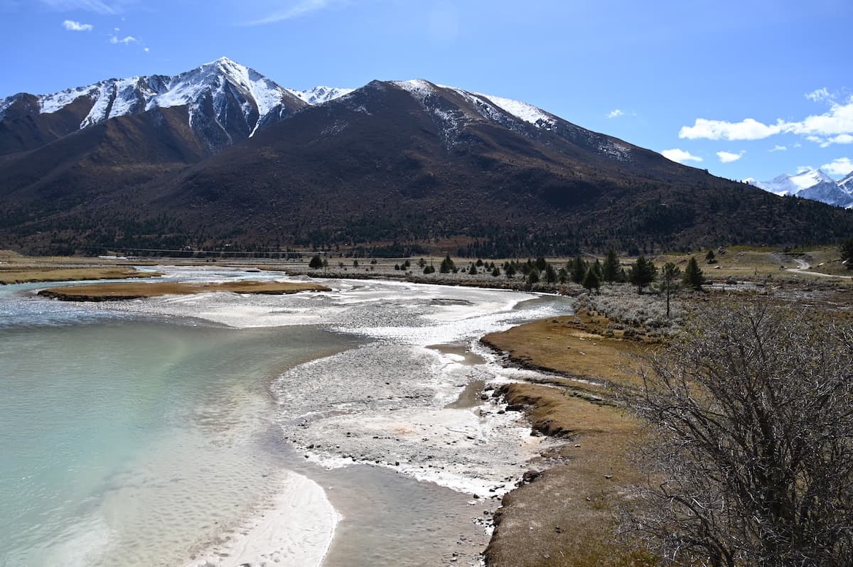 雀兒山口(峠)をさらに東に向かうとほどなく新路海という湖に着く。海抜4040mにある面積6.2㎢の氷河湖である。チベット語で玉龍拉措と呼ばれる。玉龍は心が清真、拉措は神湖を表す。湖水は四川省西部の雅礱江に流れ、やがて金沙江となり、さらに揚子江となる。湖の周囲には高原と雪山が拡がり、湖と川、雪山の美しく雄大な風景が見られた。紅色の僧衣を着た修行僧が三人、湖に向かって歩いていた。その向こうに雪山が見える絵のような風景に出あった。四川省西部では、よくそんな若い修行僧に出会う。僧衣が風になびきその向こうに美しい雪山が見える風景が旅愁を誘う。