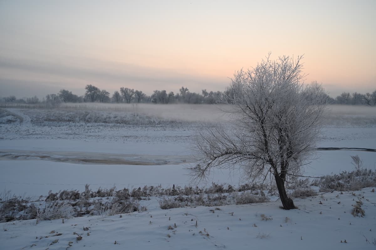 昨日、霧氷の無い時に来た、存在感のある1本の木が立つ場所に再び向かった。雪で真っ白なトウモロコシ畑の真ん中で、白い着物を着たようにその木は姿を変えていた。うっとりするような美しさで、まるでトウモロコシ畑の雪原に立つ妖精である。木の近くを流れる川に目を向けると、霧がたちこめている。霧の向こうには、ぼんやりとした朝焼けの日の出が見える。後に日本でその写真を見た知人は、ターナーの絵のような景色と語った。