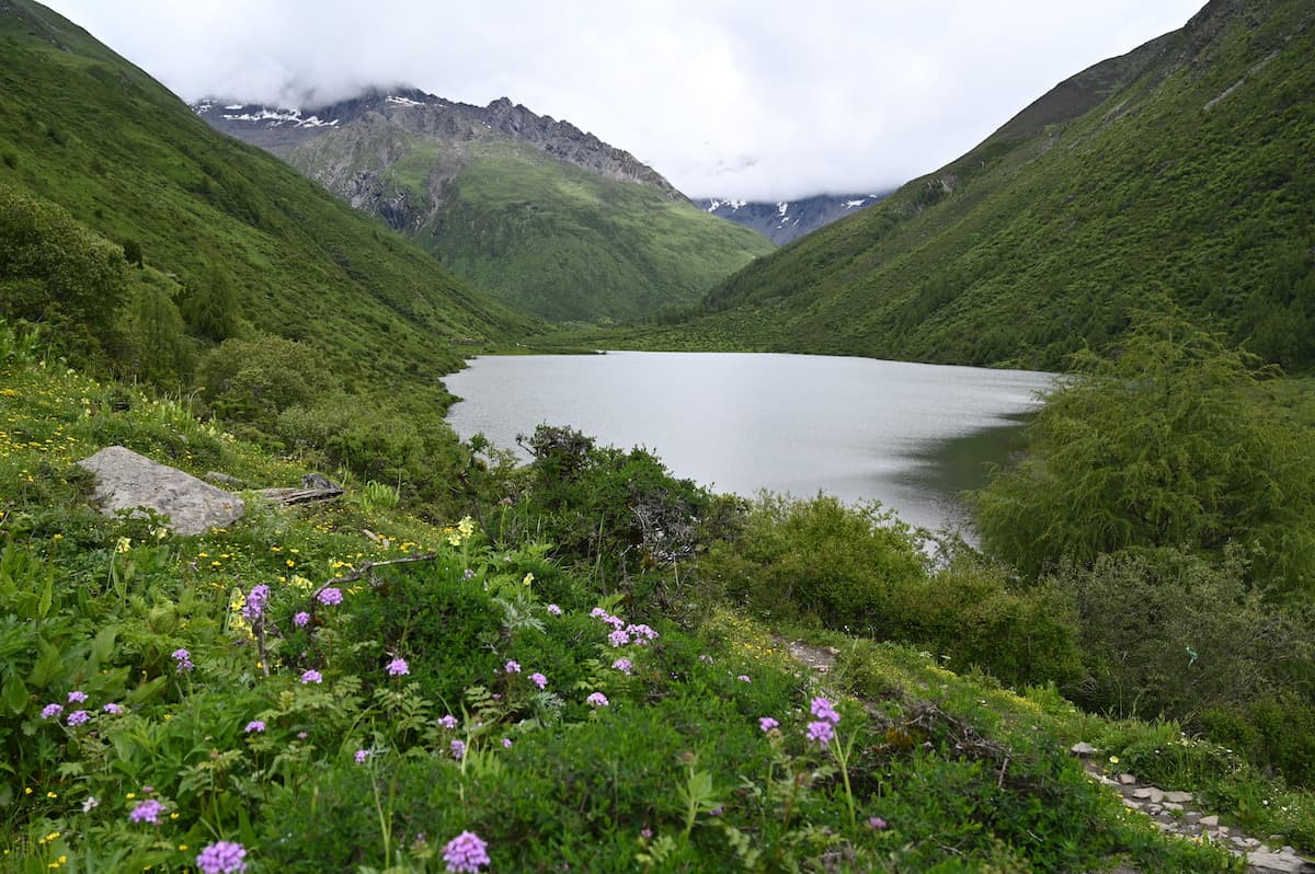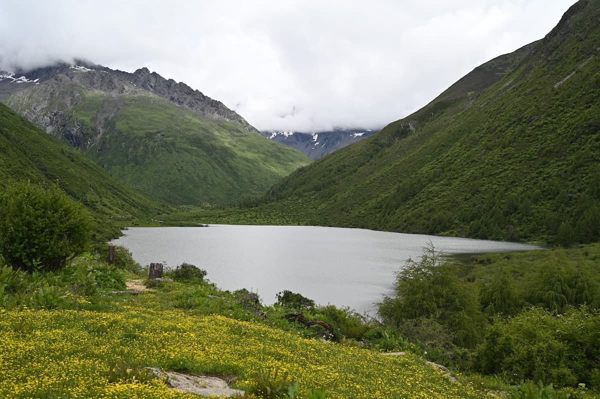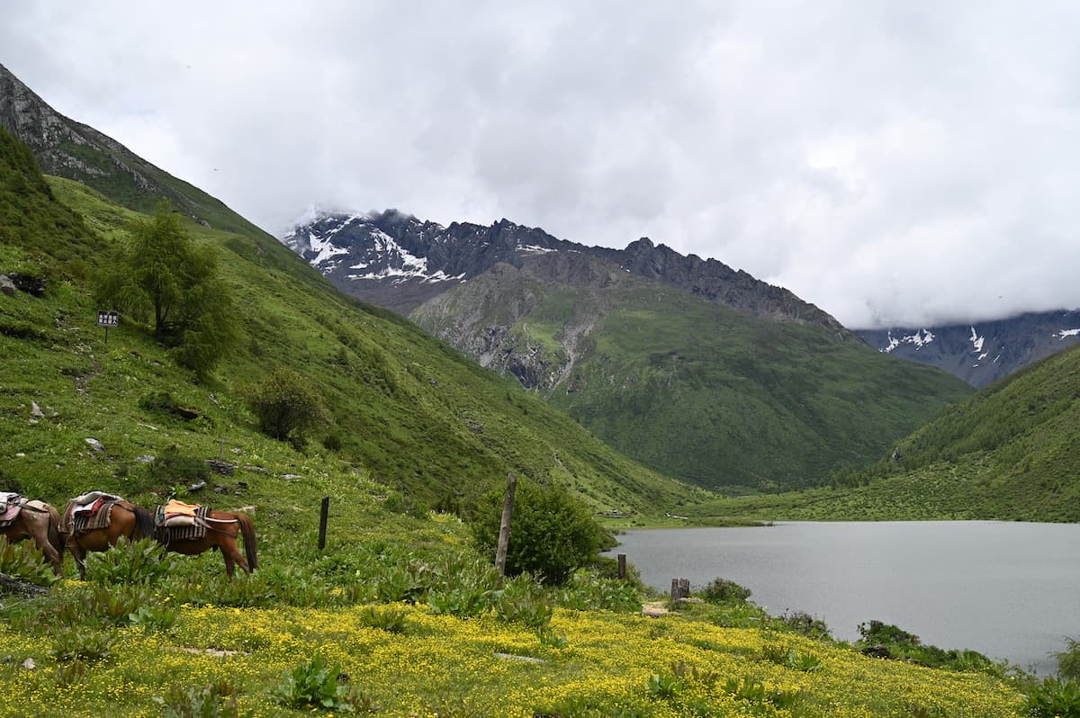 馬に乗ったり、下りて歩いたりを繰り返しながら海子溝のビューポイントの一つ、大海子に着いた。湖畔に花が咲き、湖の向こうに四姑娘山大峰が見える。6年前の秋、その山に登ったと思いながら、再び訪れることができた感慨に浸る。