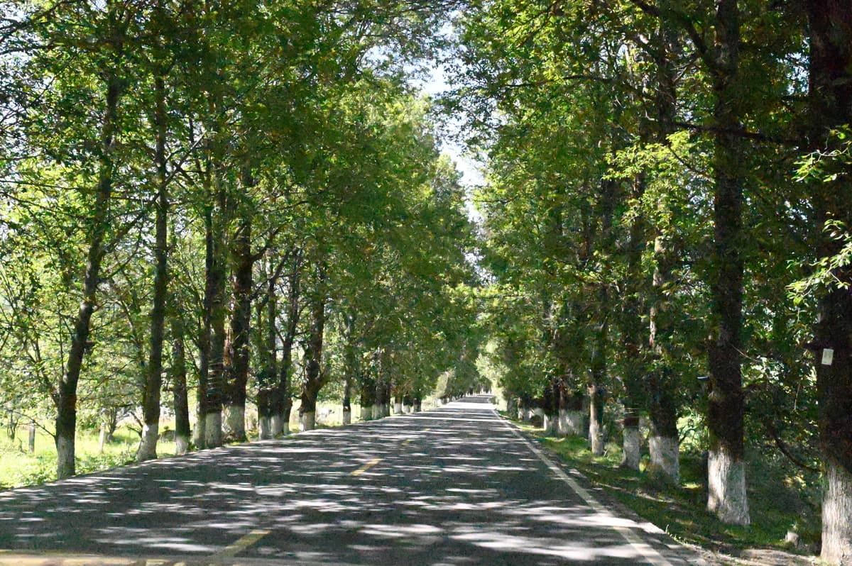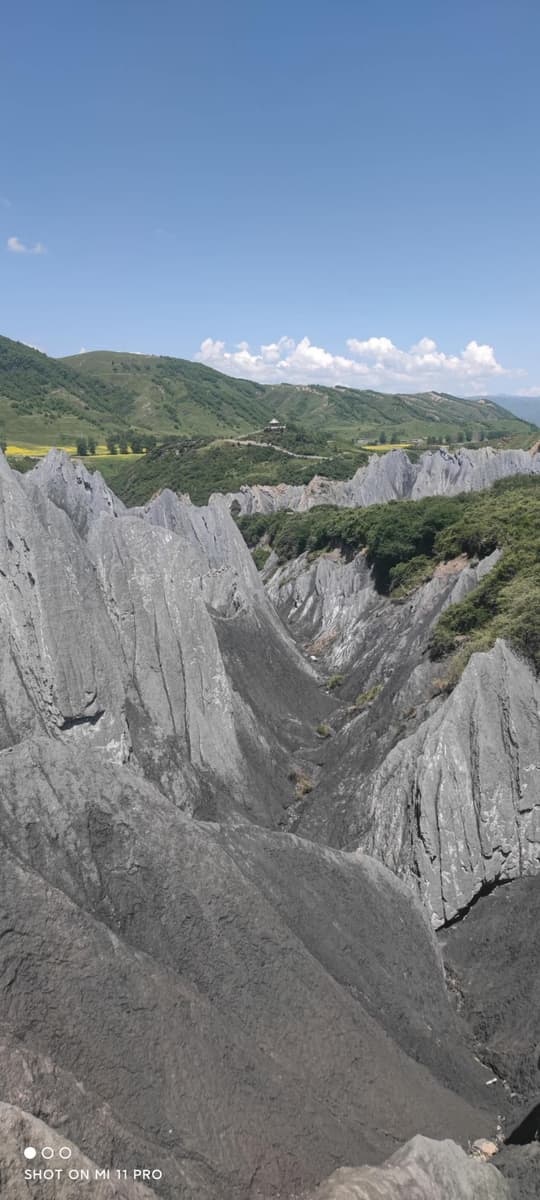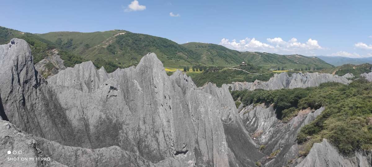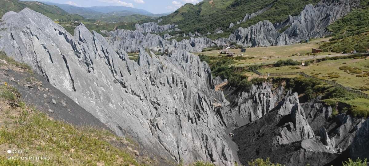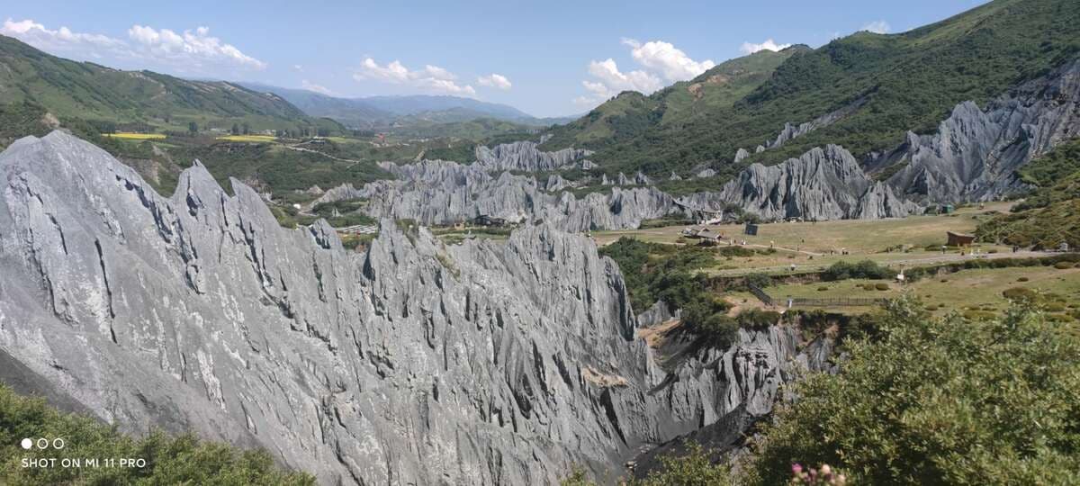 道フから南、国道318号の新都橋に向かうと八美を通る。八美は紅葉の美しいところ(感動中国100第65回)。八美の近くに塔公寺や塔公草原(感動中国100第19回)があり、マイロナイト岩の林立する岩の林のような墨石公園がある。カルシュウム塩の結晶水を含むため晴れた日と雨の後では岩の色が変わり、雨上がりには殊に美しい風景が見られる。