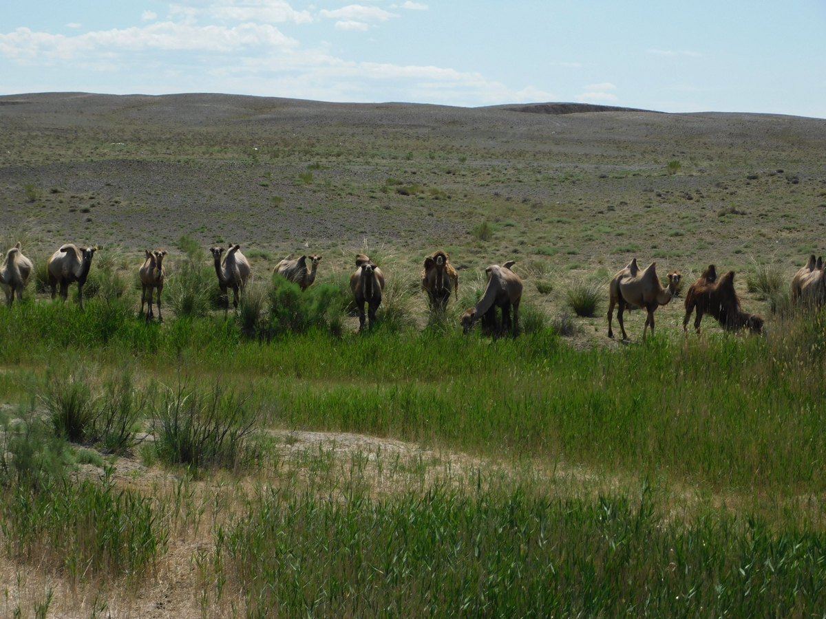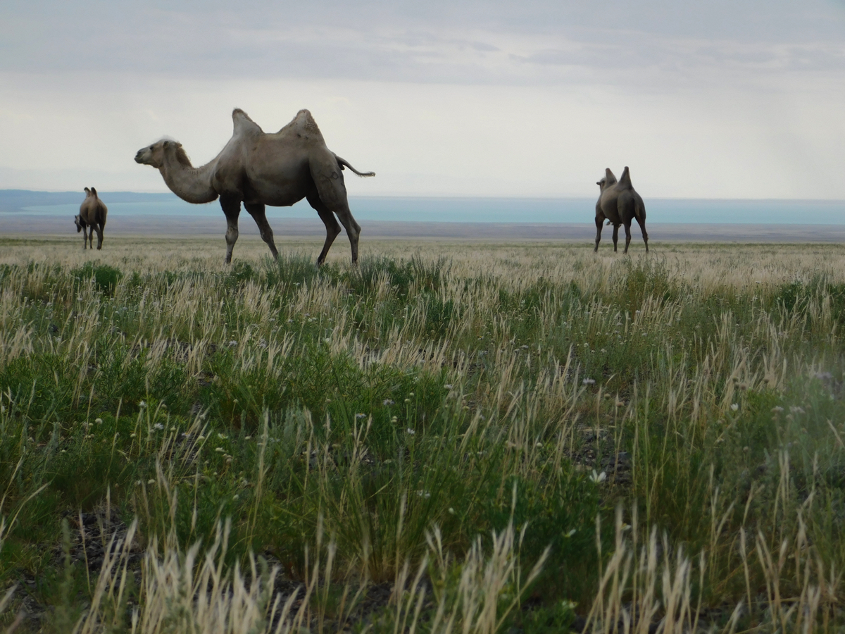 ラクダが出迎えてくれた。シルクロードの夢を見させてくれるためか、あるいは子供の頃の無邪気な心に返るためだろうか。砂漠の向こうに待つのは最後の浄土と言われるカナスである。そこに入るためのパスポートは純真な子供のような心なのかも知れない。果てしなく続くジュンガル盆地の一本道は浄土に向かうための準備の道である。自分をじっと見つめるラクダの眼がそれを問いかけているようだ。まっすぐに続く道の向こうにすばらしい“浄土”の世界が待っている。広大な大地と空、ラクダを見ているとだんだんそんな気分になっていく。そしてそれを確かめるように空に向かって両手を広げる。そんな自分の姿が“異邦人”の子供たちの姿に重なる。