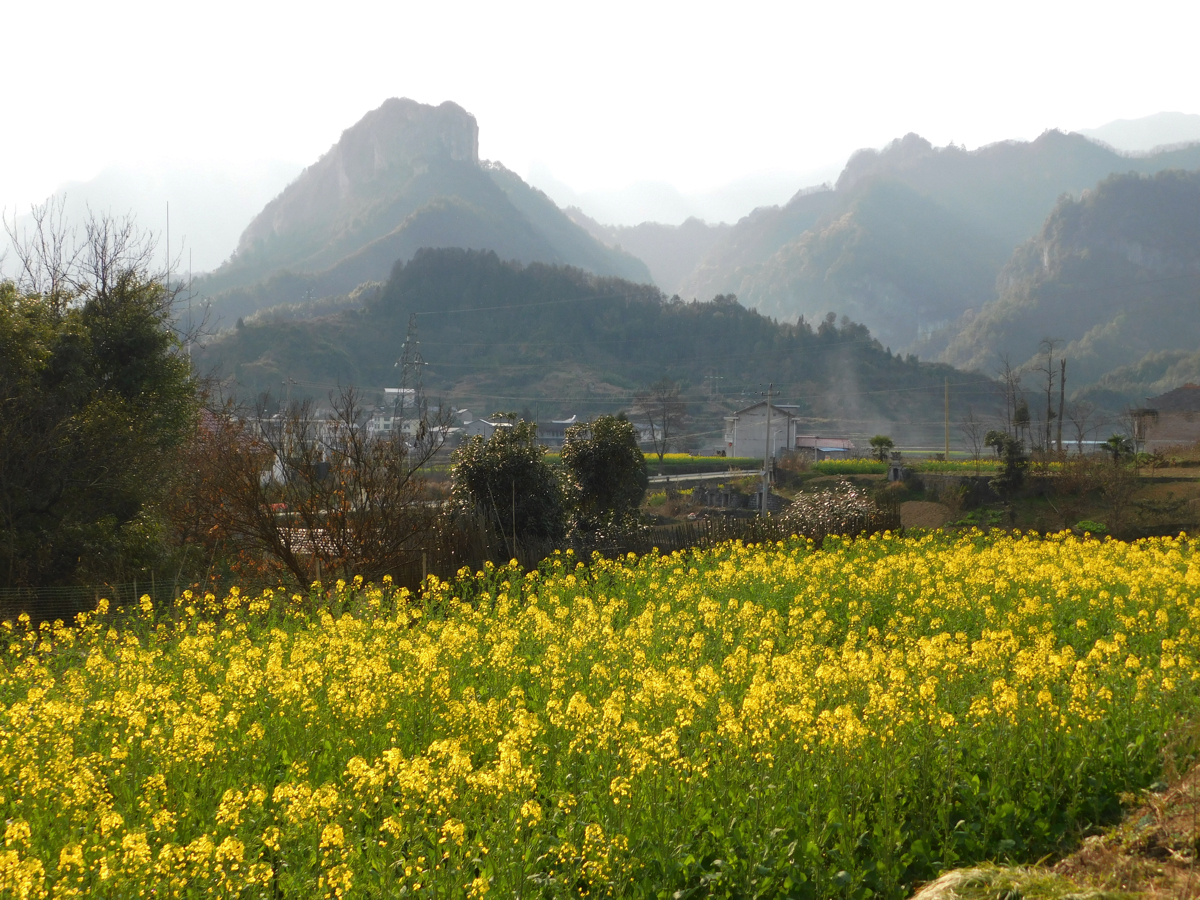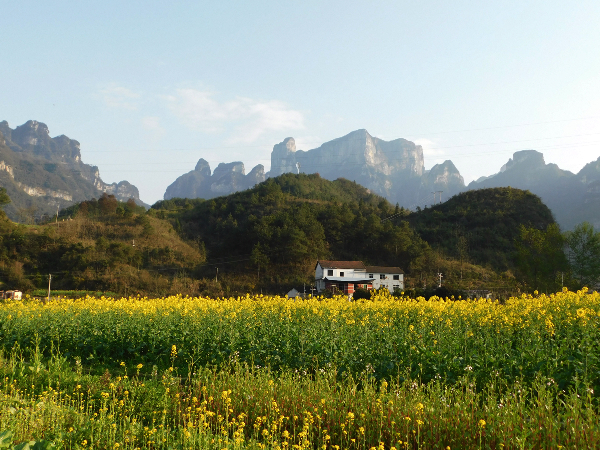 天門山の背後に回り、静かな村々をめぐった。菜の花で黄色くなった棚田、その向こうに霞む天門山。そこはまさに「桃源郷」だった。