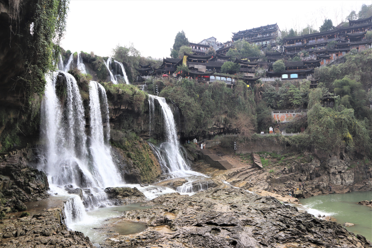 昔の名は王村と呼ぶ三方を川に囲まれた古鎮である。芙蓉鎮は春秋戦国時代に市がひらかれ漢の時代には酉陽県の役所が置かれて土家の王が住んだ都で、土家族第一の鎮(村)だった。芙蓉鎮は” 楚蜀通津“と言われる水運の要衝にあり、北は「楚」の湖北、西は「蜀」の四川、南は「黔」の貴州に川で通じている。古鎮には高さ六十m、幅四十mの大滝があり、滝の上に古い家が建ち中国でも他に見られない滝の上の古鎮である。“五里石板街”と呼ぶ石畳の通りには米豆腐や燻製肉など湘西民族菜の店が並ぶ。土家族には“毛古斯舞”と言う原始的な祭神舞踏が受け次がれている。蓑のような藁を編んだ衣装を腰にまき、頭にも麦の飾りをつけて踊る。芙蓉鎮は“小南京”と呼ばれよれ中国の四大古都の南京に例えられている。