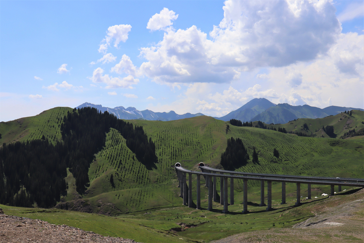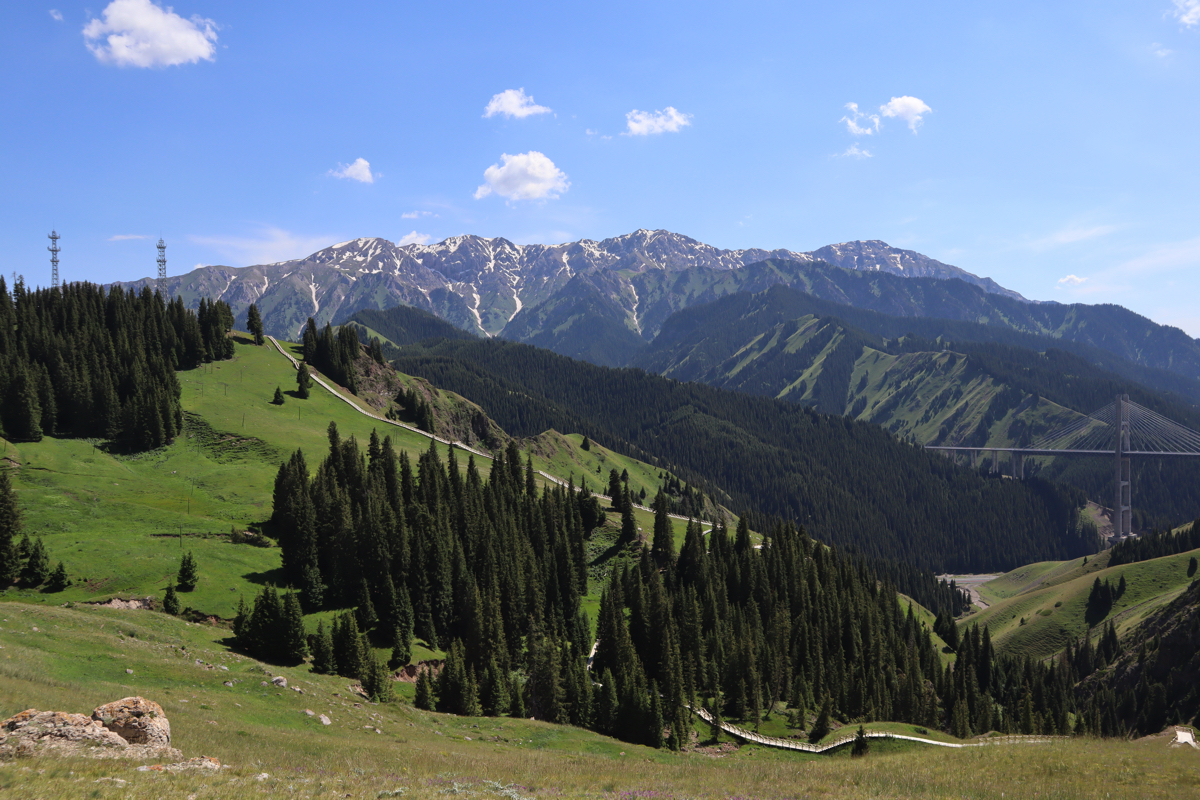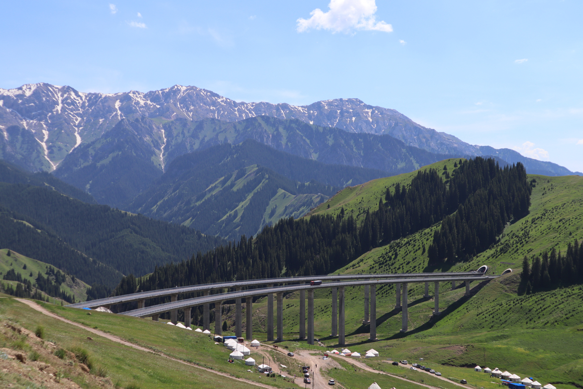 賽里木湖を過ぎると伊犁河谷に入り、雪山、草原、森林、渓谷美の果子沟(溝)風景区に着く。“奇絶仙境、万花谷”、果物の谷とも言われ、渓谷にかかる橋は西天山、イリ谷の象徴である。果子沟には江蘇省の黄海に臨む貿易港、連雲港が起点の高速道路30号線(連霍高速)が通っている。その総延長は約4,300㎞、中国最長で東の沿海から西のカザフスタンとの国境の税関、霍爾果斯(フォルクシ)まで通じる中国の国土の大きさを体験できる道である。中国の高速道路を走ると道路案内に1,000㎞とか2,000㎞とかの距離を目にし、日本にはない長い距離に感動するが、連霍高速はその比でない。極東から中央アジアまでの道である。そこに果子沟峡谷を跨ぐ果子沟大橋がかかっている。中国語で果子は果物。果子沟はフルーツの谷で峡谷とその向こうの雪山を見ていると西天山に深く刻まれた伊犁(イリ)河谷に入ってきたことを実感する。