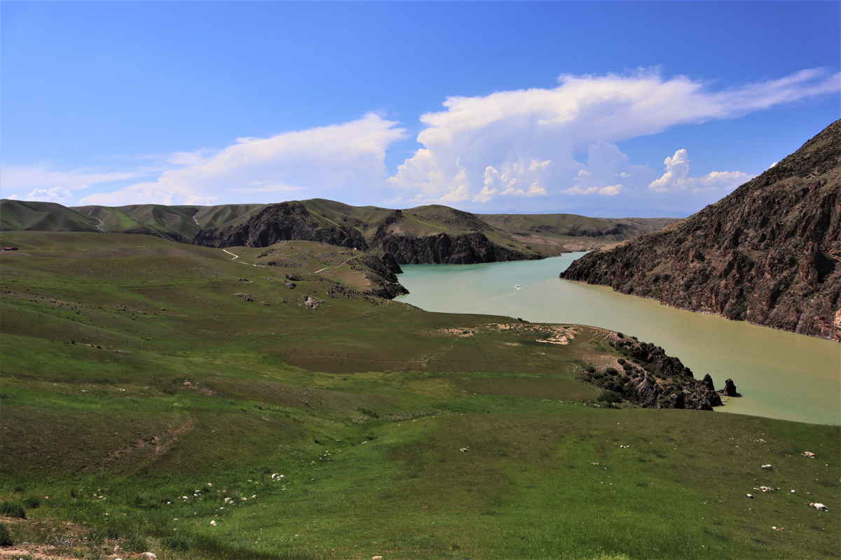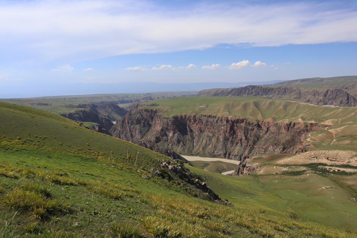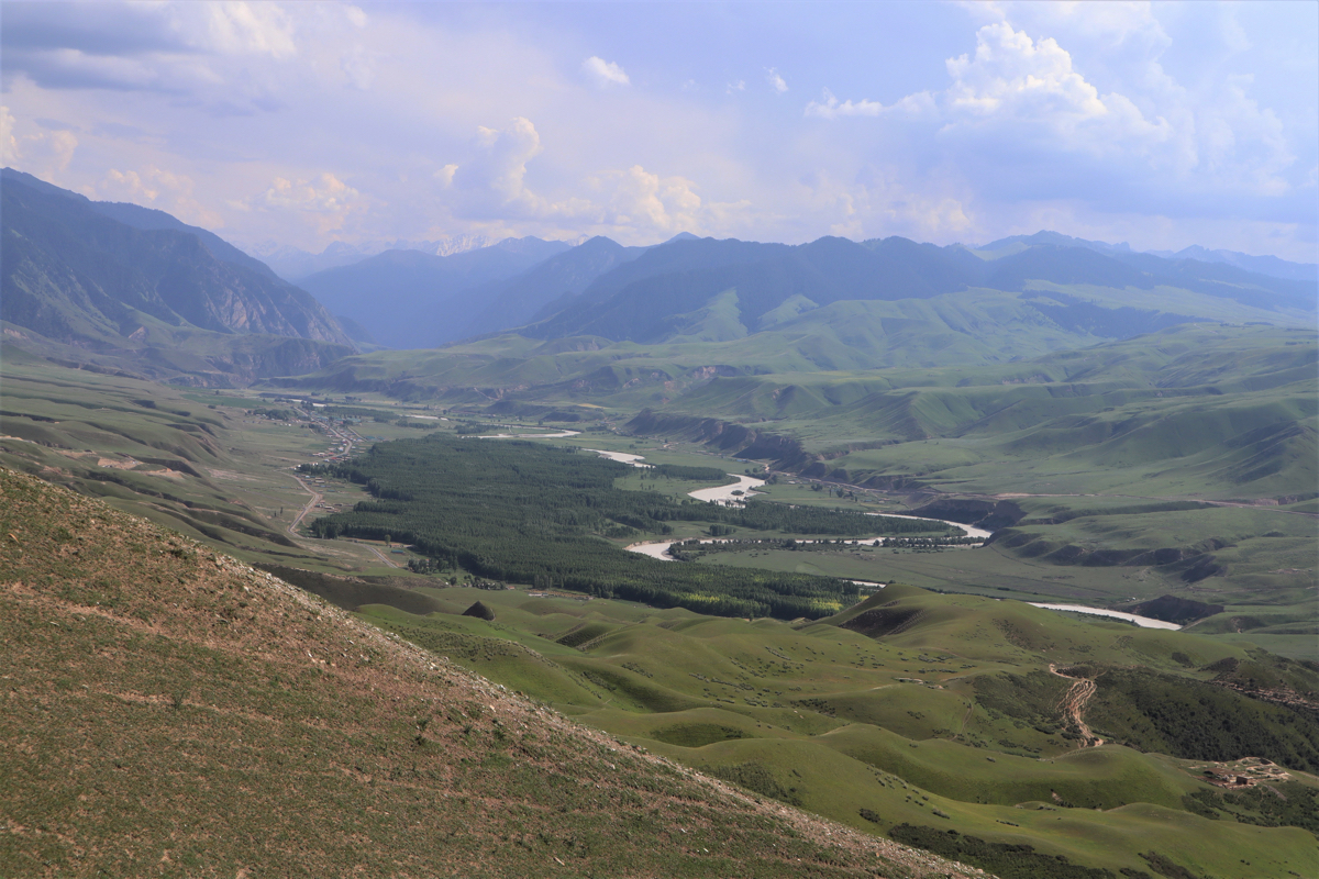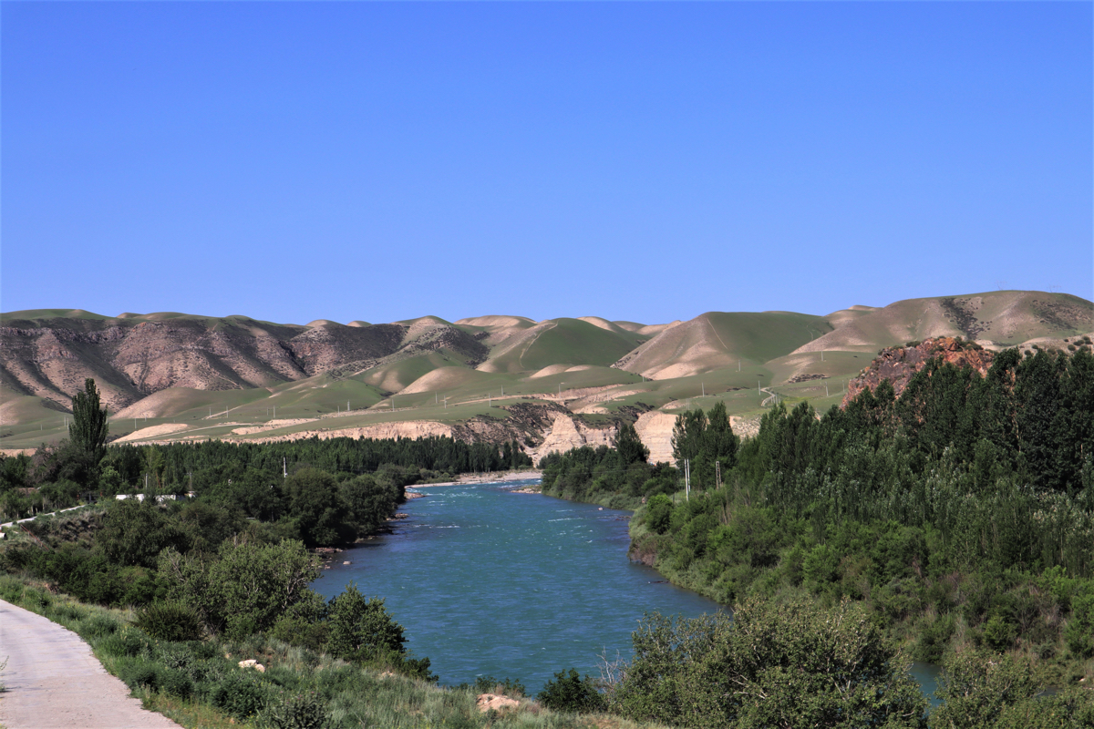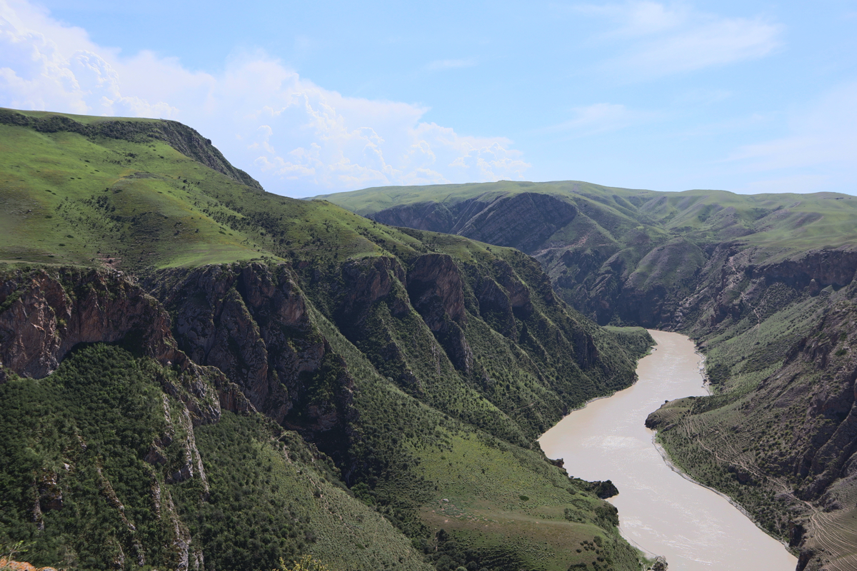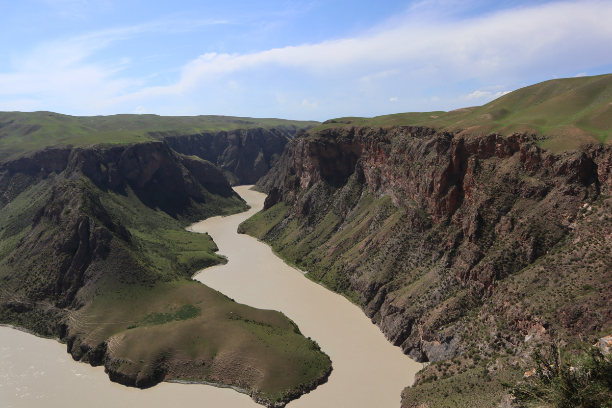 新疆の伊犁八卦城徳克斯県の八卦(パクア、はっけ)城から15㎞のところに喀拉峻(カラジュン)と濶克蘇(コクソ)がある。濶克蘇は喀拉峻草原に隣接し、中天山から流れる水が谷を刻みつくられた雄大な峡谷である。峡谷の最も深い谷は谷底からの高さが360mあり喀拉峻大草原の大地を曲がりくねりながら絶景の深い谷が続く。夏には天山の雪が解け炭酸カルシュウムを含む地層を削り濶克蘇河の水が乳白色に変わる。濶克蘇大峡谷を象徴する風景は鰐湾と呼ぶ濶克蘇河が360度、逆向きに流れを変えるところにせり出した鰐のような姿の山と川の風景である。まるで鰐(ワニ)が水を飲んでいるような姿なので鰐湾と呼ばれている。大峡谷が緑の大地を縫いクネクネと乳白色の水がながれる様はまるで大蛇が草原を行くようでもある。濶克蘇に「九曲十八湾」と呼ばれるところがある。南北5.6㎞、東西2㎞の谷を何度も曲がりながら天山からの雪解け水が流れている。五色の花が咲く波打つ大草原と濶克蘇河の大峡谷、乳白色の水のながれ、見事なまでの自然の造形である。