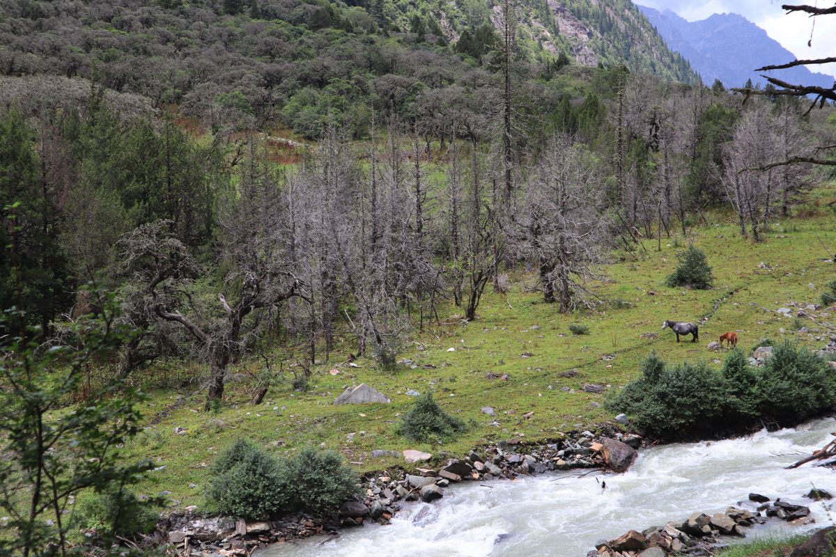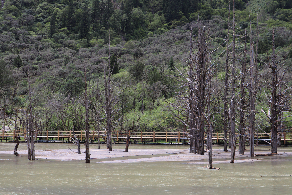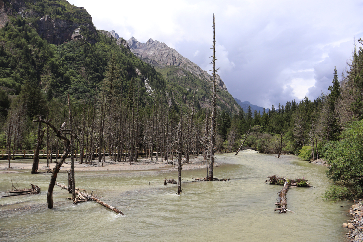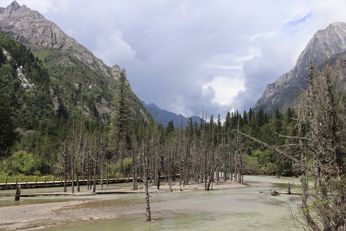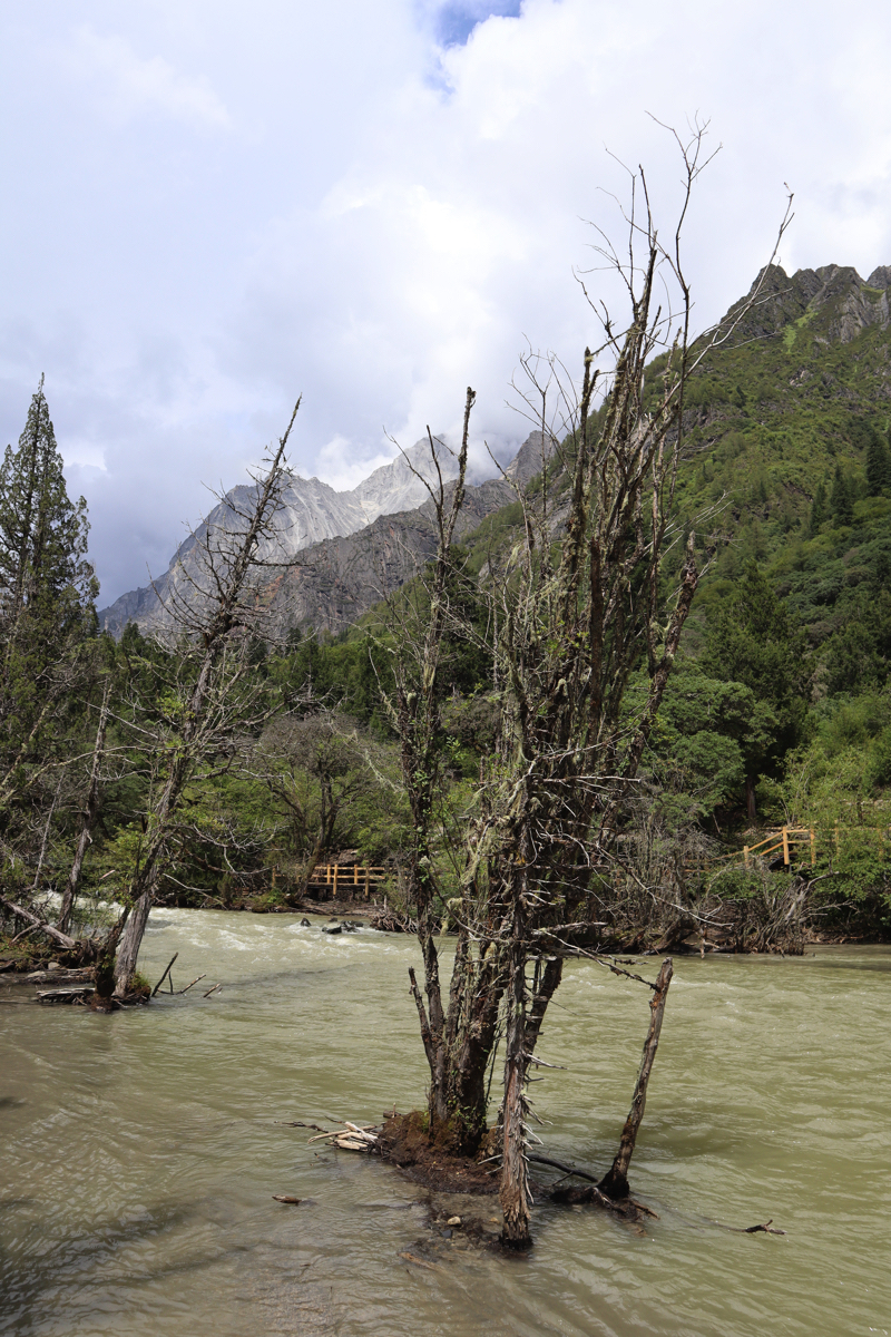 長坪溝は29㎞の峡谷で四姑娘山を見上げながらどこまでも峡谷が続いている。途中、峡谷沿いの道の正面に四姑娘山最高峰の一峰の華麗な姿を見ることができる。美しい山塊を見上げながら進めば2時間半ほどで枯樹灘に着く。白い砂と清らかな流れの中に枯れ木が点在する。見上げれば四姑娘山が見え、上高地の唐沢池から見る穂高のようでもある。長坪溝はかなりの距離まで整備された遊歩道が続き、高低差もそれほどはなく一般の人も歩きやすい道である。