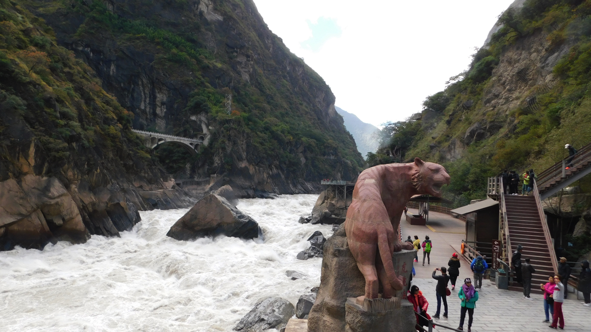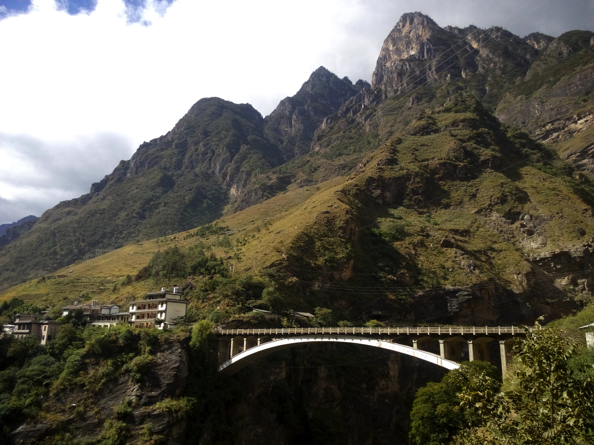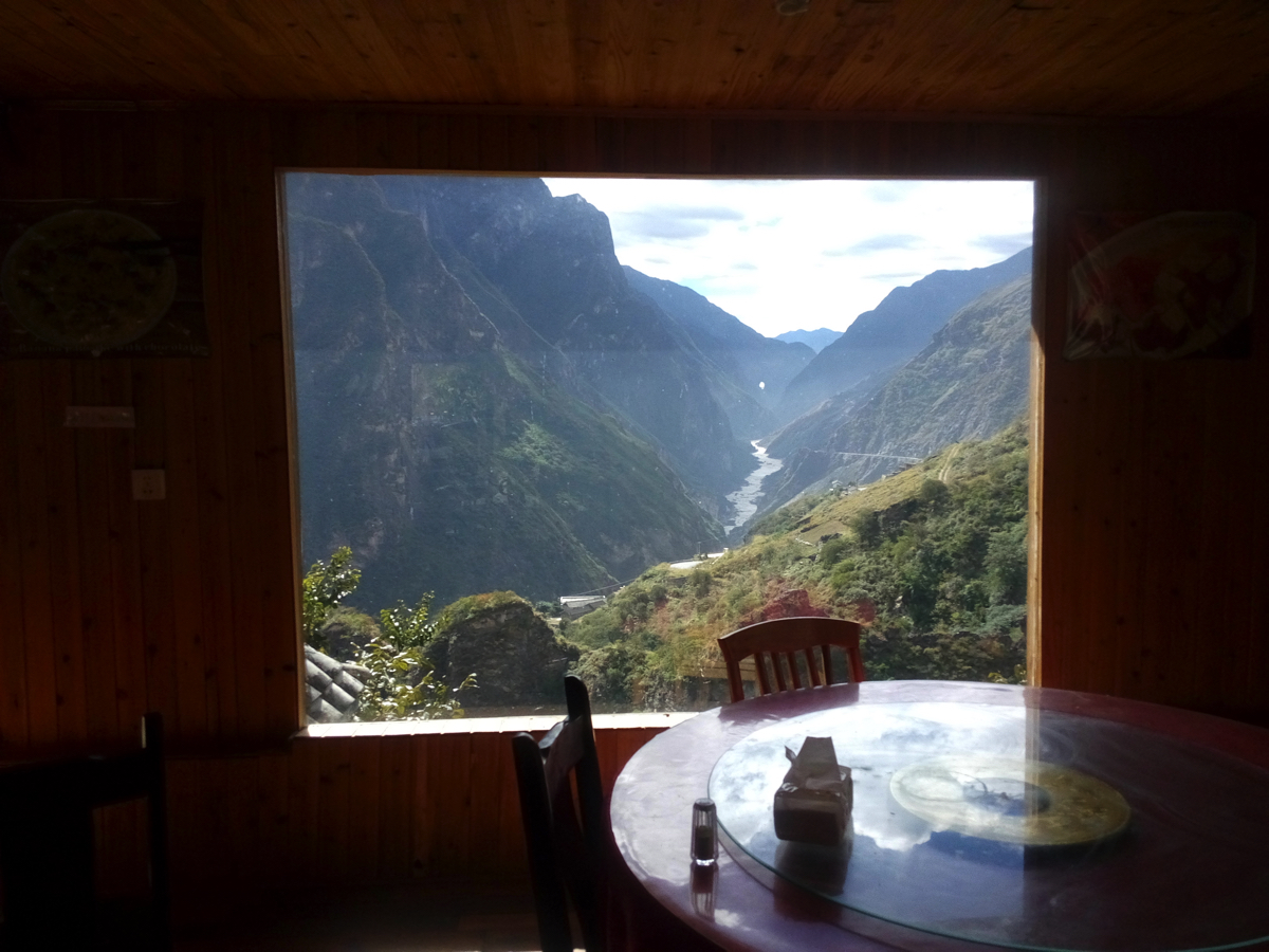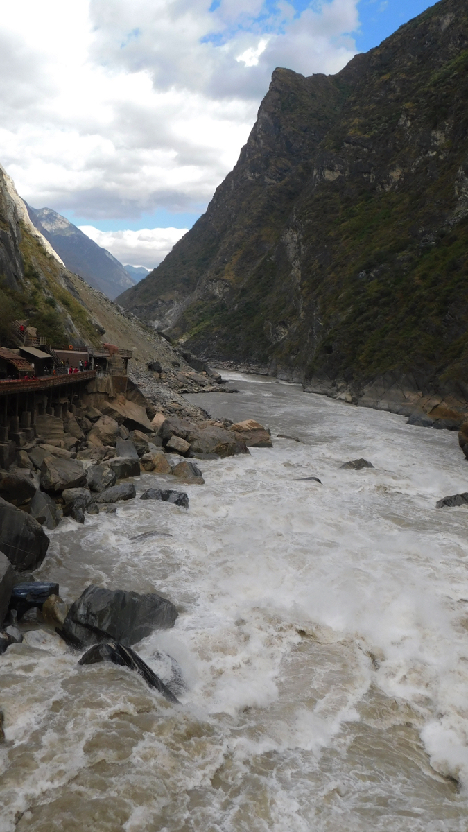 その旅は古城の街、麗(リ)江の北に聳える標高5,596mの玉龍雪山の北壁を見ながら始まった。しばし激流の渓谷、長江(揚子江)の上流域である金沙江にある虎跳峡を訪れる。雨が少ない時期で流れはまだ穏やかだったが、それでも急流で、中国でも有数の渓谷美を誇る。虎跳峡を過ぎ峡谷をはるか下に見下ろす崖路を走ると峠に少数民族が営むおしゃれな民宿とレストランがあった。レストランで昼食を食べながら窓から景色を見ると、一筋の帯のようにどこまでも虎跳渓が続いている。