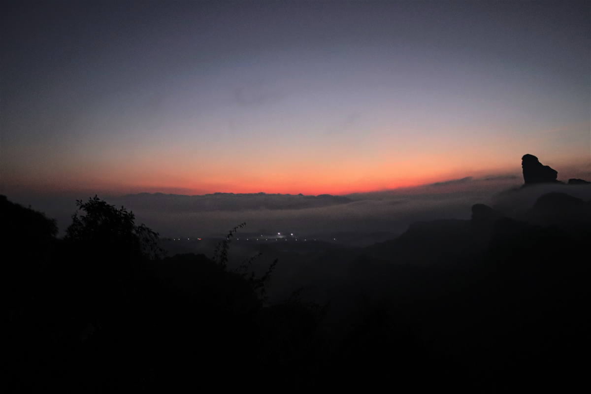 世界には丹霞(タンシャ)と呼ばれる地形が千以上あるという。そのなかでも広東省の丹霞山は地質学上の種類も豊富でその象徴のような場所で、“丹霞山”とそのままの名で呼ばれる。山に登り日の出と雲海、そして雲の海に浮かぶ岩峰を見たいと思い丹霞山を訪れた。朝早くまっ暗な中を民宿を出発した。どこまで歩くのかと心配しながら歩いていると1台の車が止まりロープウェイの駅まで乗せてあげるよと声をかけてくれた。この村に勤める若いお医者さんだった。始発のロープウェイに乗ったが、何組か大きなカメラを持つ人達がいた。地元の人達でいつも丹霞山の日の出を撮りにきている人のようである。ロープウェイを降りるとグループは散り散りになった。夫々お気に入りの私の撮影スポットがあるようだ。