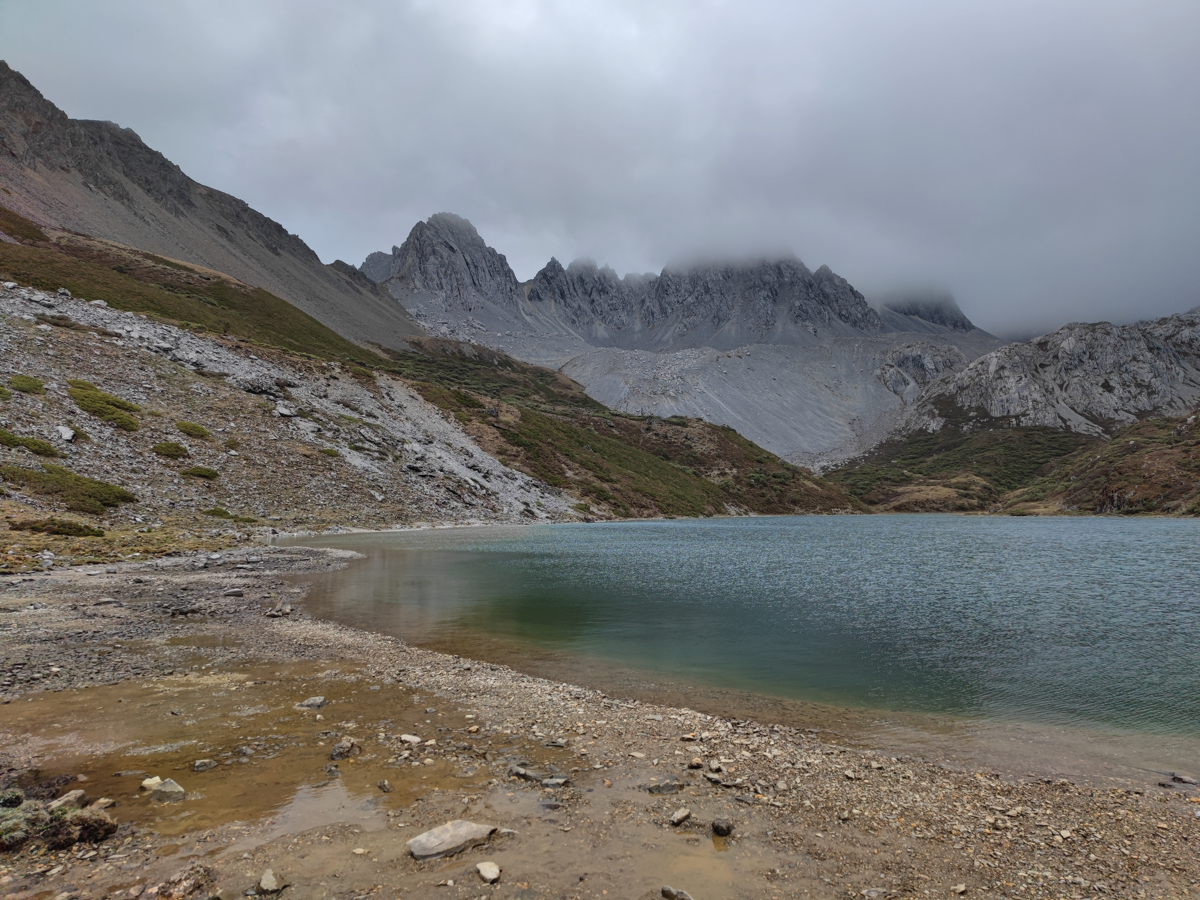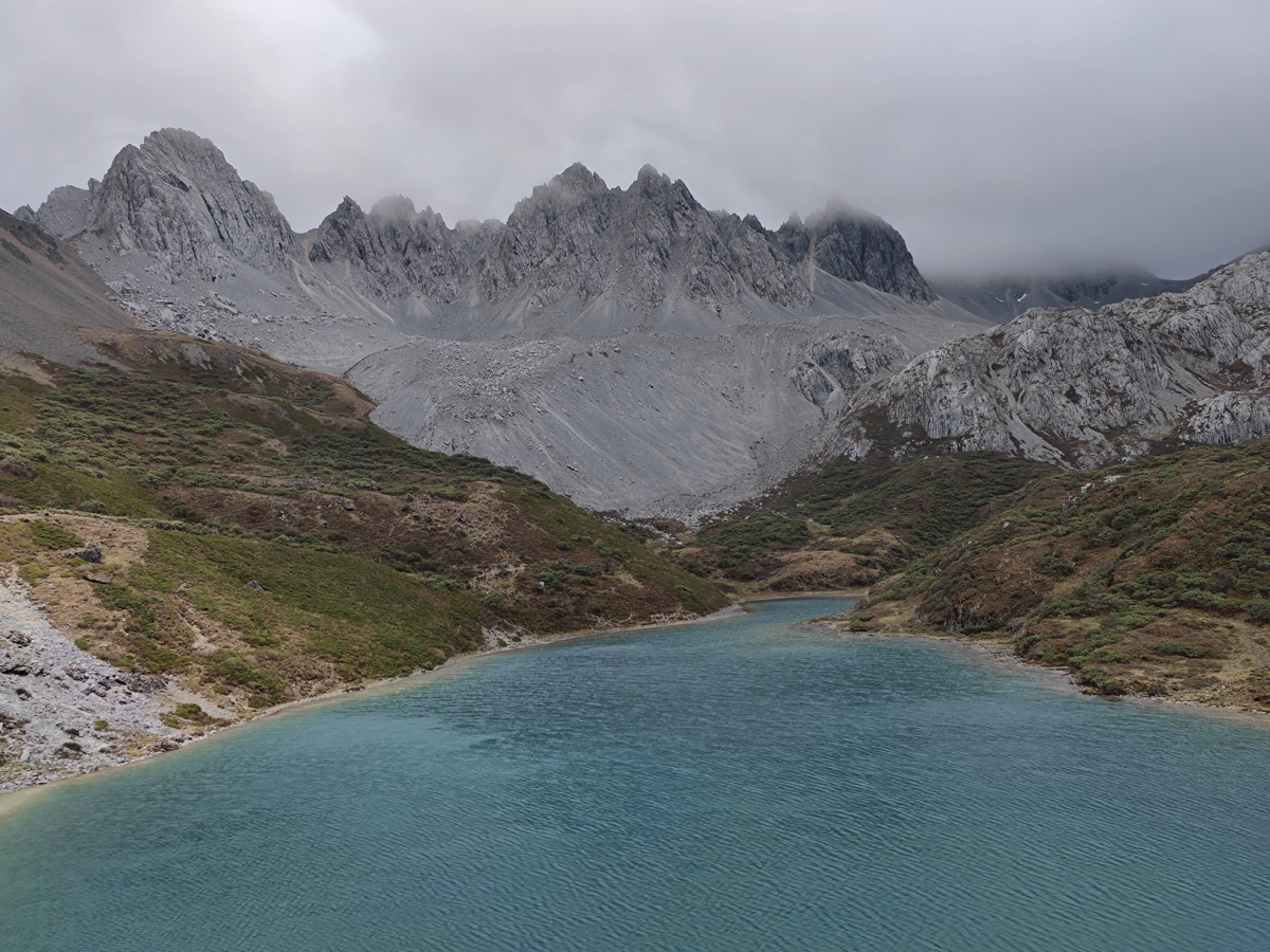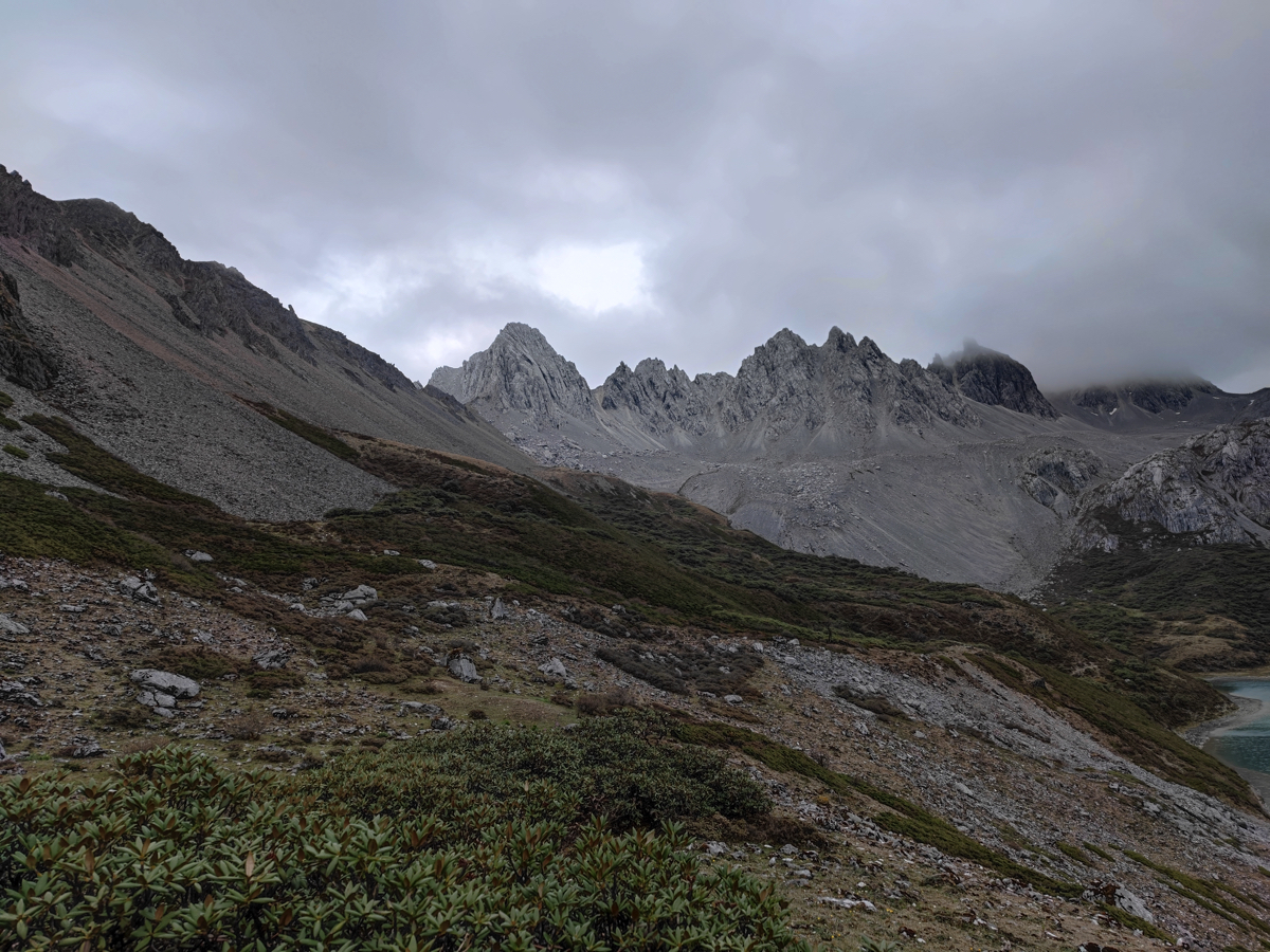 阿布吉措登山口の麓の牧場の標高は3,400~3,500m、阿布吉措(湖)付近は4,200~4,300mなので高低差は800mほど。休憩時間も入れて往復6時間ほどで行ける。登山口の牧場の正面には屏風のような岩山が立ちはだかる。登山道はそれを右手に見ながら登り、しばらく樹林帯の急な登山道が続き、そこを登りきると視界が開け、草原のようなところに着く。しばらく休みさらに進むと、岩山の風景に変わり、眼前に巨大な絶壁が迫る。左右の岩山の間に壮大な阿布吉措周辺の峰が姿を表わす。まるで開演の幕が開いて正面に華やかな舞台が見えた時のような、感動的な眺めだった。