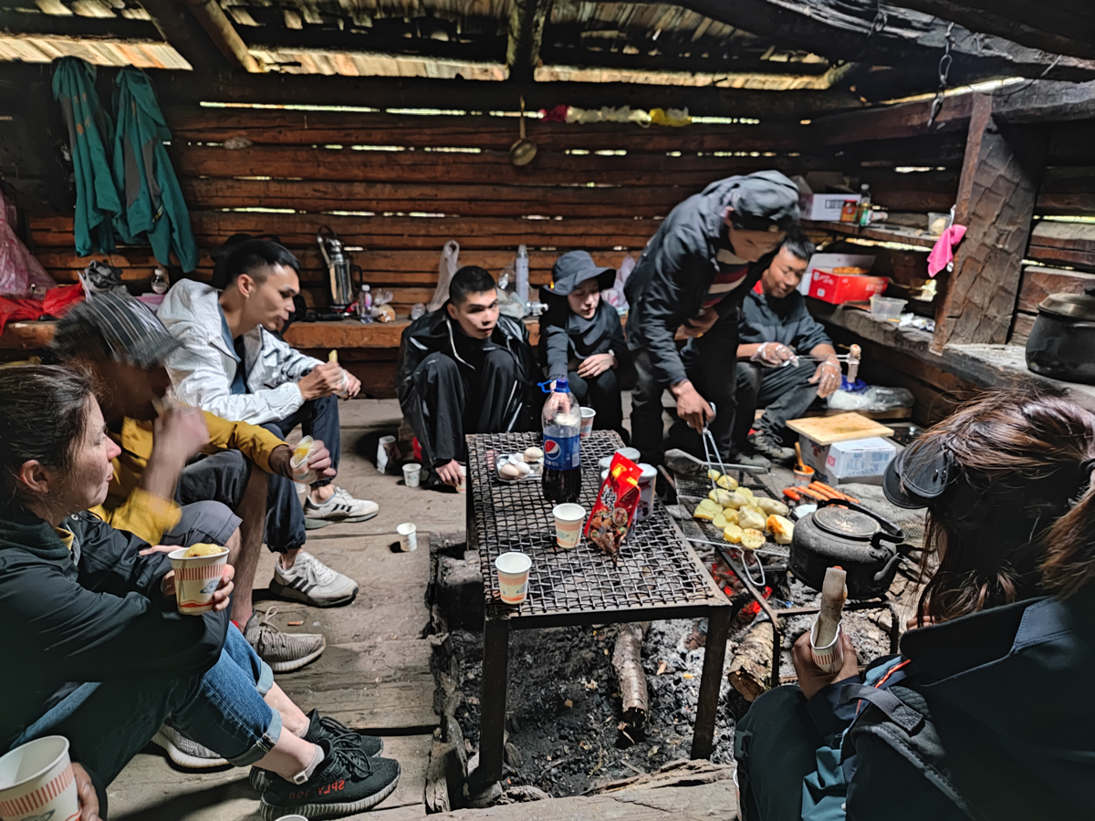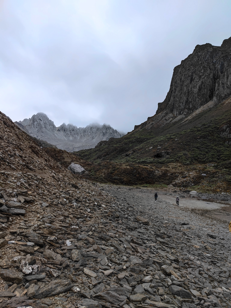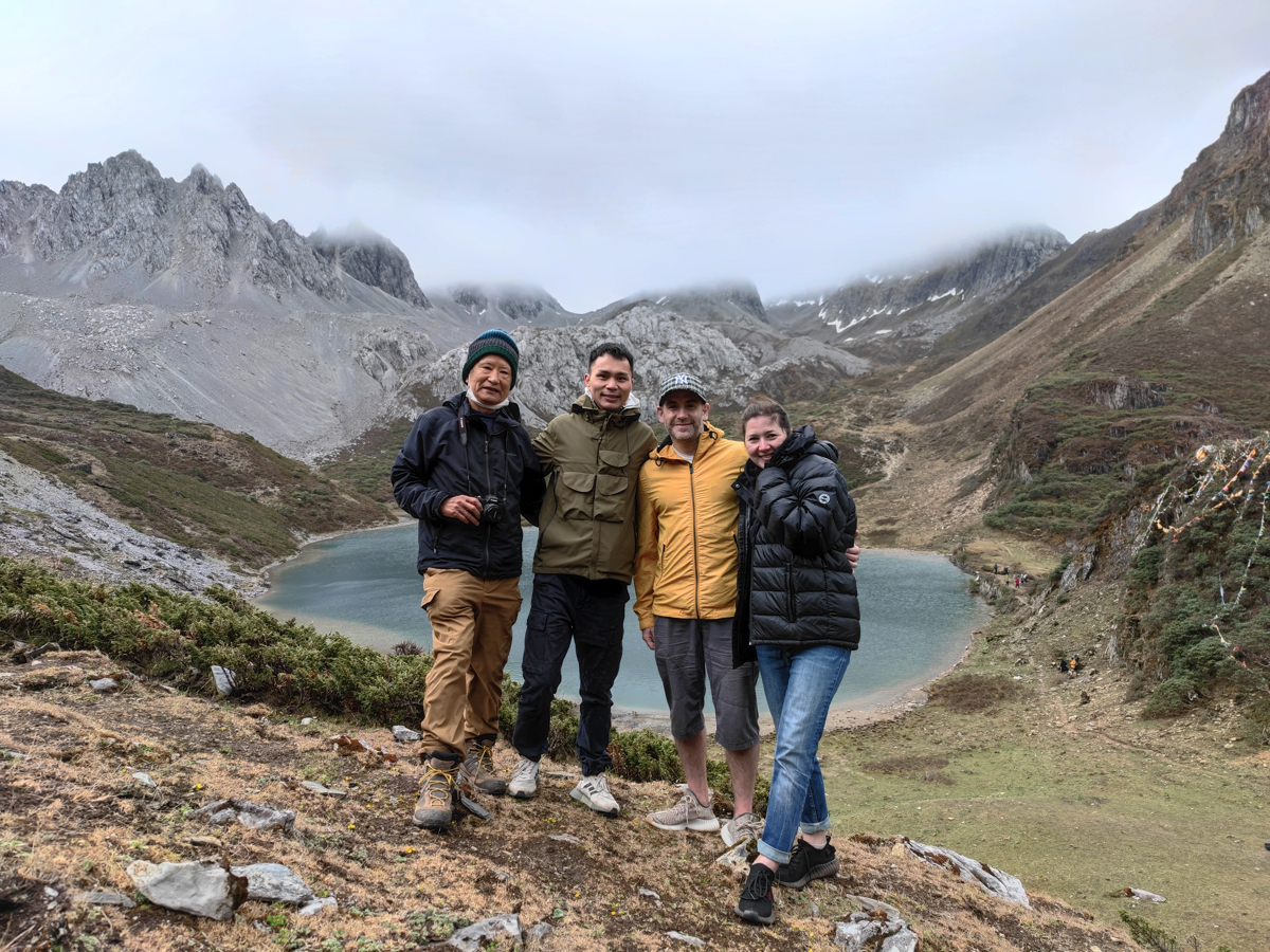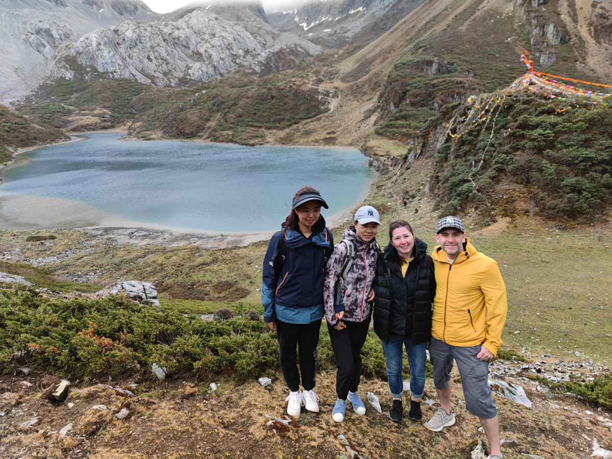 阿布吉措登山口の麓の牧場の標高は3,400~3,500m、阿布吉措(湖)付近は4,200~4,300mなので高低差は800mほど。休憩時間も入れて往復6時間ほどで行ける。登山口の牧場の正面には屏風のような岩山が立ちはだかる。登山道はそれを右手に見ながら登り、しばらく樹林帯の急な登山道が続き、そこを登りきると視界が開け、草原のようなところに着く。しばらく休みさらに進むと、岩山の風景に変わり、眼前に巨大な絶壁が迫る。左右の岩山の間に壮大な阿布吉措周辺の峰が姿を表わす。まるで開演の幕が開いて正面に華やかな舞台が見えた時のような、感動的な眺めだった。