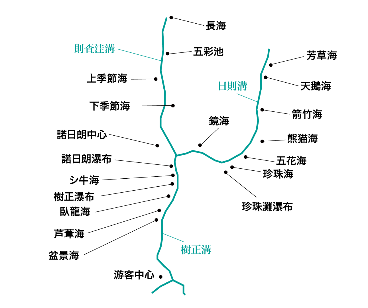 九寨溝には、一般的な観光コースではない場所にもすばらしいところがある。なかでも黒海、チベット語では措拉は海抜5,000mにある小さな湖だが、中央は水深が深く黒く輝き、周辺部は浅いため緑色をしているという。真冬は真っ白な雪に浮かぶ黒真珠のようになり、チベット族はそこで雨ごいをするという。黒海に行くには九寨溝景区内の村からでも二日間必要という。