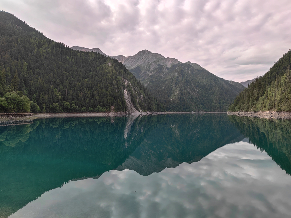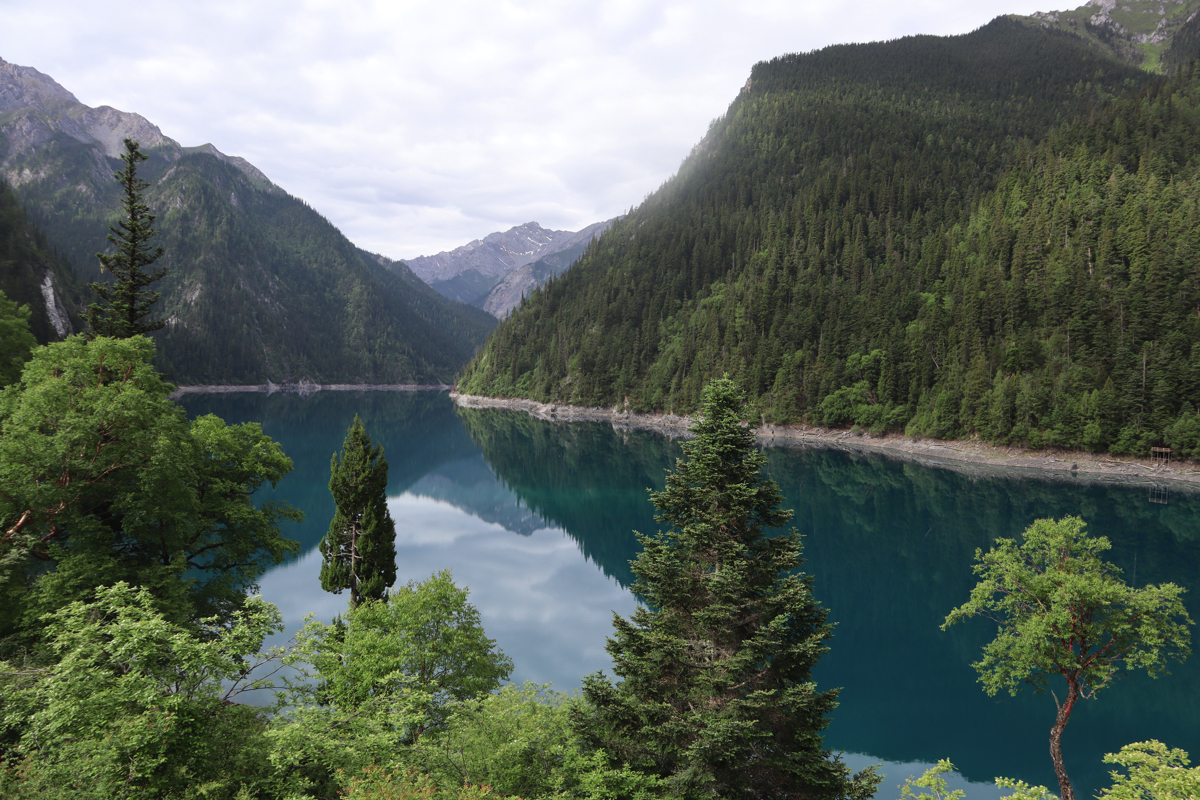 五彩池の透き通ったブルーと翡翠のような緑の水、九塞溝はまさにチベットの愛によって生まれた神の世界の造形だった。鏡のような湖面に倒木が浮かび、その木の上に、華道の心得ある人が植えたかのように草木が茂っている。