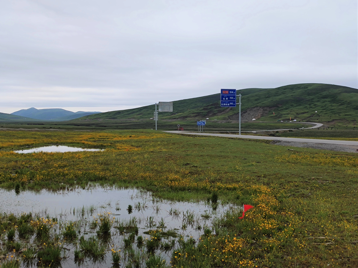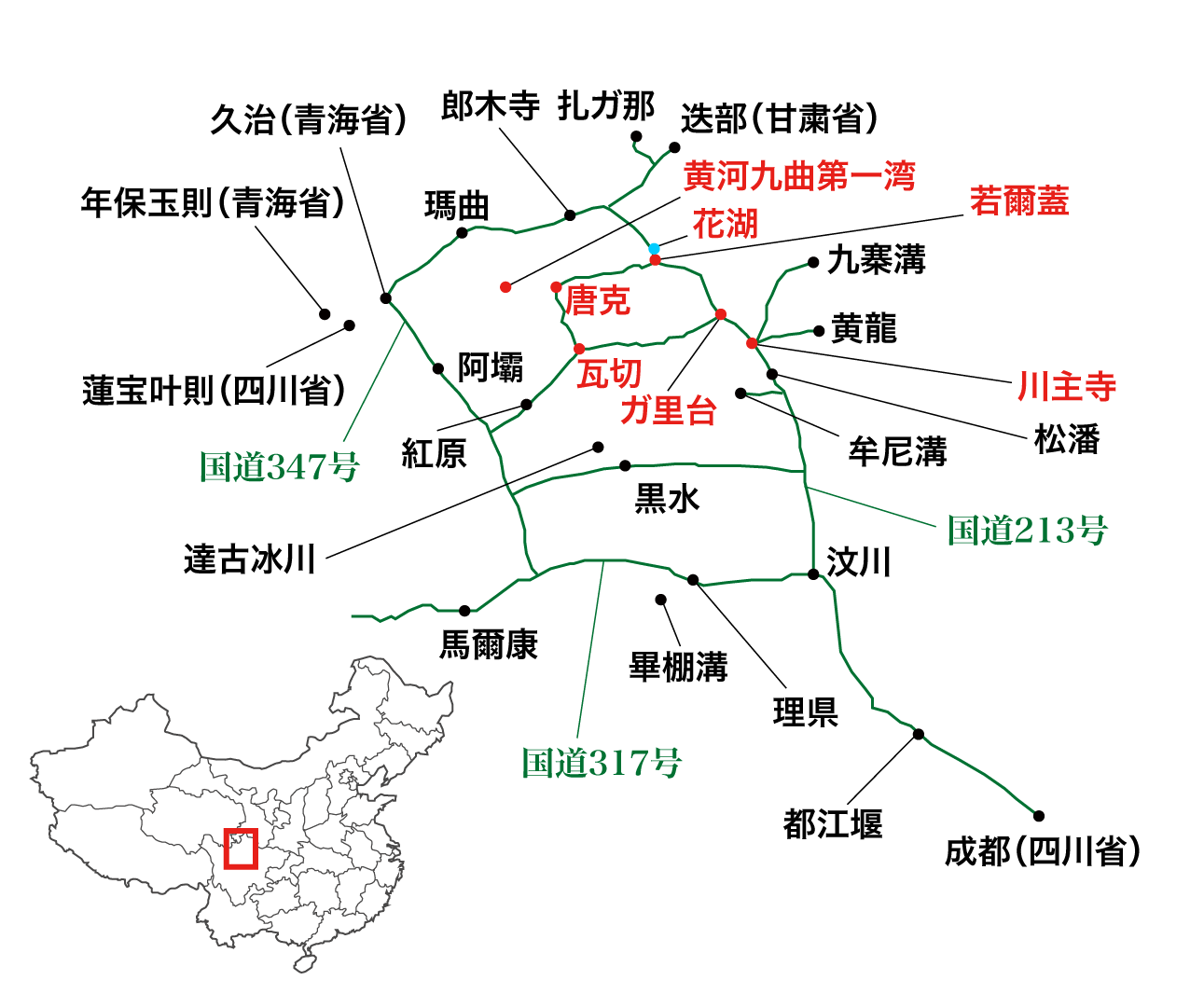 九寨溝から川主寺に戻り、そこから北に向かい甘粛省の南、甘南の扎ガ那(zhaganaヅァガナ)を目指すが、途中で国道213号のガ里台を西に向かい、黄河九曲第一湾と花湖を訪ねた。ガ里台から紅原大草原を進む。行路の海抜は3,500m前後で高原の道路を走る。