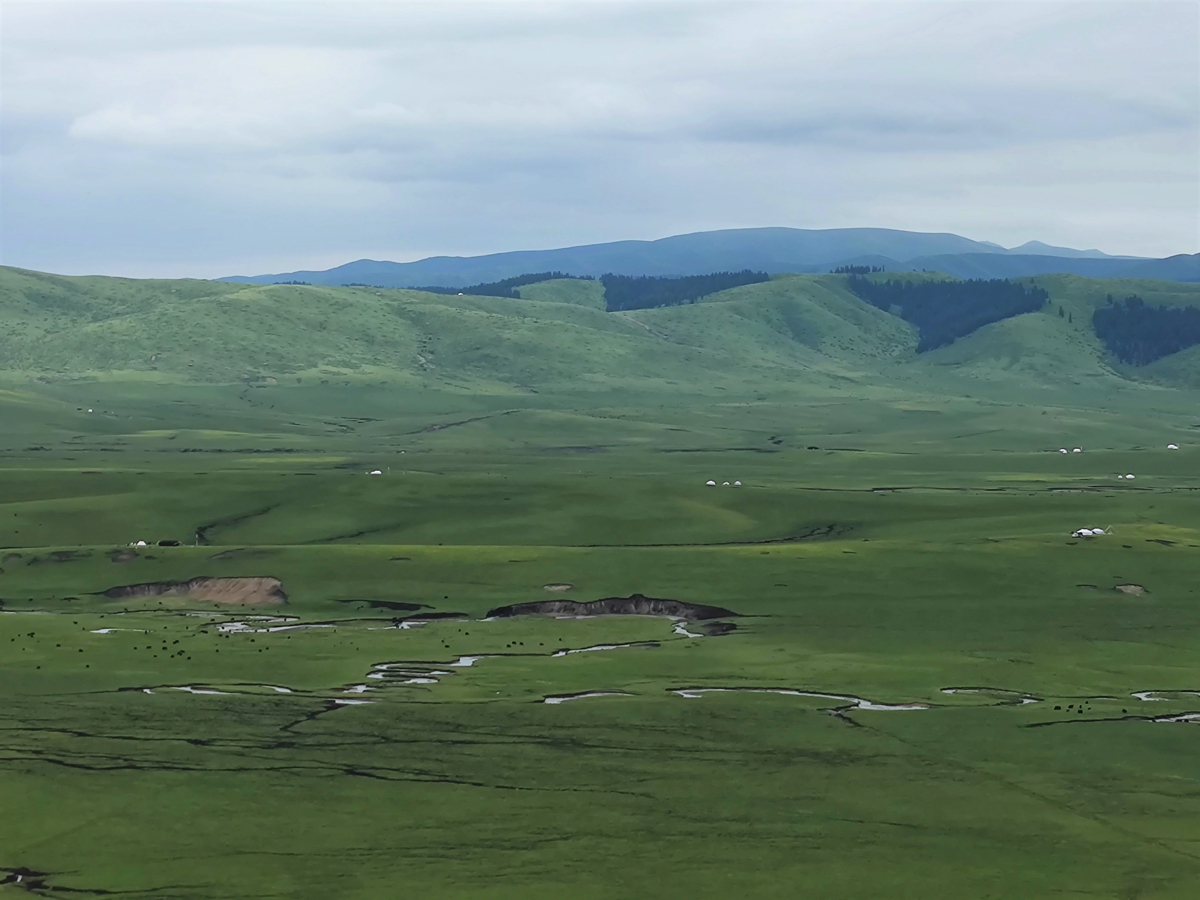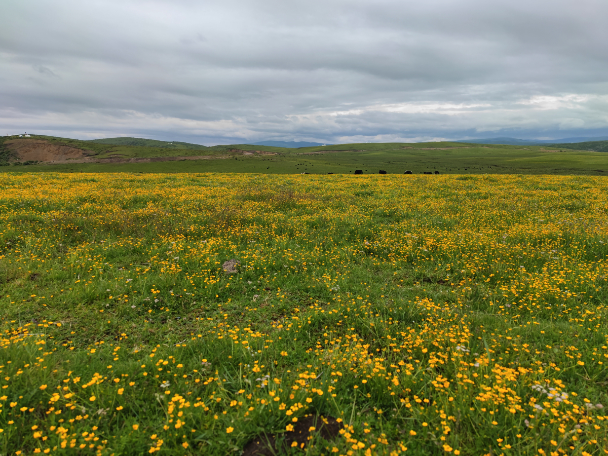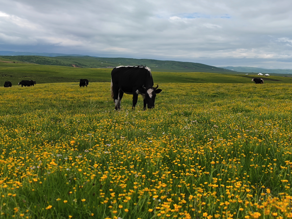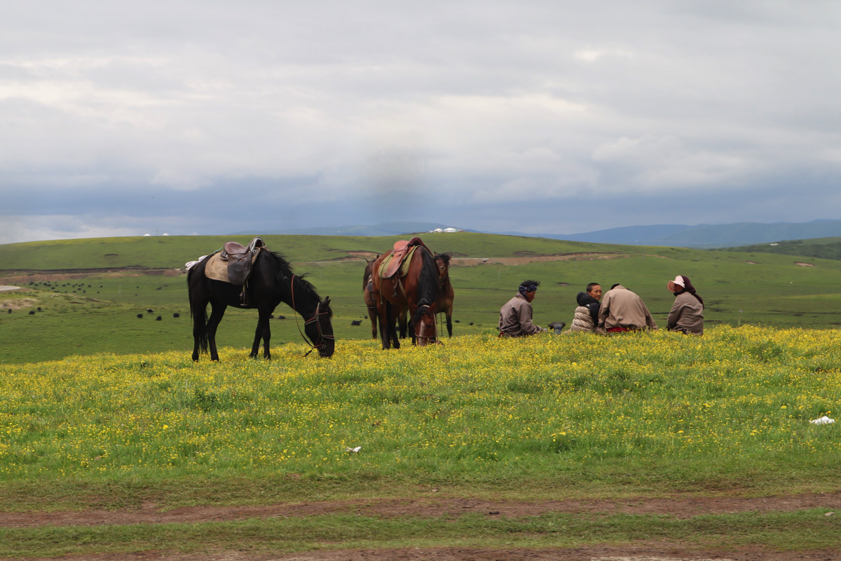 紅原大草原はおよそ3万㎢あり黄河九曲第一湾まで、一日近く、大草原の道を行くことになる。紅原草原は花の時期には少し早かったが、一部は咲き初めところどころ黄色くなっていた。草原でチベット族の親子が馬と一緒に休んでいる。そこでは時間はゆっくりとながれていた。