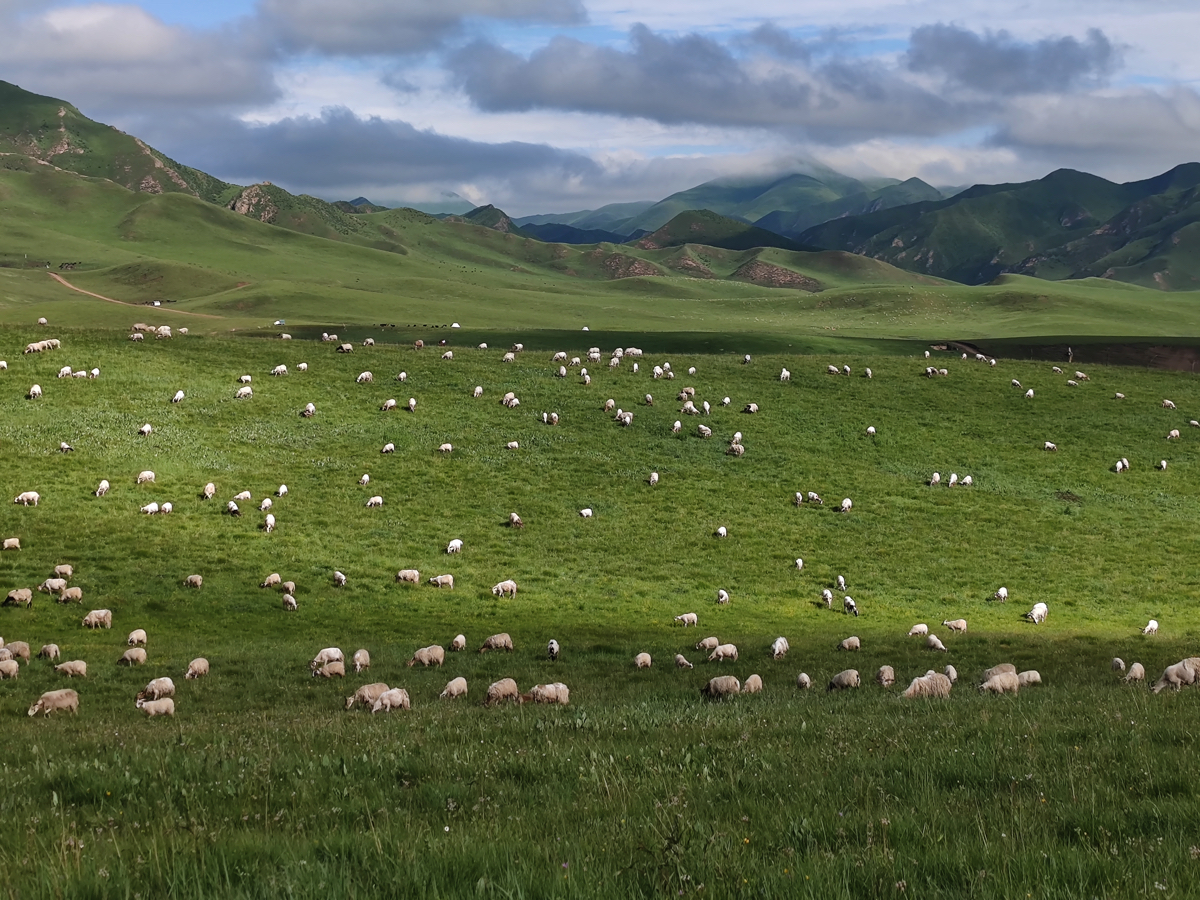 緑の草原、一面に羊が放牧され、緑色のキャンパスの中に規則的に白い点のように羊が群れている。その向こうには素晴らしい景観の山が連なる。草原の向こうにまるで懐かしい映画のシーンのように小さな集落が見えている。“草原情歌”の歌声が聞こえてきそうな風景である。