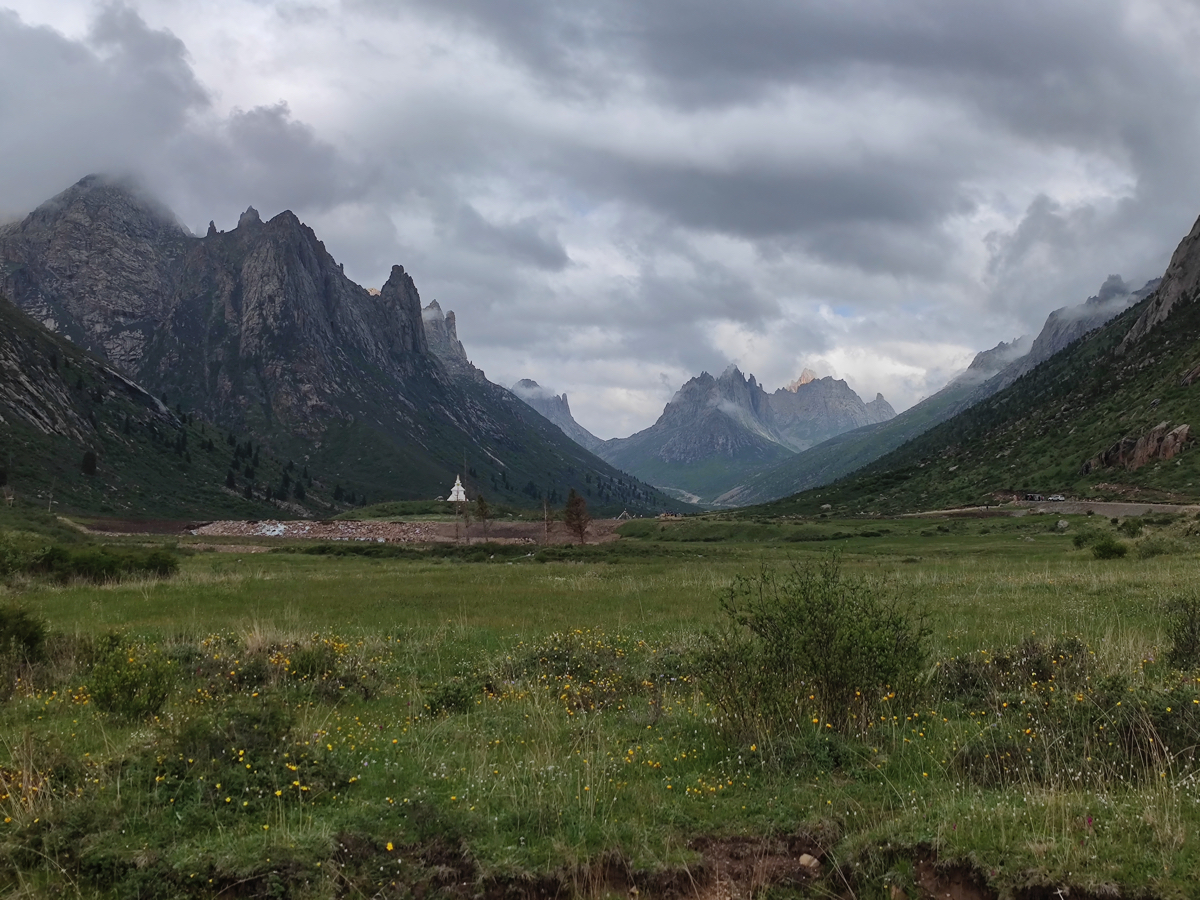 どこかで西蔵仏教の何人かの僧侶があずき色のラマ服を着て、湖の畔を歩く写真を見た。湖の向こうには不思議な存在感がある雪の岩山と花と緑の草原が映っていた。まるで来世の仏の世界を表わしたような写真で、地名には年保玉則(nianbaoyuze)とあった。どこにあるのかと調べると青海省で、甘粛省の蘭州から入るのが近い。だがそれでもかなりの距離がある。いつか行きたいと夢に描いていた。そして四川省の阿壩藏族羌(チャン)族自治州に行くなら青海省にも入り年保玉則に行こうと思った。だが、年保玉則は現在、環境保護のため立ち入り禁止区域になっている。年保玉則と同じ巴顔喀拉(パヤンカラ)山脈の四川省側の連宝叶則(lianbaoyeze)なら開放されていて行くことができるということで、連宝叶則に向かった。景区に入りしばらく車で走ると正面に不思議な存在感がある岩山が見えてきた。異次元の別世界、まるで来世の仏の世界に足を踏み入れるような不思議な感覚になる。