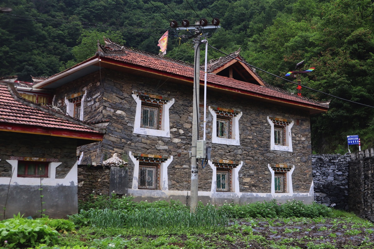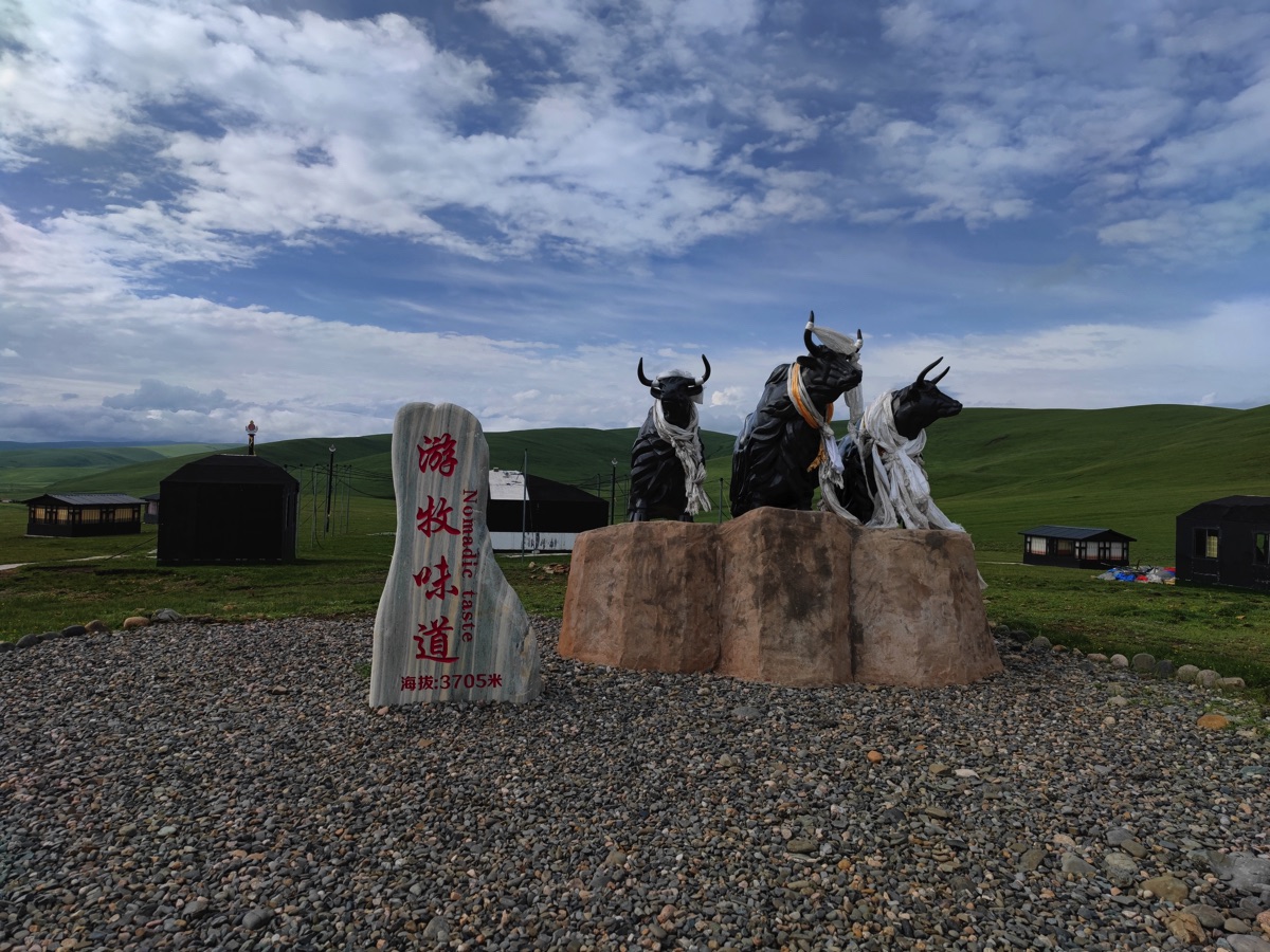 蓮宝叶則がある四川省阿壩県の阿壩の街から華棚溝に向かい、途中、達古氷河に寄るため、麓の黒水に向かった。阿壩の街は標高3,290m、黒水は2,350mであるが、途中で標高3,700m近い峠を越える。阿壩を出てしばらく行くと神仙が住むという“神座”村の近くを通る。寄ってみたかったが時間の都合で行けなかった。神座は戸数60戸ほどのチベット族が暮らす村で、茶色い壁の独特な住居が立ち並ぶ。チベット族の古い諺で“神座の娘、ラムダの酸菜(発酵させた白菜の漬物)、蒙古のザンバ(裸麦をバターでこねたチベット族の主食)”と言われる。神座、神くらの名のとおり神に仕える娘さんがいるのかも知れないと思いながら村の近くを通った。峠への途中、草原の真っただ中に“遊牧味道”の文字と三頭の牛のレリーフがあった。牛肉のバーベキューなどを食べさせてくれるのだろう。思わず食べたくなるレリーフだった。黒水の街の近くでは道路沿いに色とりどりのチベット風の美しい民宿が立ち並んでいる。